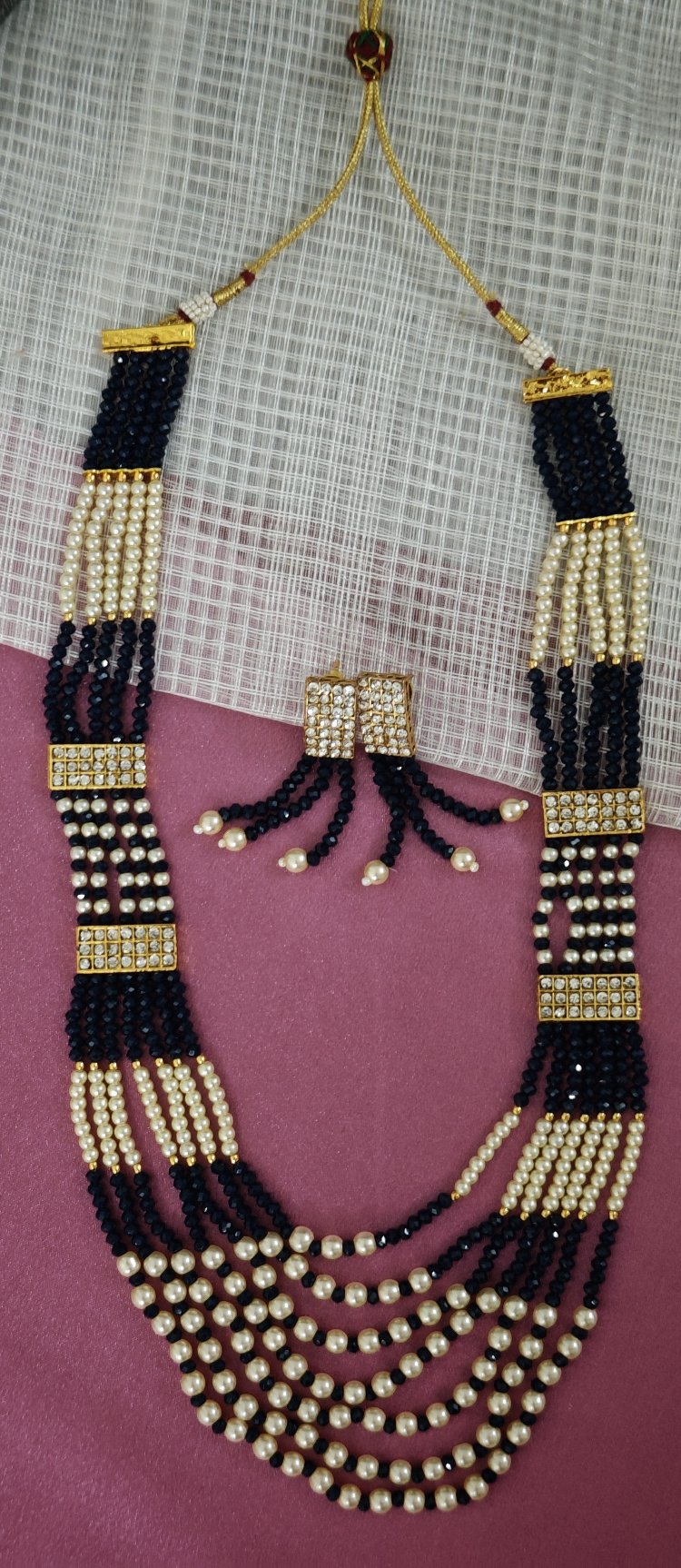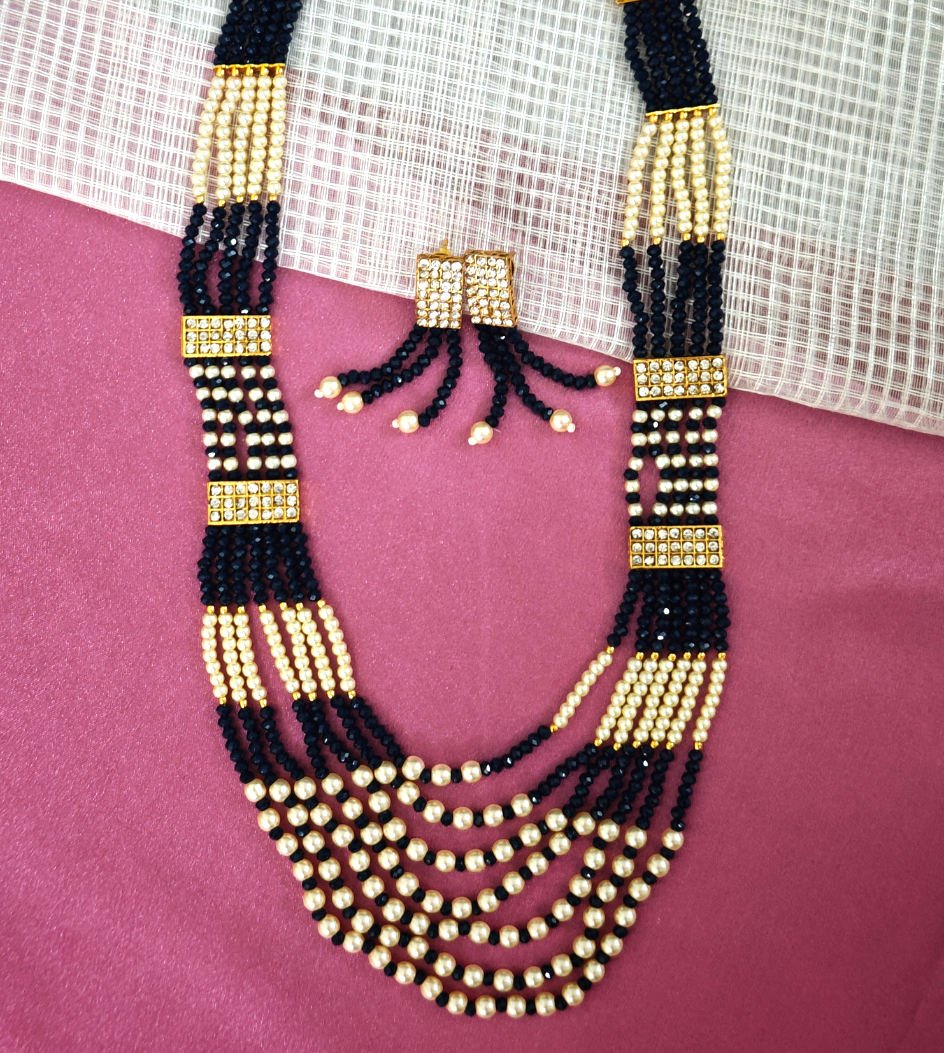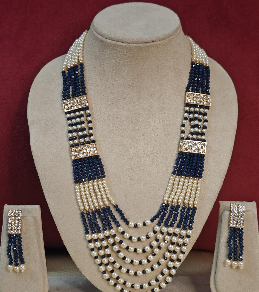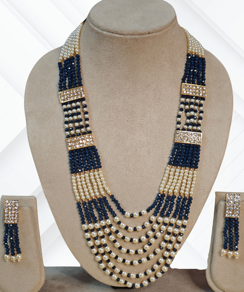 This long mala jewellery set adorned with lustrous pearl beads. The carefully crafted kundan stones and colourful embellishments make it look captivating, sure to get lots of attention and compliments.