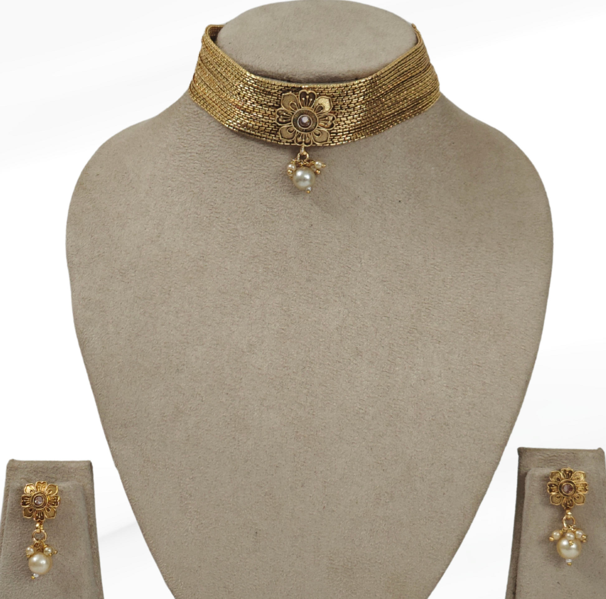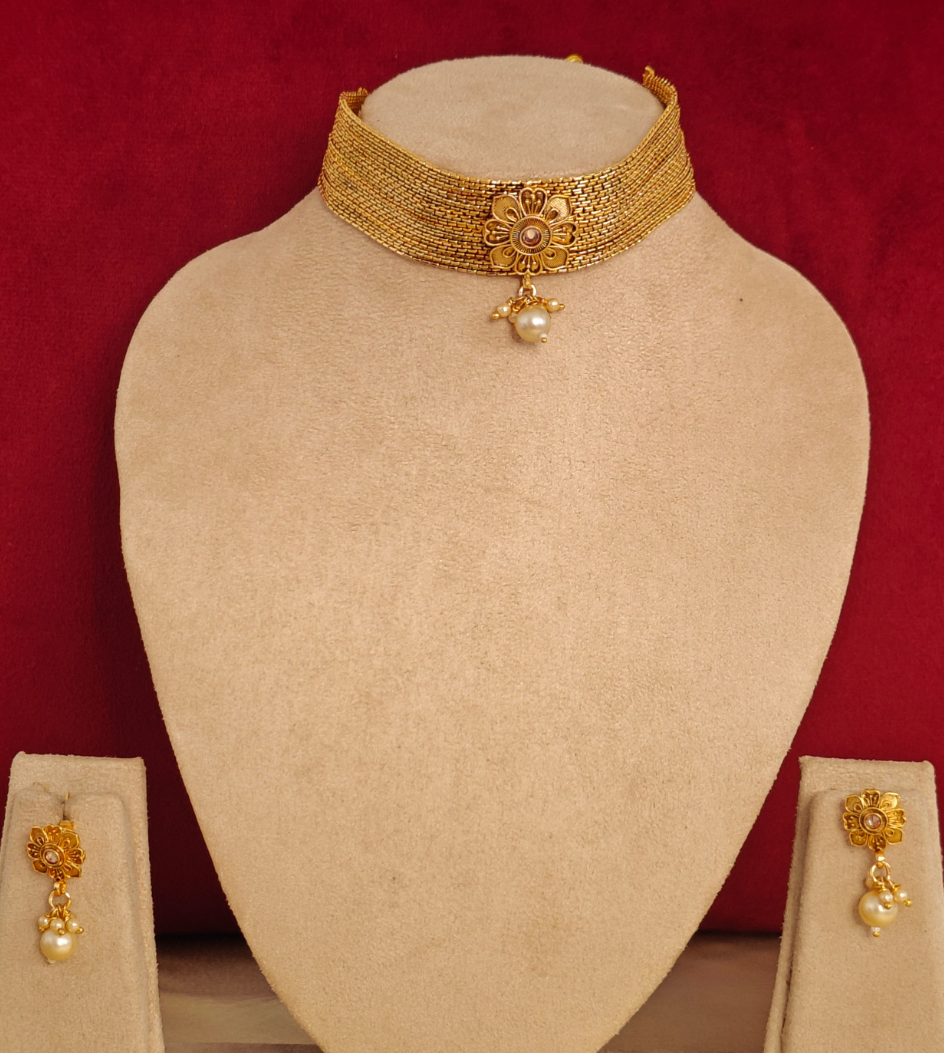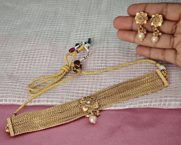 Excited to beautify your neckline with a radiant touch? Consider completing your ensemble with our choker temple jewellery set. Designed to enhance the look of your attire, especially sarees, it showcases a blend of tradition and elegance, adding a special charm to your personality.