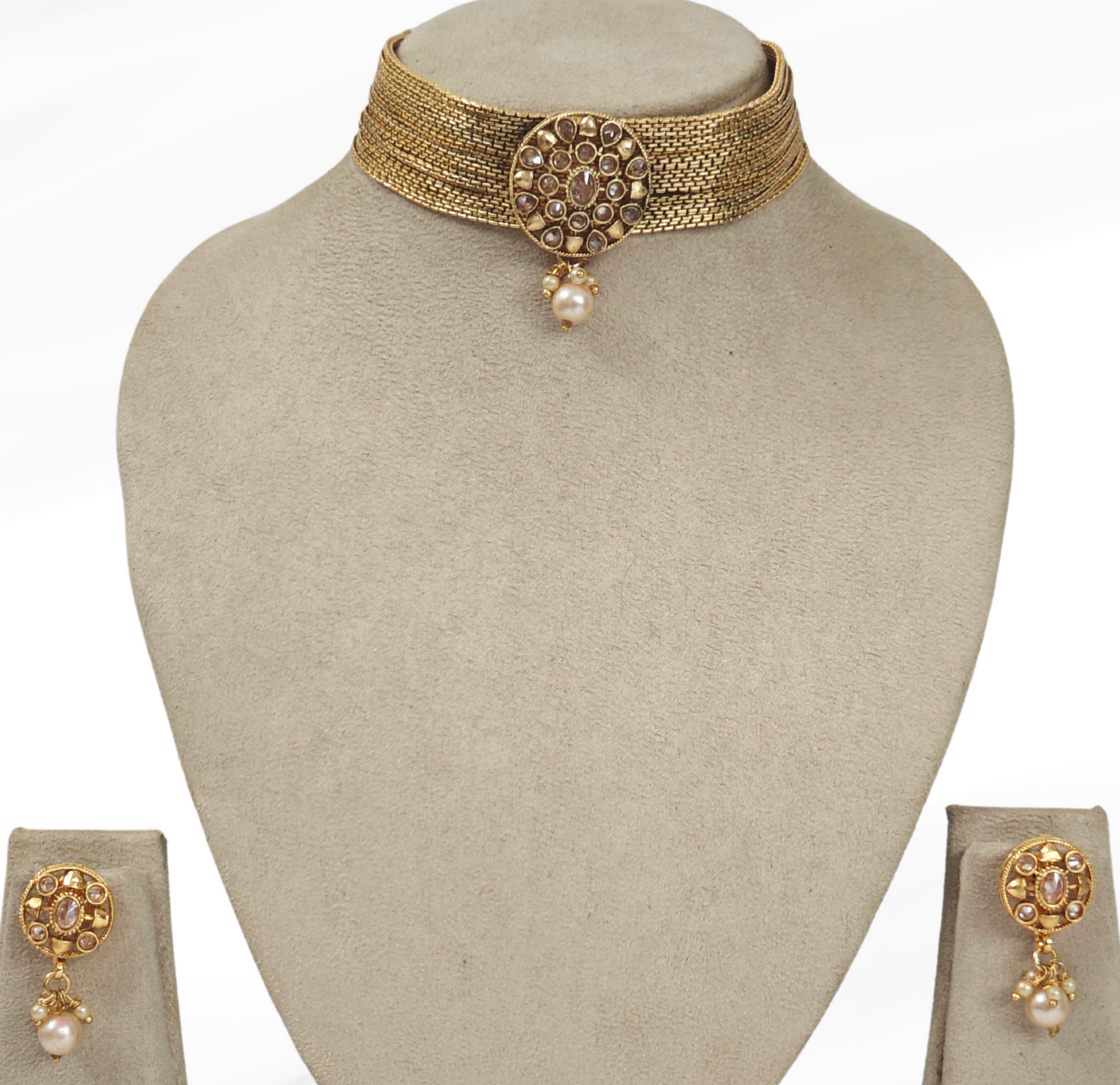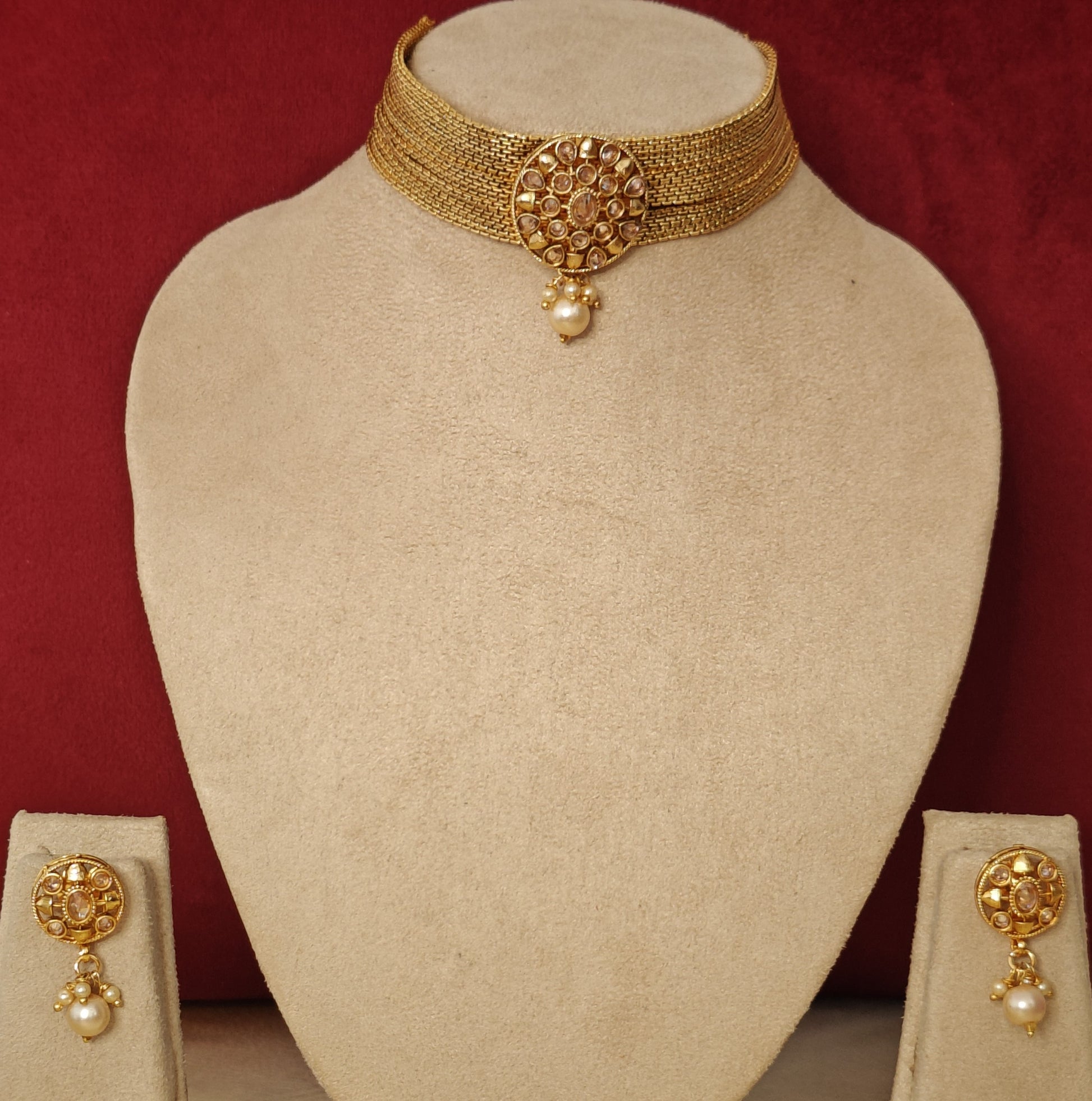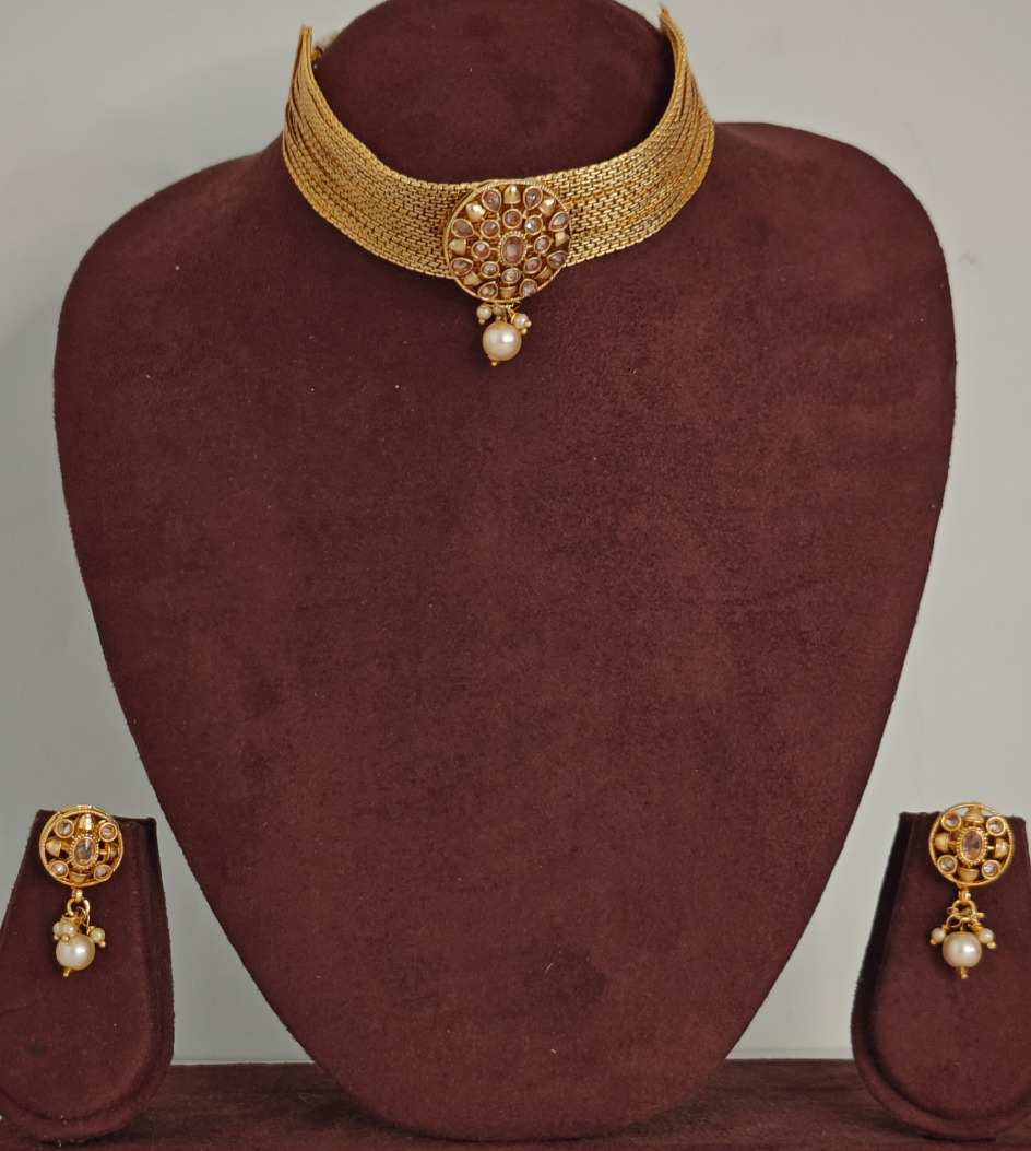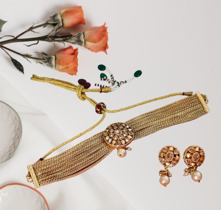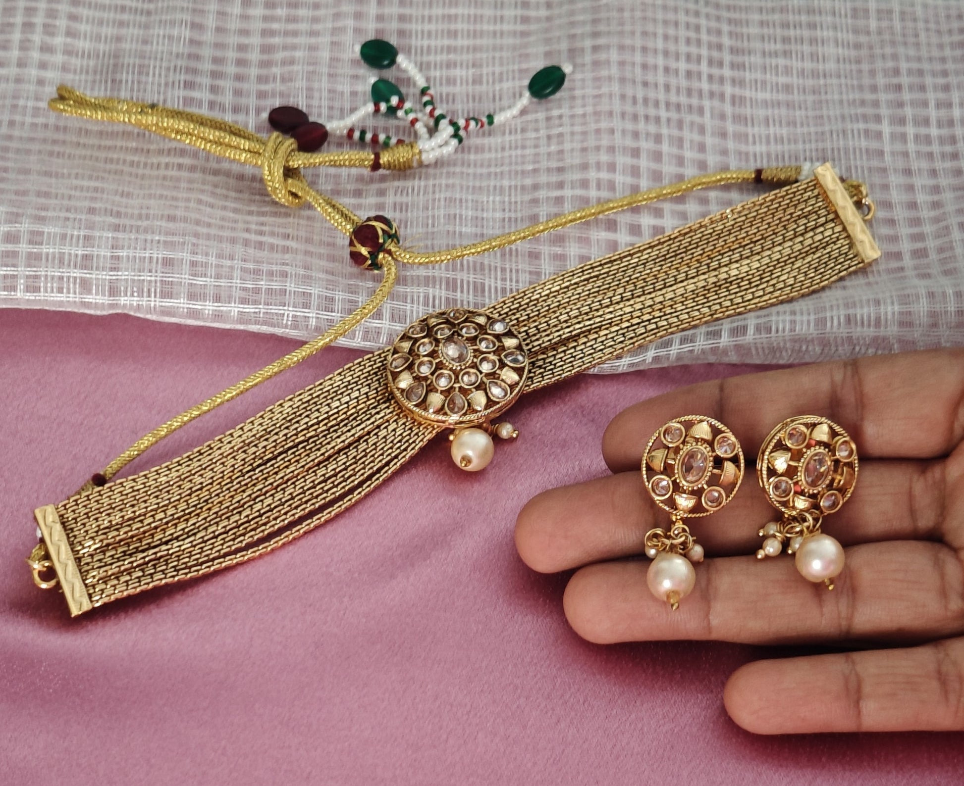 Excited to beautify your neckline with a radiant touch? Consider completing your ensemble with our choker temple jewellery set. Designed to enhance the look of your attire, especially sarees, it showcases a blend of tradition and elegance, adding a special charm to your personality.