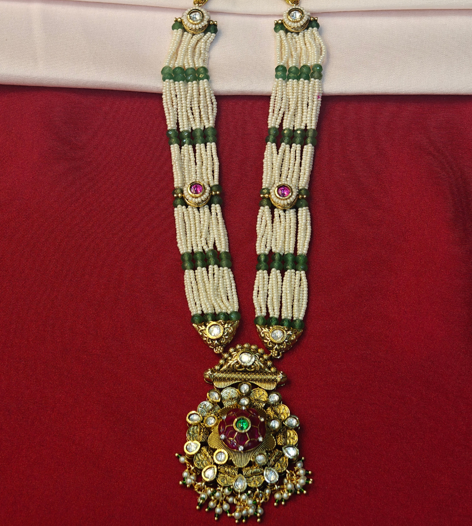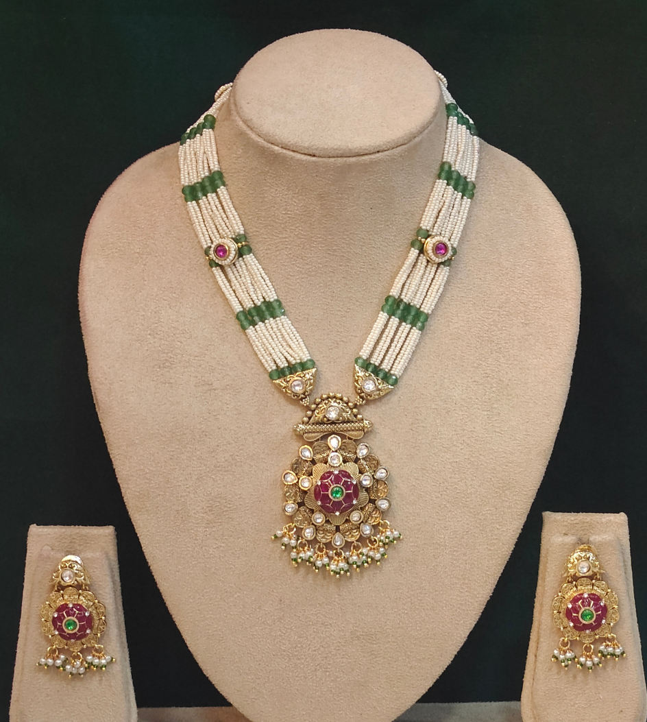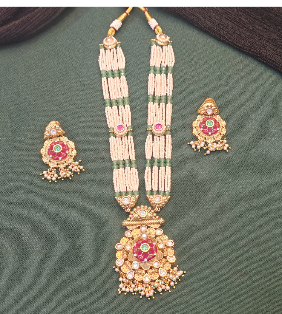 Indulge in the timeless elegance of this premium rajwadi jewellery set. Each piece exudes classiness and charm, crafted with meticulous attention to detail. The radiant intricate flower design adds a touch of luxury, making this set a stunning addition to any ensemble.