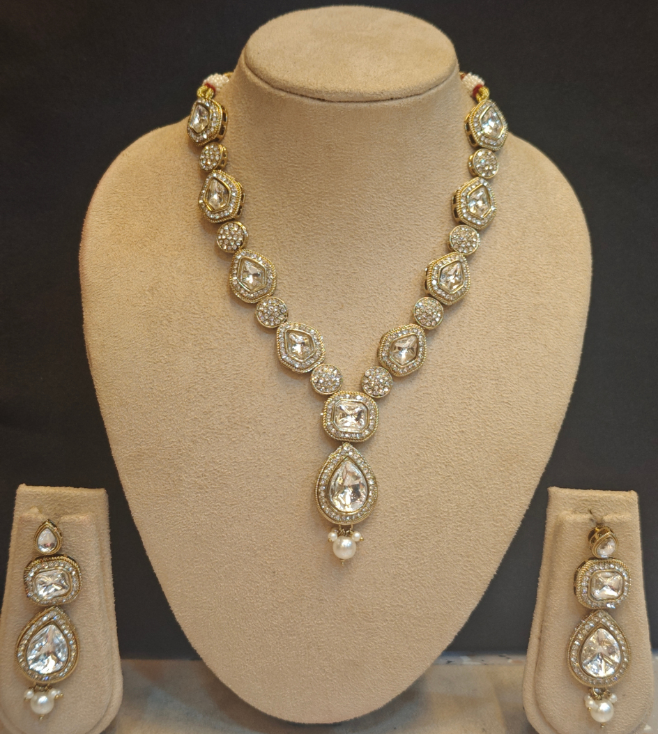 This antique jewellery with a blackish finish is the talk of the town. With two heavy look earnings this necklace set definitely stands out amongst the crowd and exudes luxury and sophistication.