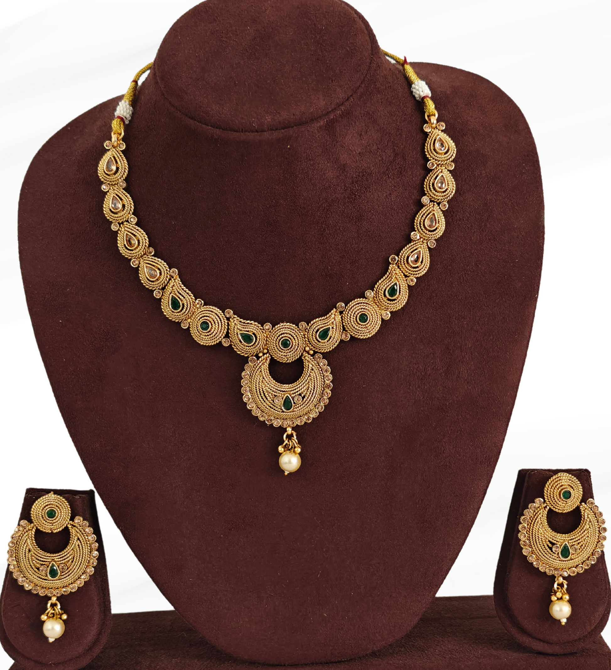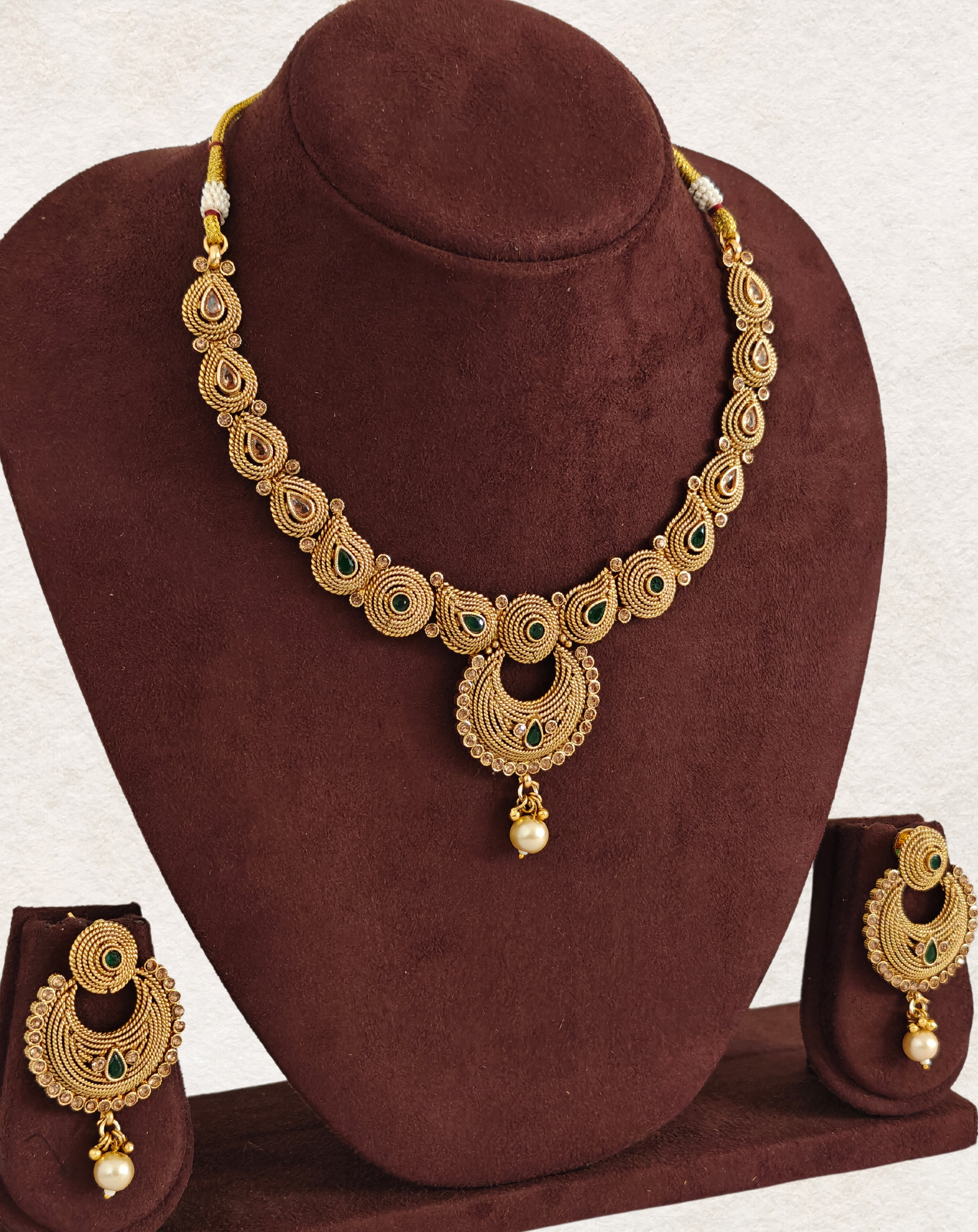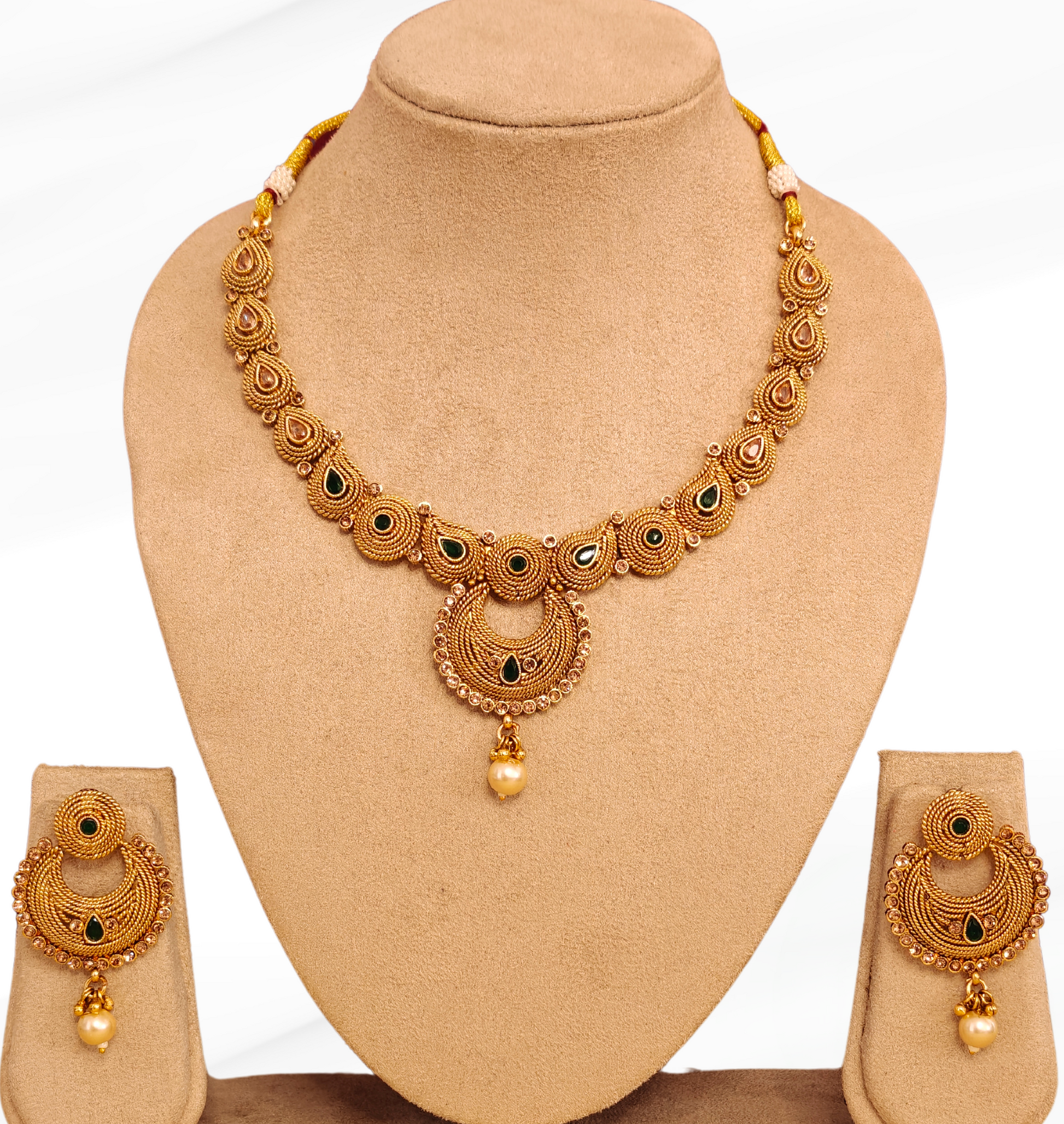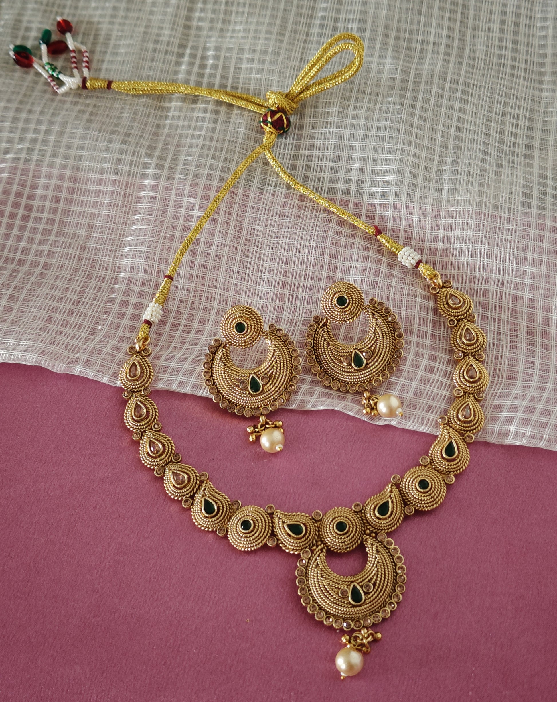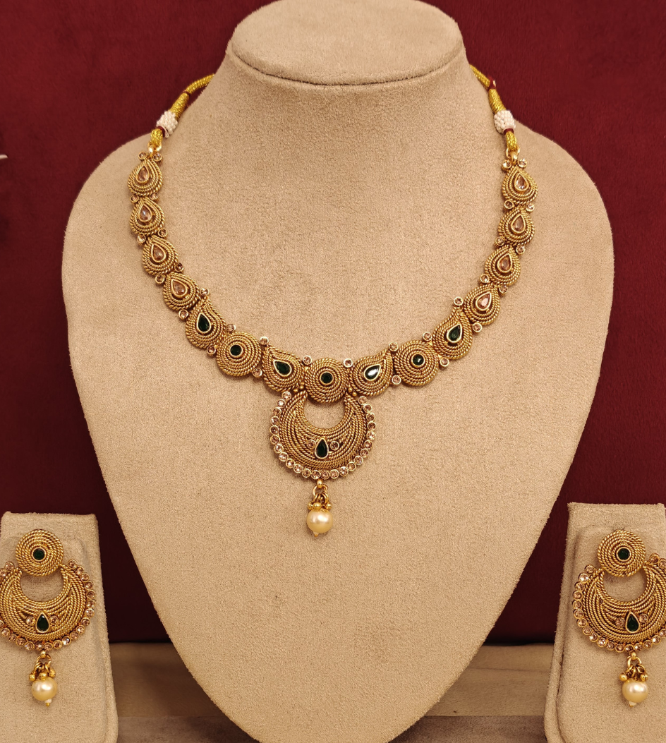 Indulge in the timeless elegance of this antique high gold-plated jewellery set. Each piece exudes classiness and charm, crafted with meticulous attention to detail. The radiant glow of the gold plating adds a touch of luxury, making this set a stunning addition to any ensemble.