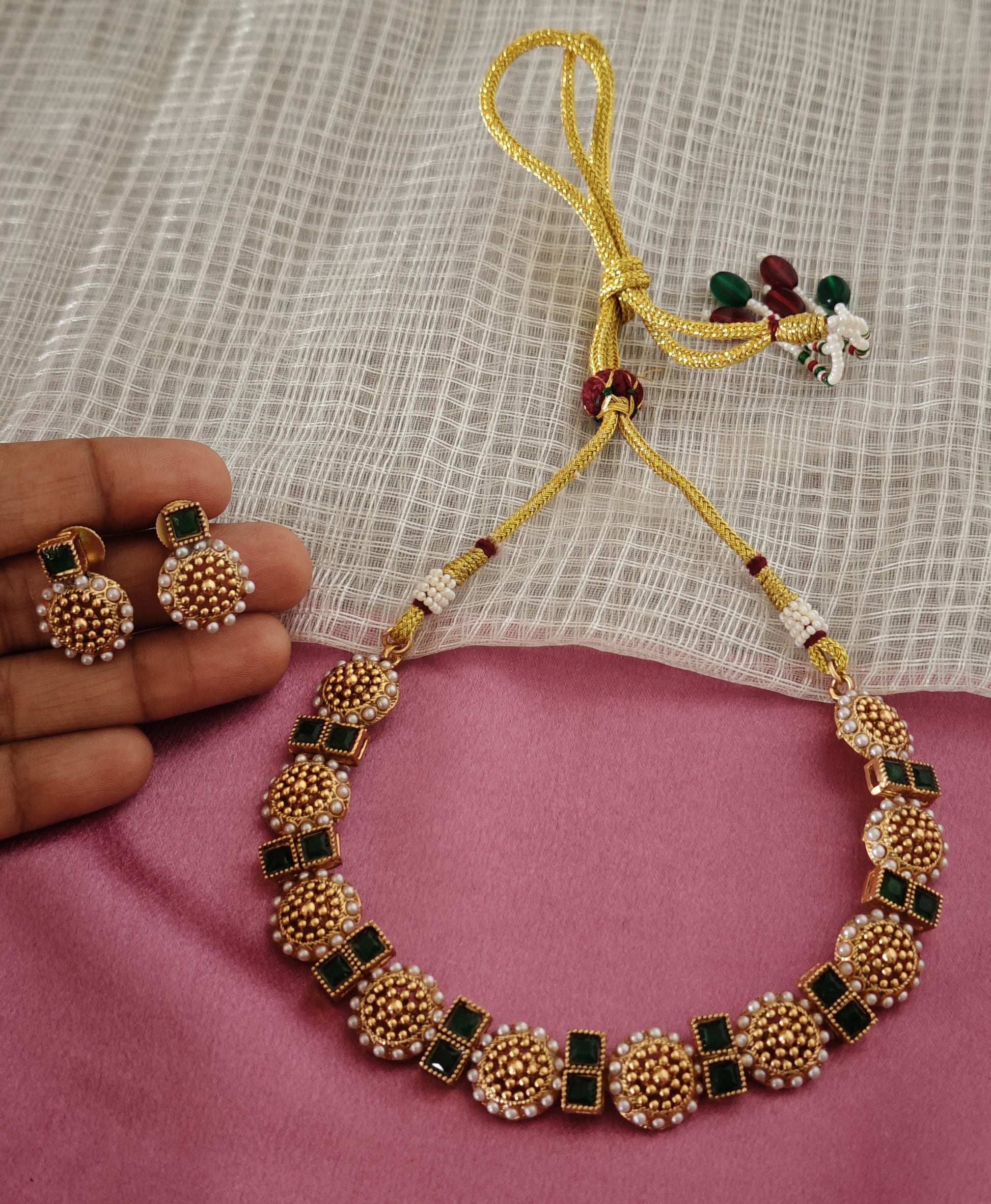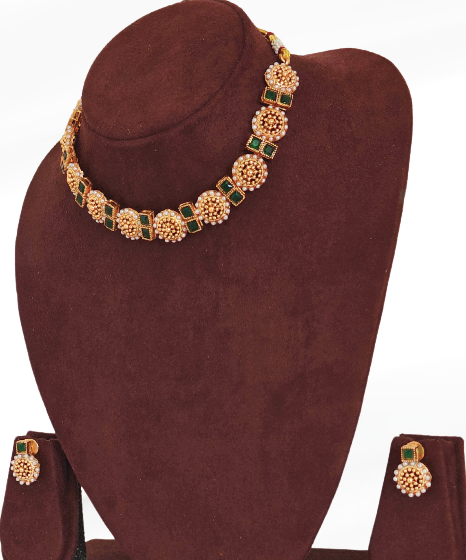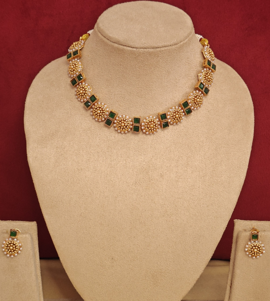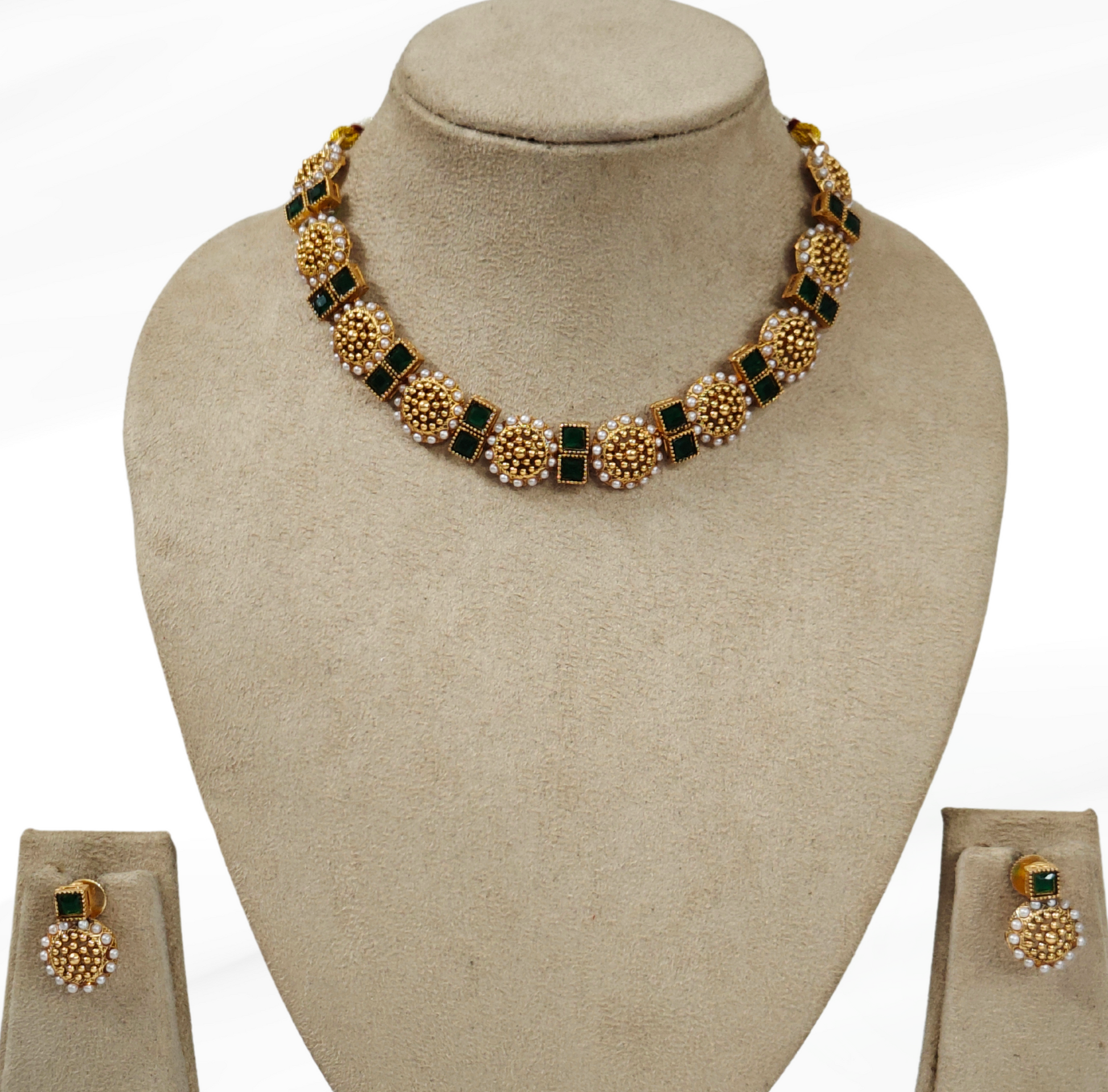 This high gold plated jewellery set adds an amazing touch to any outfit. It's simple design along with colored stones and white beads makes you stand out with its timeless elegance.
