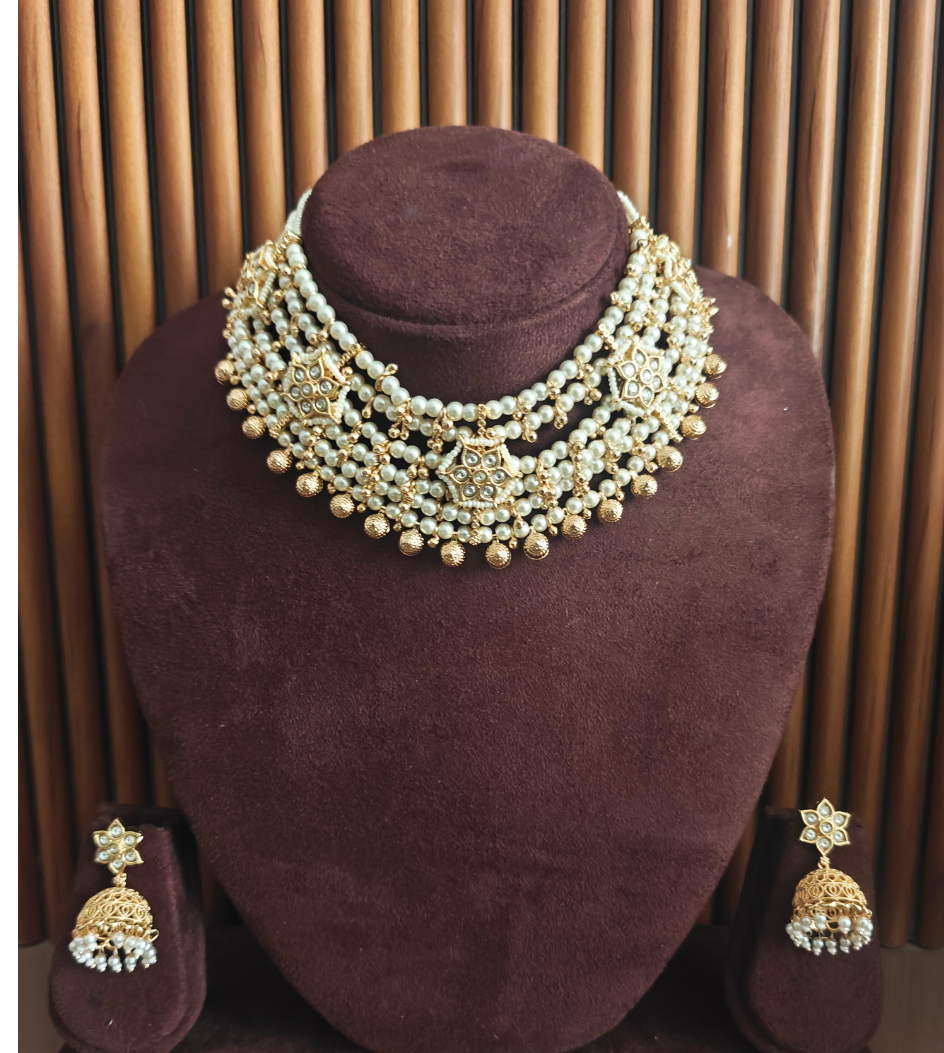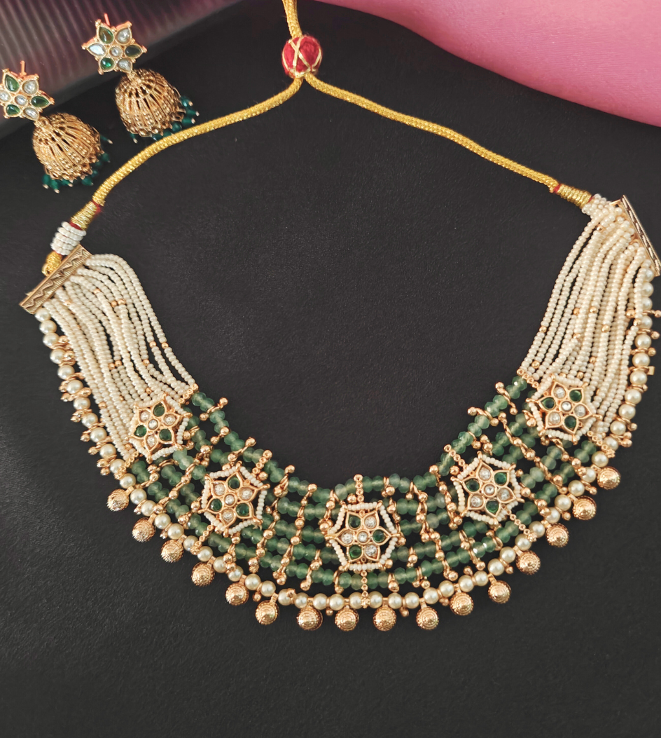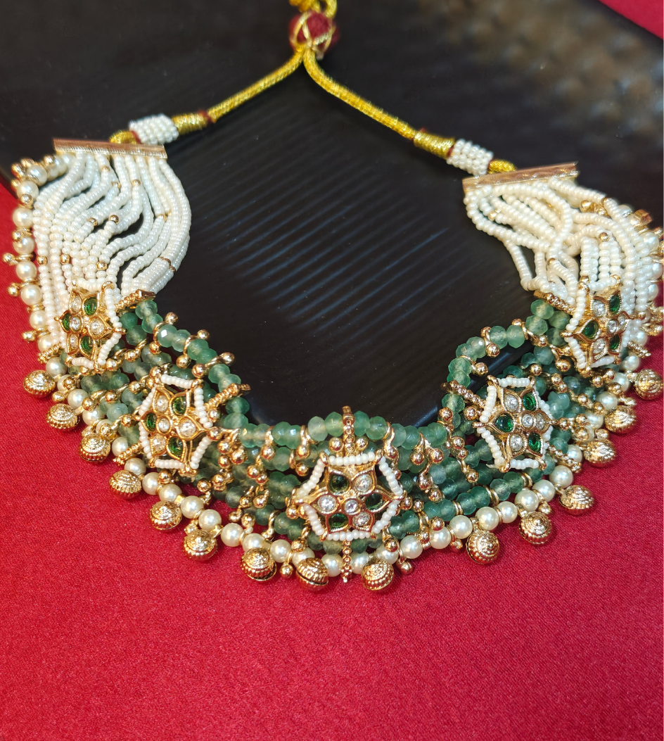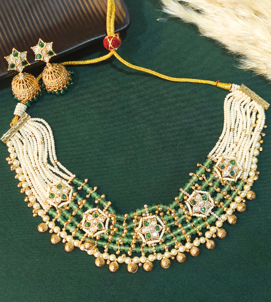 Indulge in the timeless elegance of this premium rajwadi jewellery set. Each piece exudes classiness and charm, crafted with meticulous attention to detail. The radiant intricate flower design adds a touch of luxury, making this set a stunning addition to any ensemble.