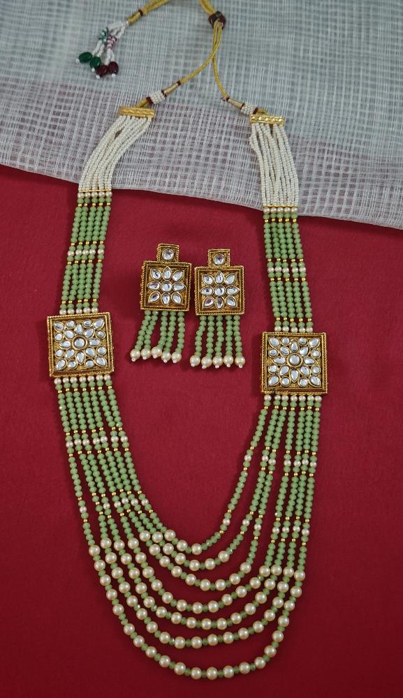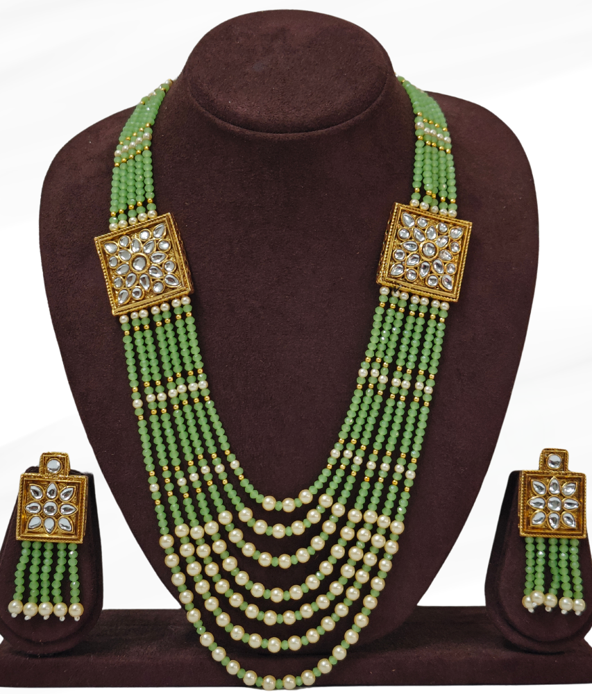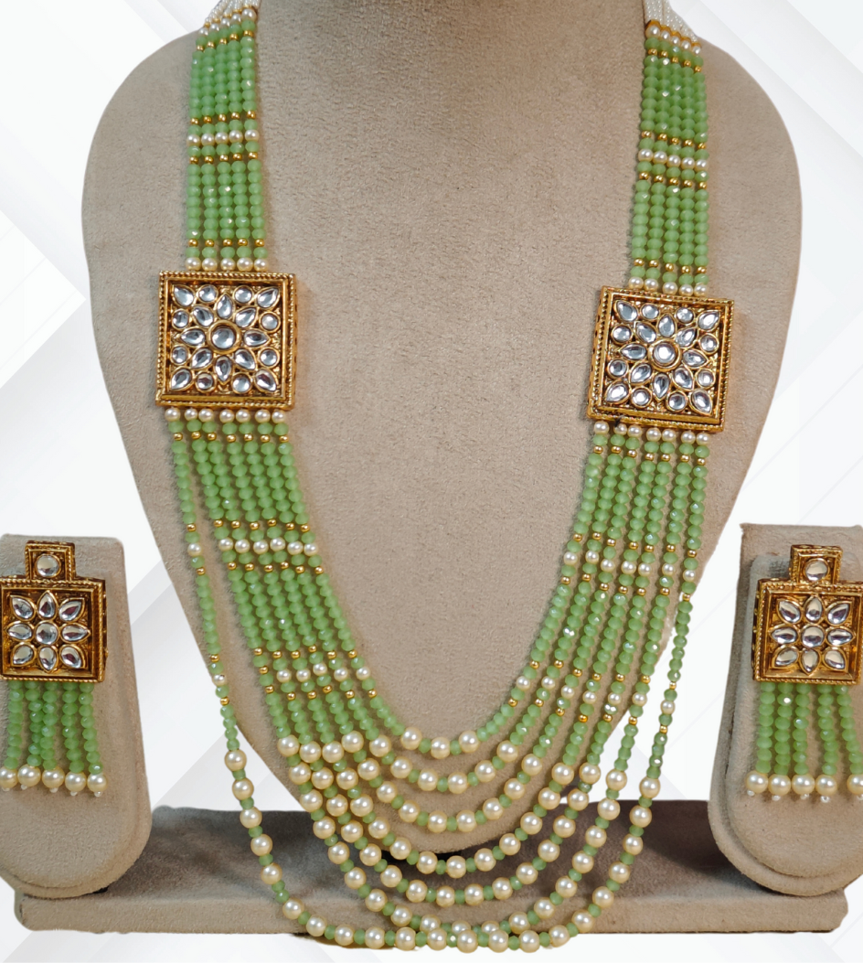 This long mala jewellery set adorned with lustrous pearl beads. The carefully crafted kundan stones and colorful embellishments make it look captivating, sure to get lots of attention and compliments.