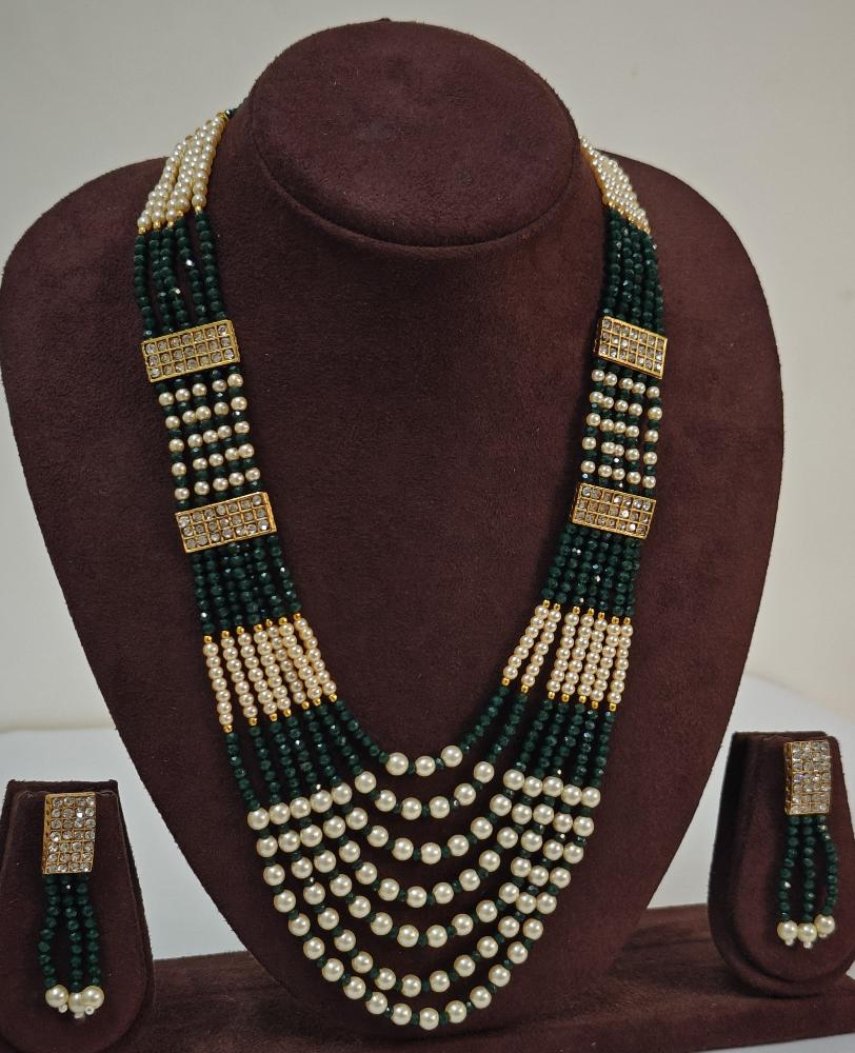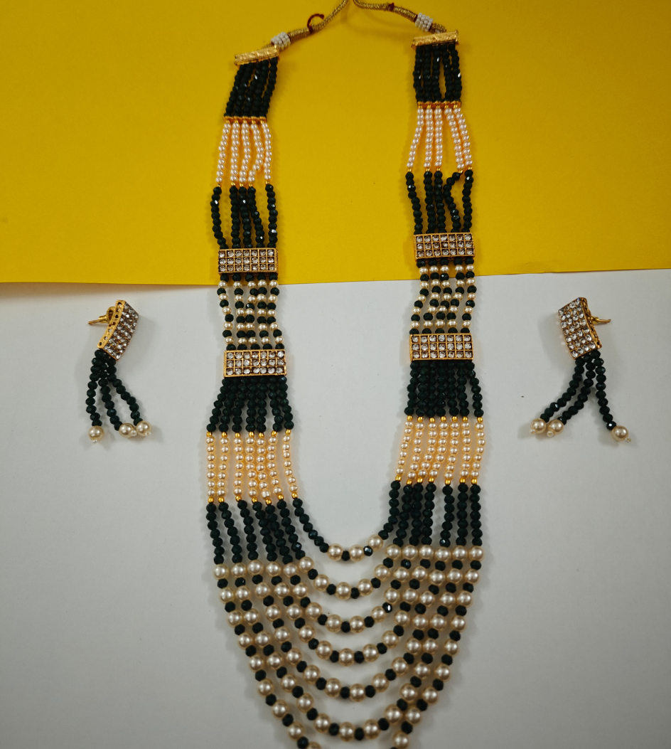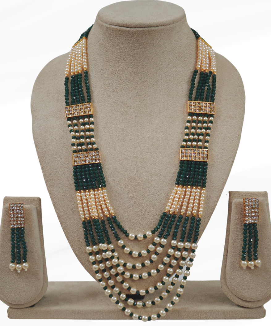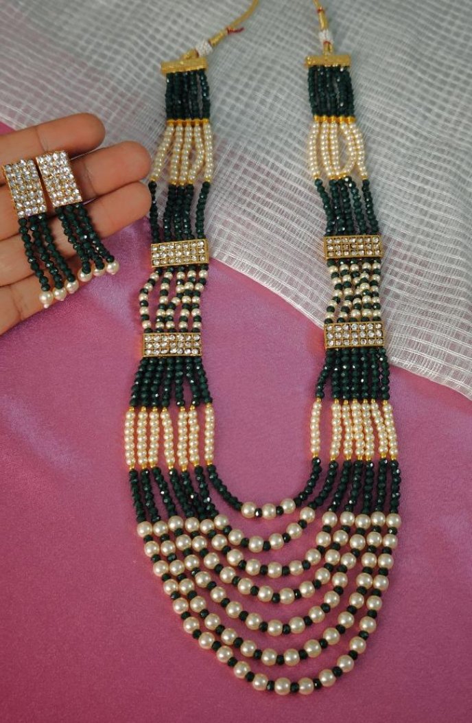 This long mala jewellery set adorned with lustrous pearl beads. The carefully crafted kundan stones and colorful embellishments make it look captivating, sure to get lots of attention and compliments.