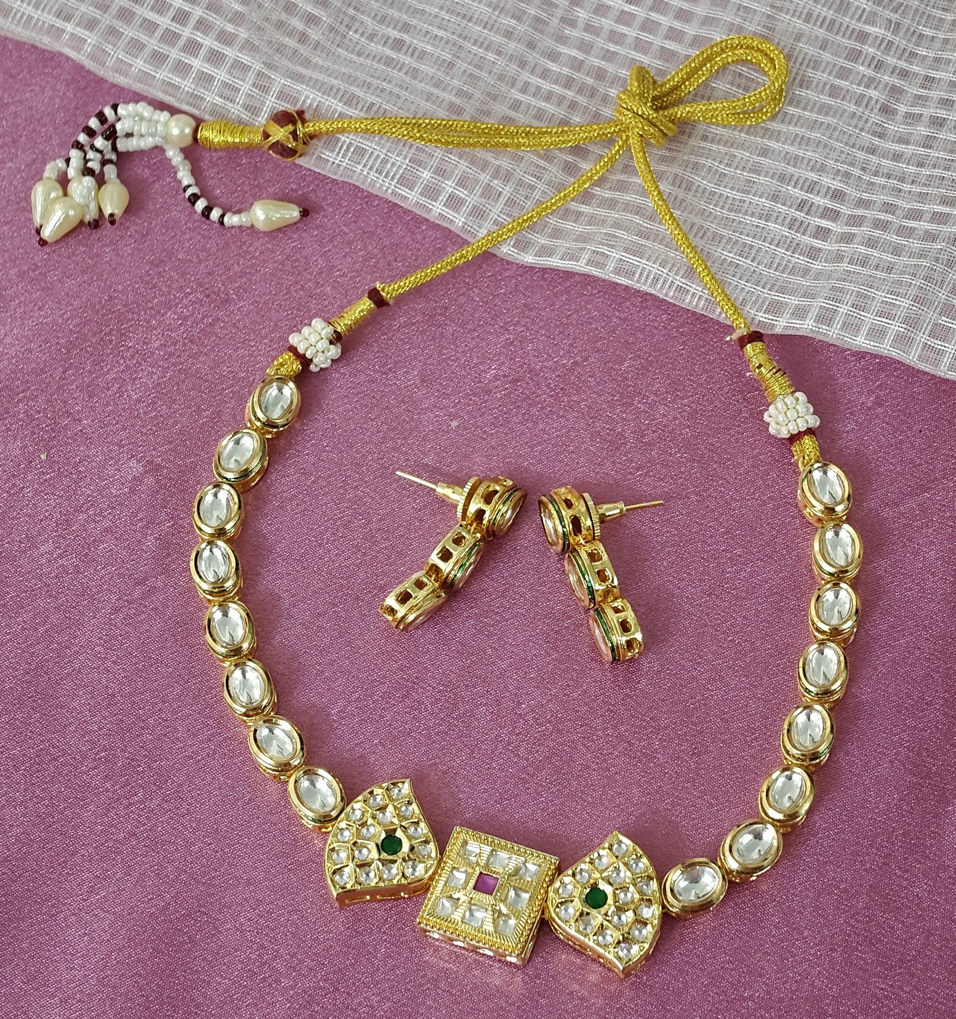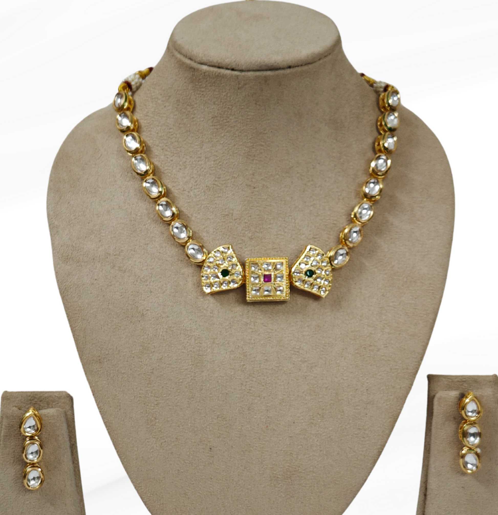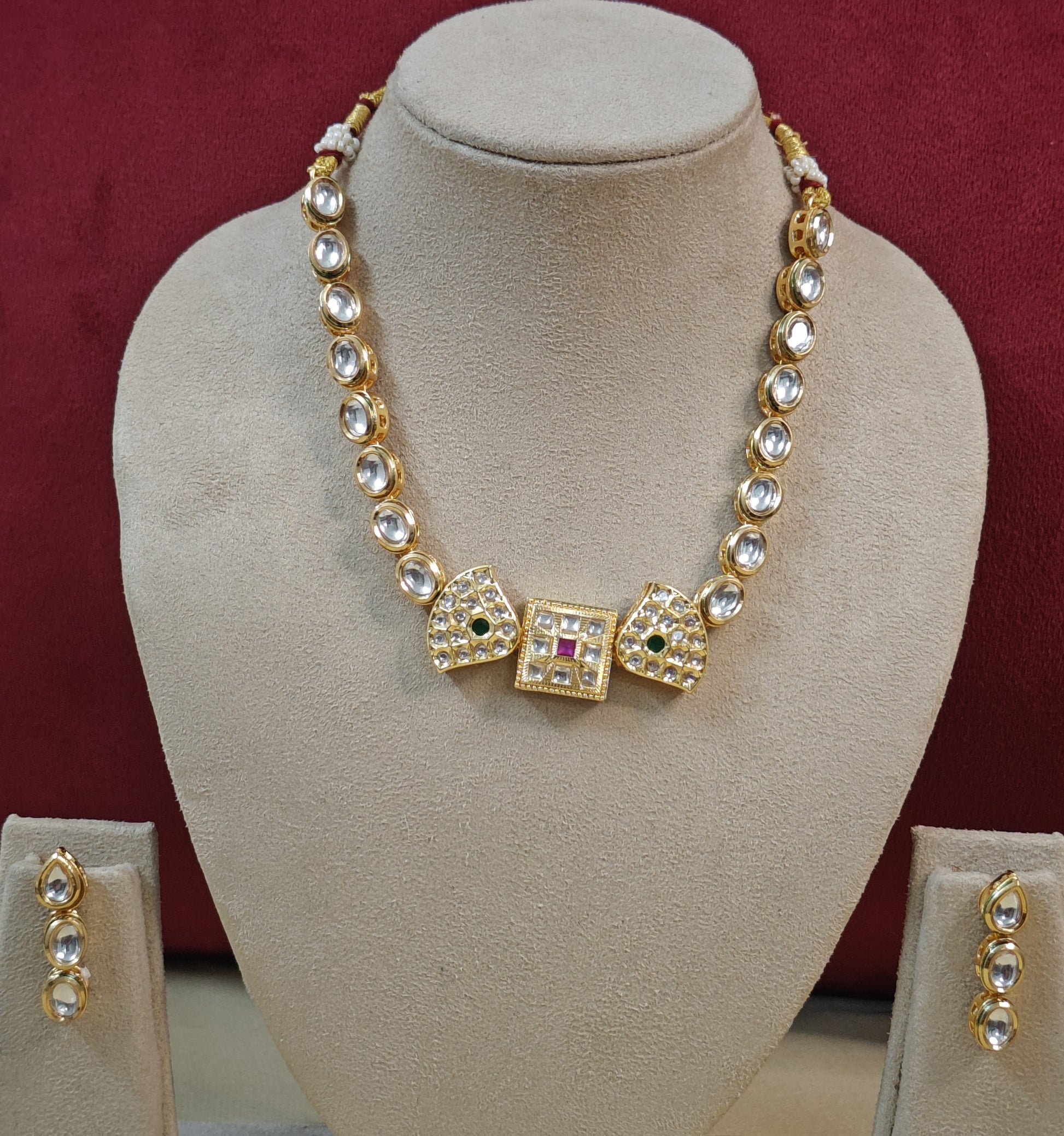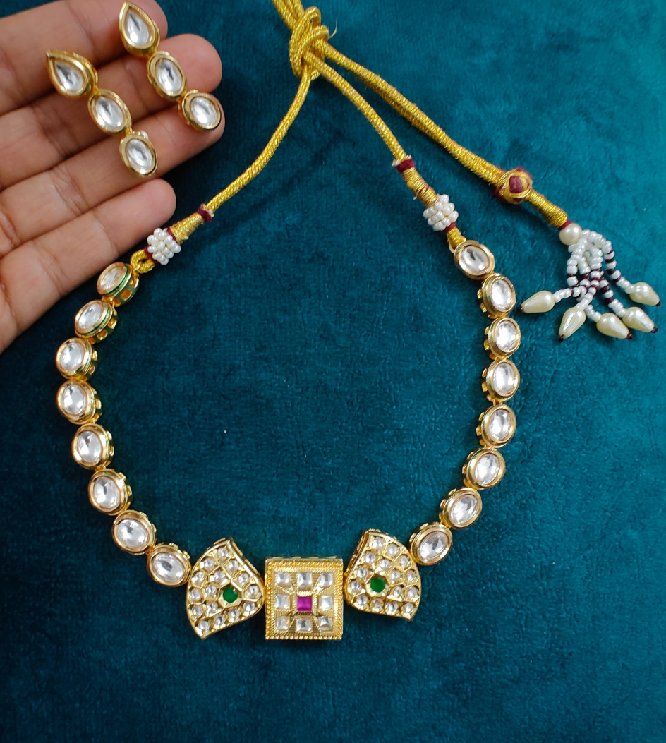 Elevate any occasion with our single-layered Kundan necklace set with meenakari work at the back, enhancing the elegance of sarees, dresses and even lehengas. Its intricate detailing adorned with colored stones, ensures it stands out and deserves compliments.