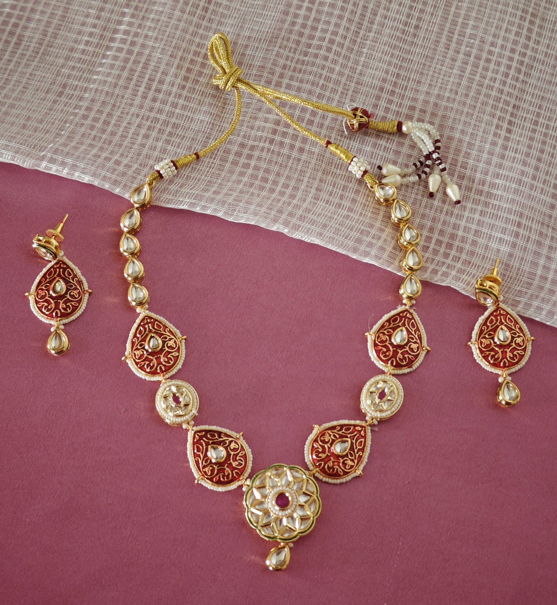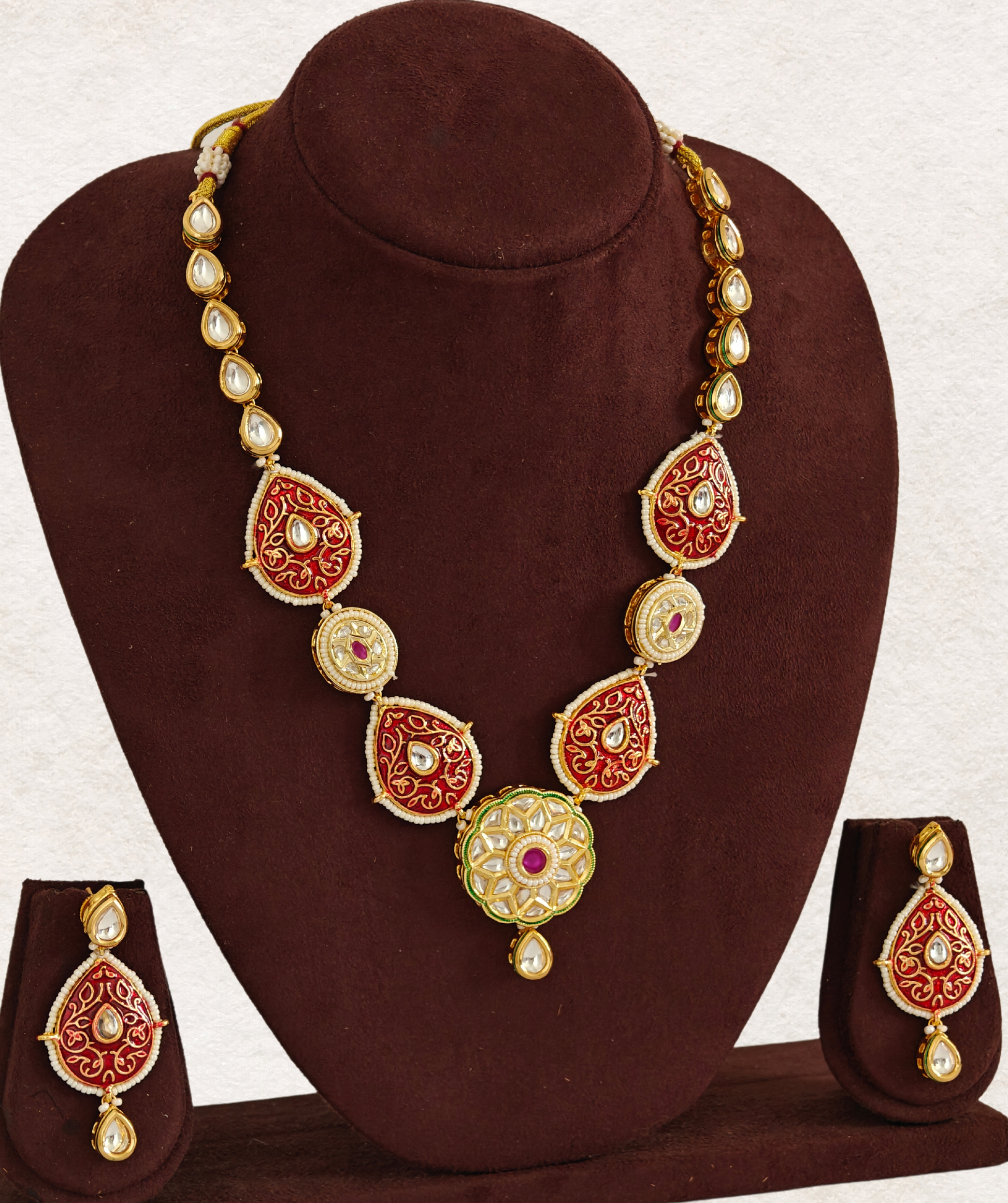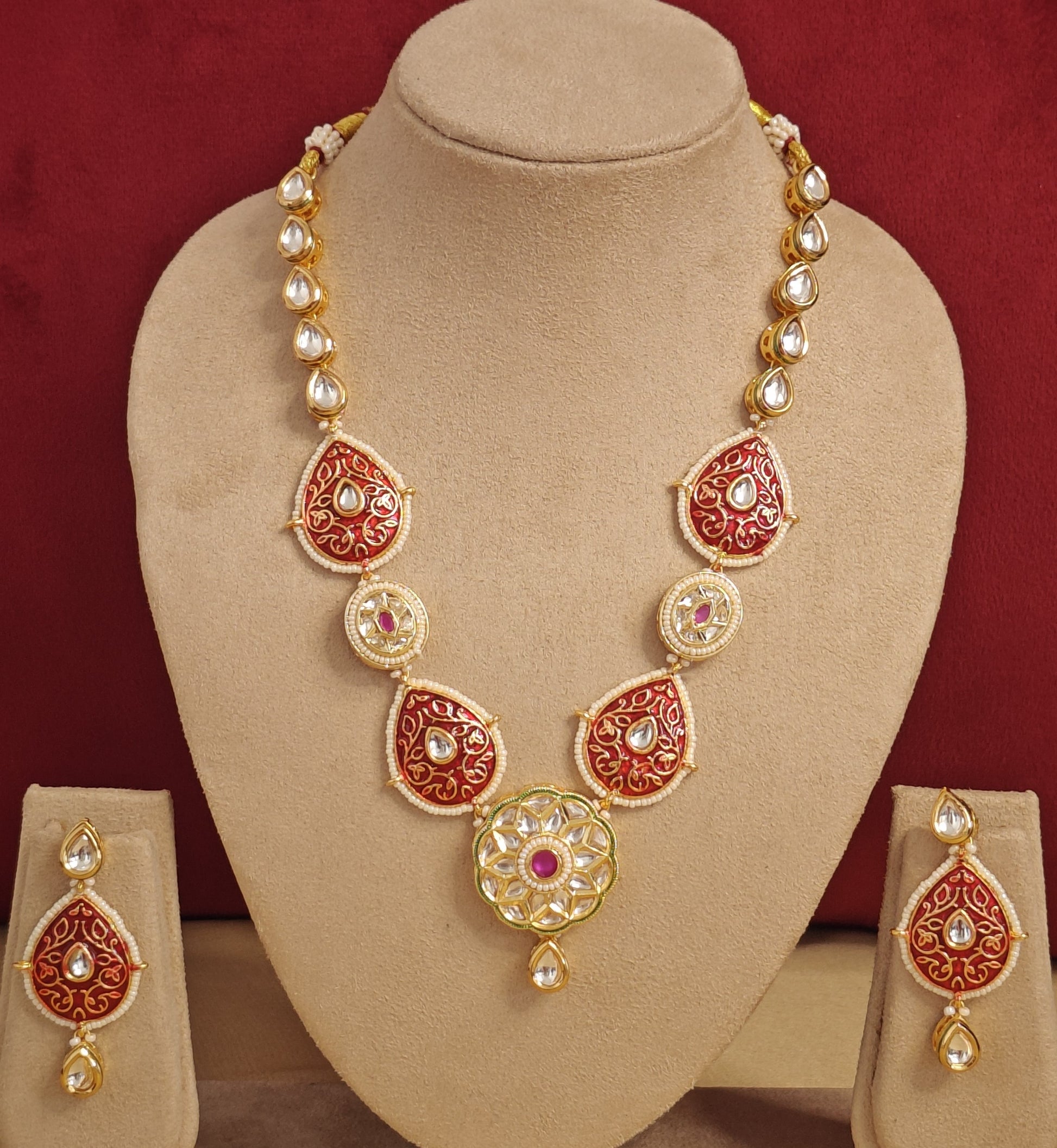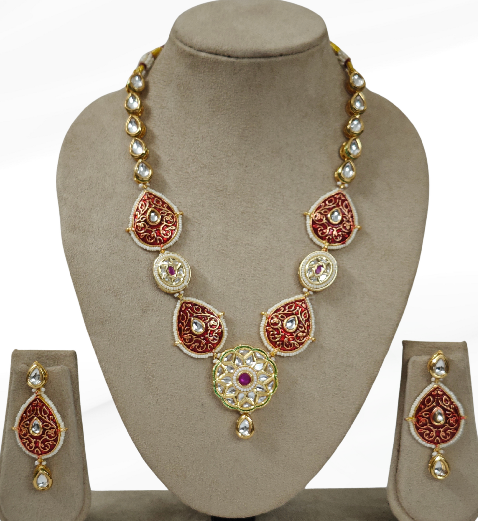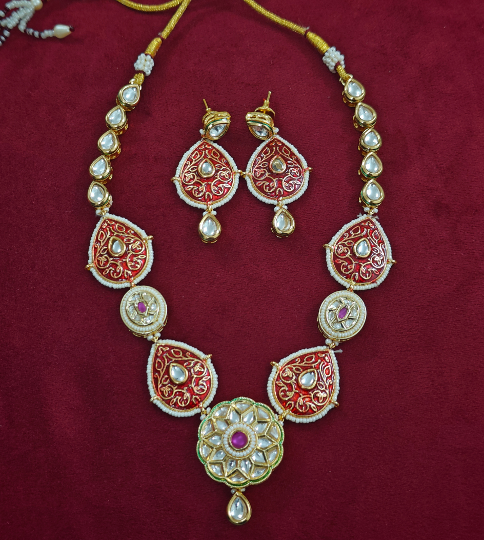 This beautiful kundan jewelry set with peculiar meenakari work and magnificent pearl detailing is perfect for adding an extra touch to any festive or special occasion. It goes well with sarees, dresses, and other outfits for any function. This set makes you look elegant with its excellent craftsmanship.