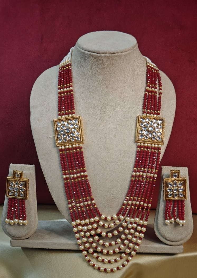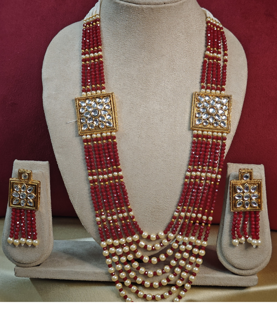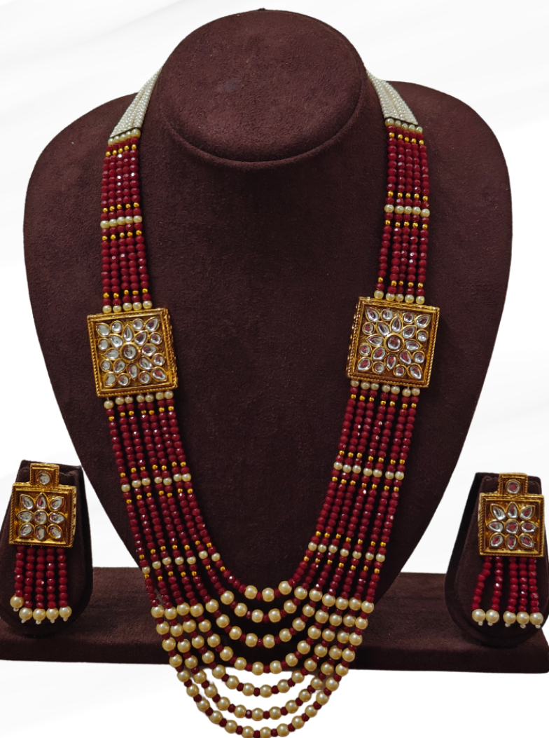This long mala jewellery set adorned with lustrous pearl beads. The carefully crafted kundan stones and colorful embellishments make it look captivating, sure to get lots of attention and compliments.
