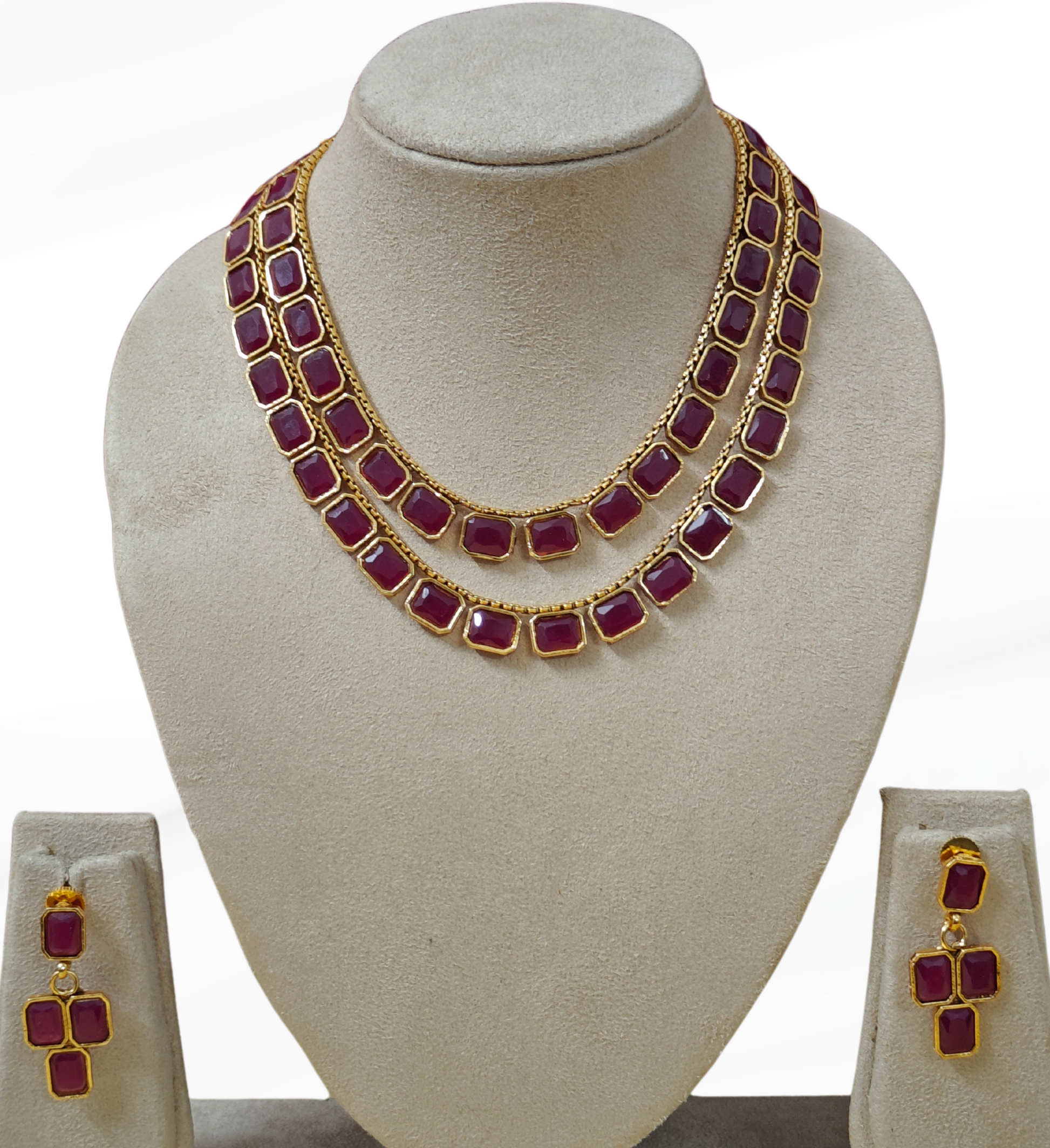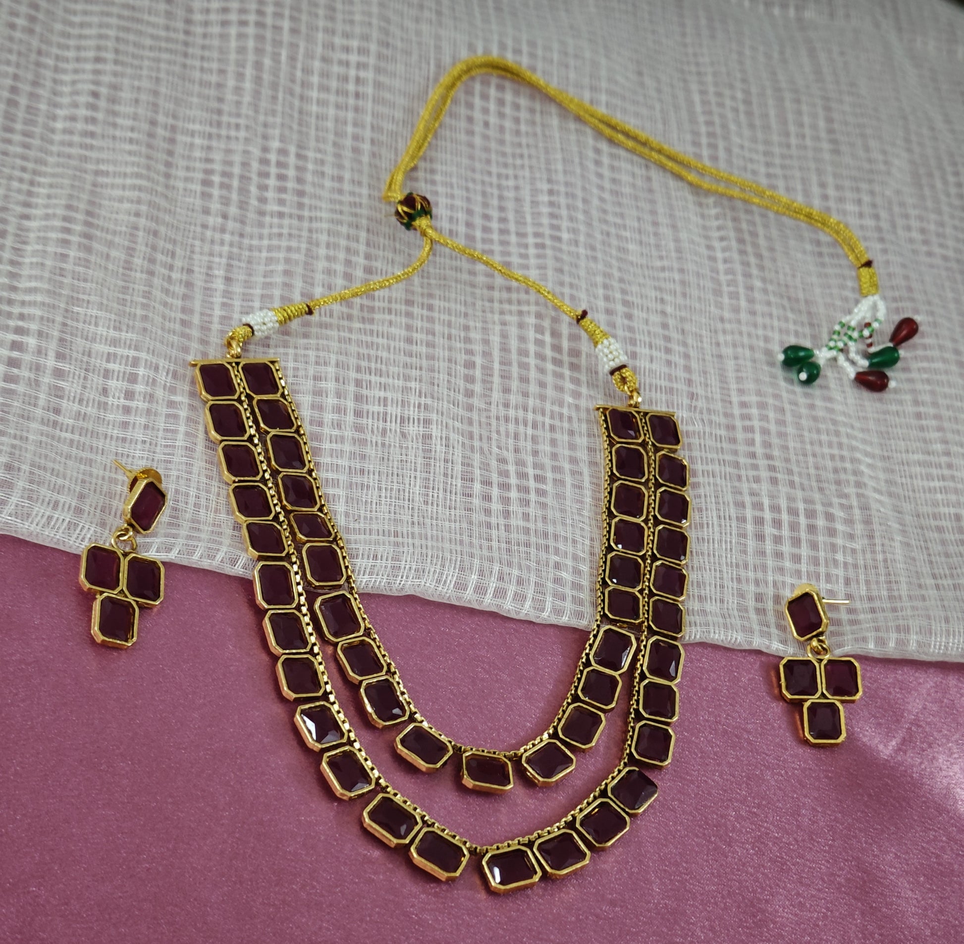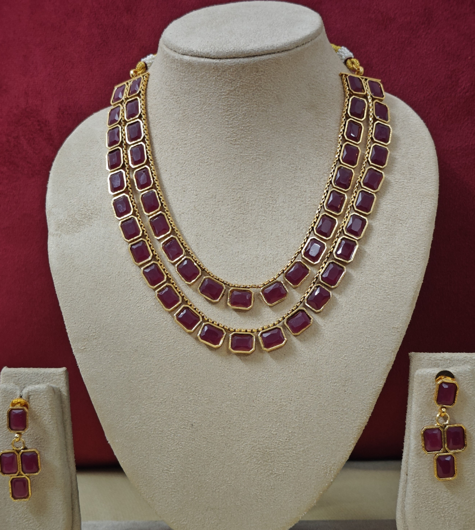 Presenting our exquisite two-layered jewellery set adorned with captivating Monalisa stones, meticulously crafted to enhance your style. Vibrant hues and sparkling maroon color stones create a mesmerizing effect, while its dual-layered design adds depth and allure, suitable for any occasion. Versatile and chic, it ensures your style radiates with sophistication.