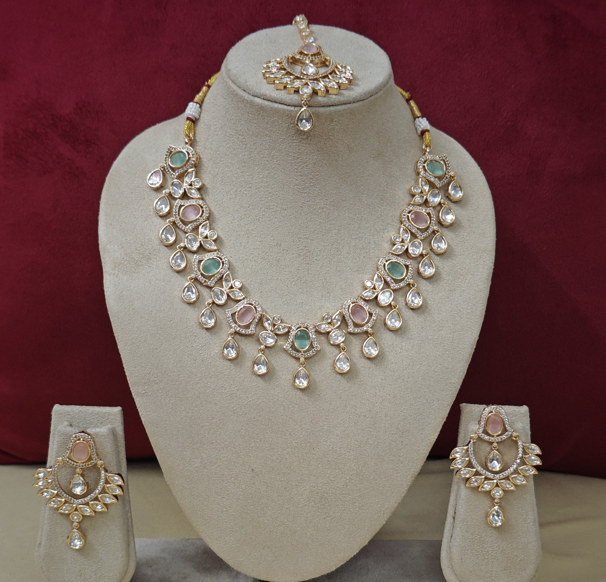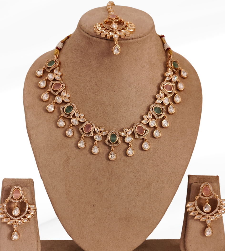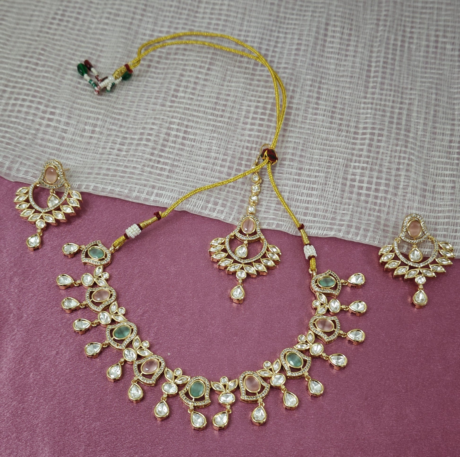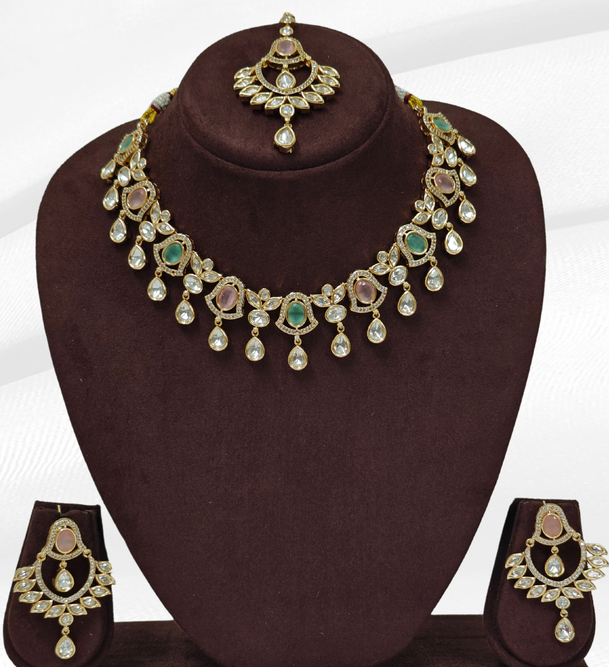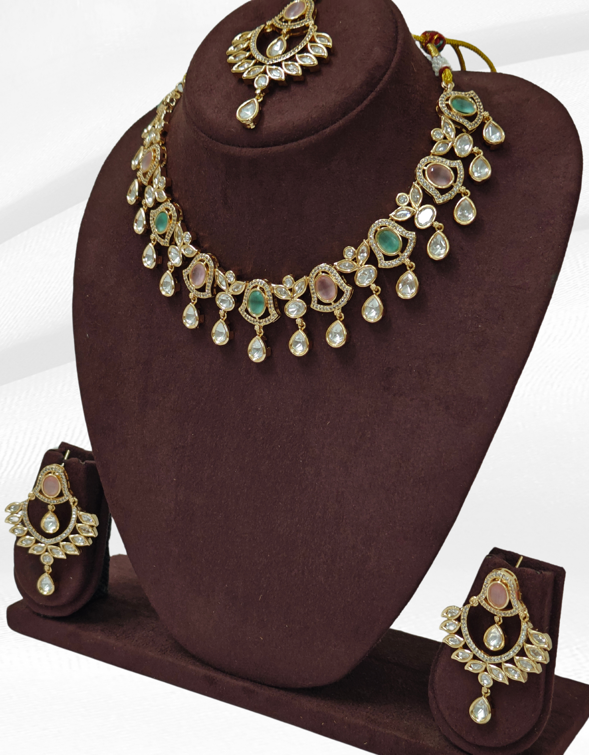 Indulge in elegance with our splendid kundan jewelry, perfect for festive celebrations or wedding occasions. Adorned with shimmering cubic zirconia stones, accented by enchanting pastel green and pink hues, each piece is meticulously crafted to infuse sophistication into any ensemble. Stand out with our timeless designs, leaving a lasting impression wherever you go.