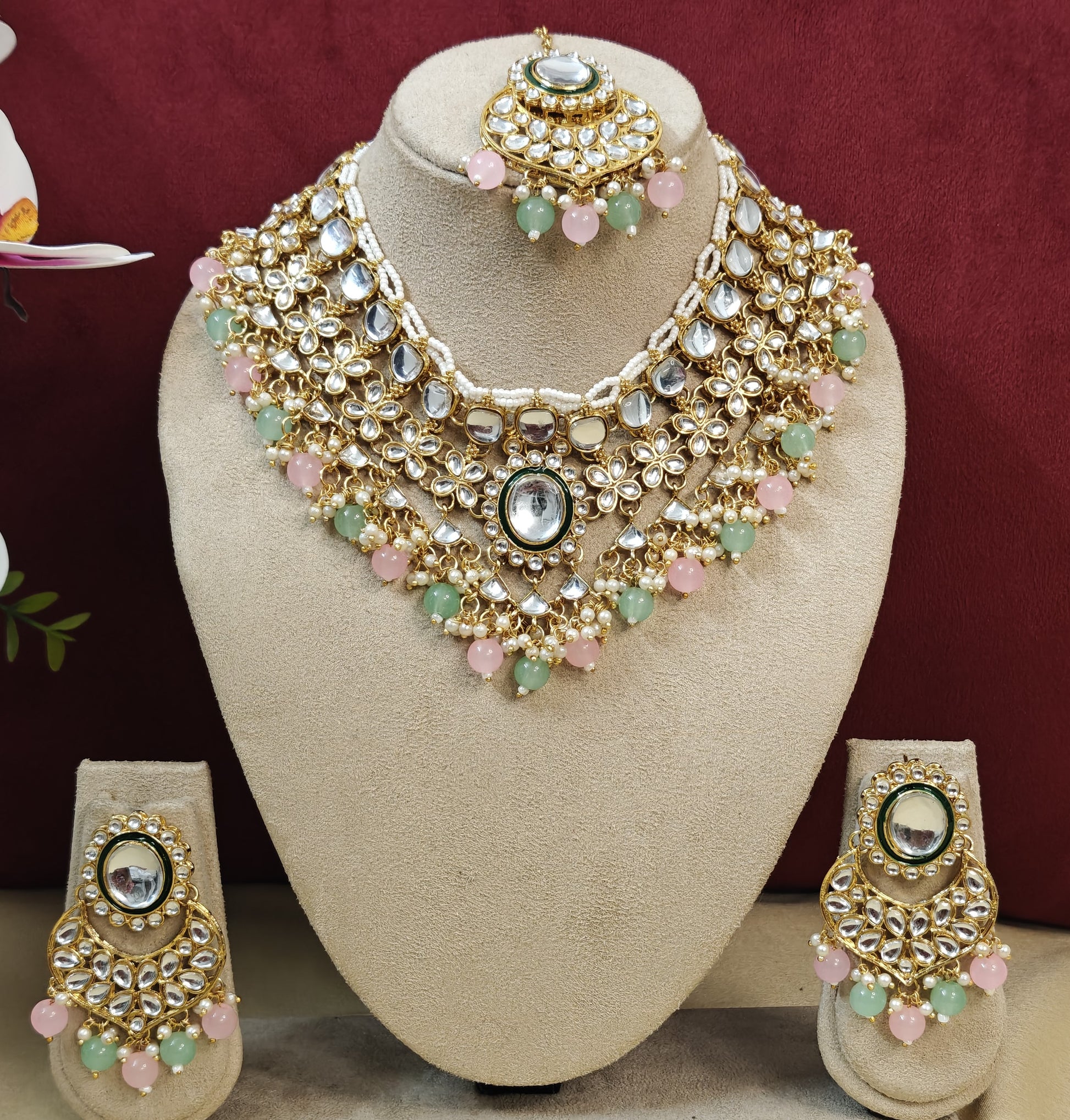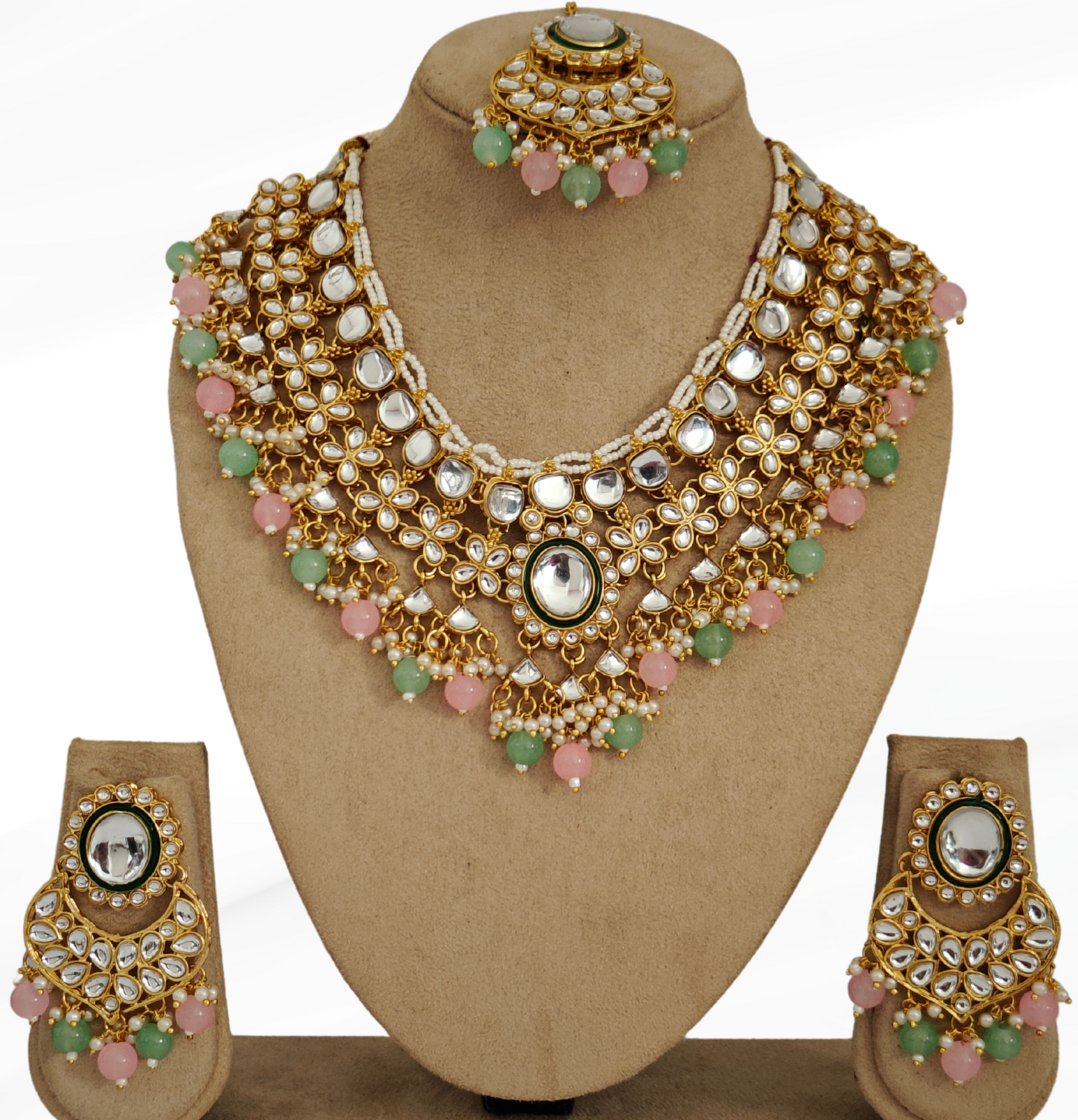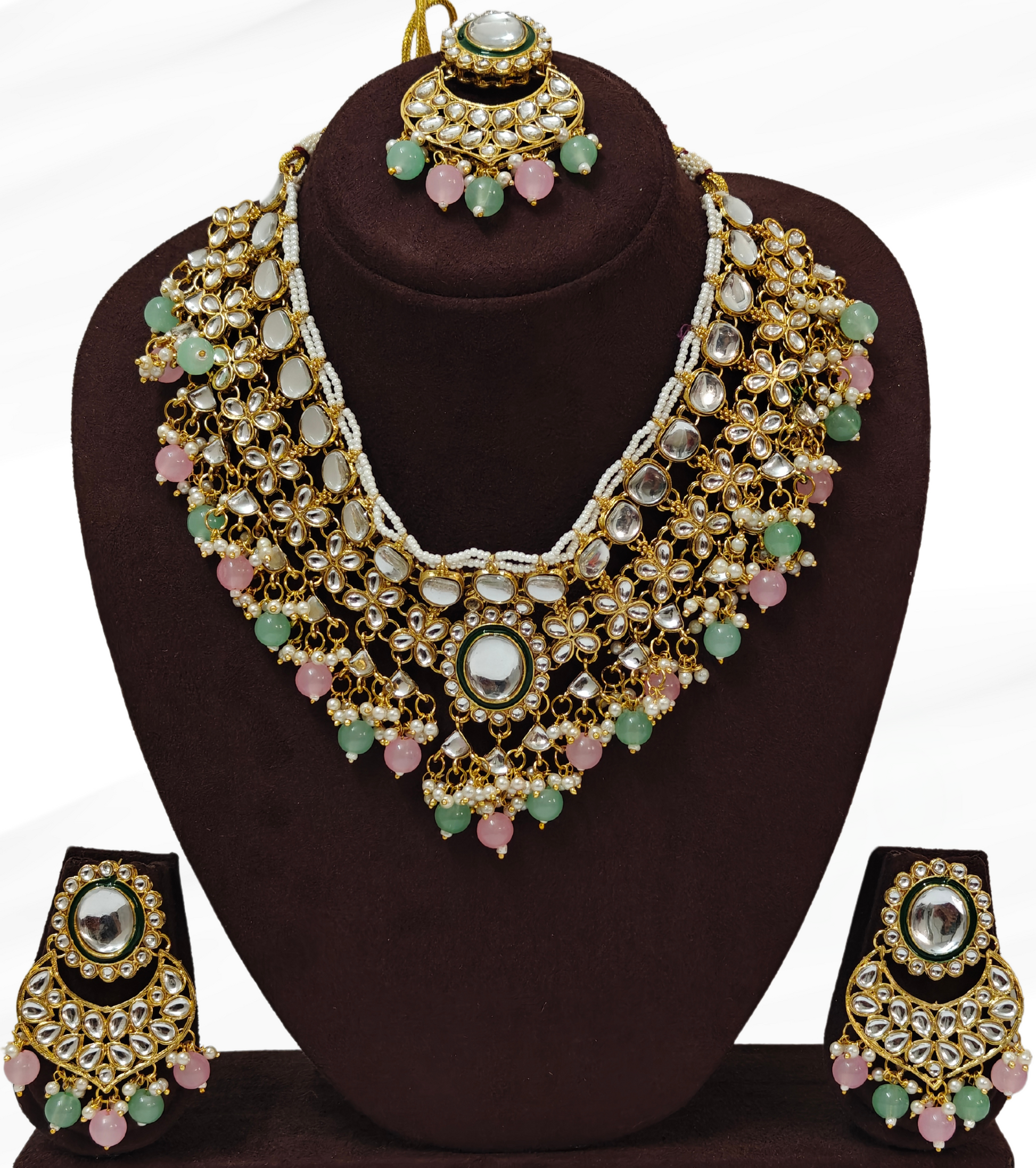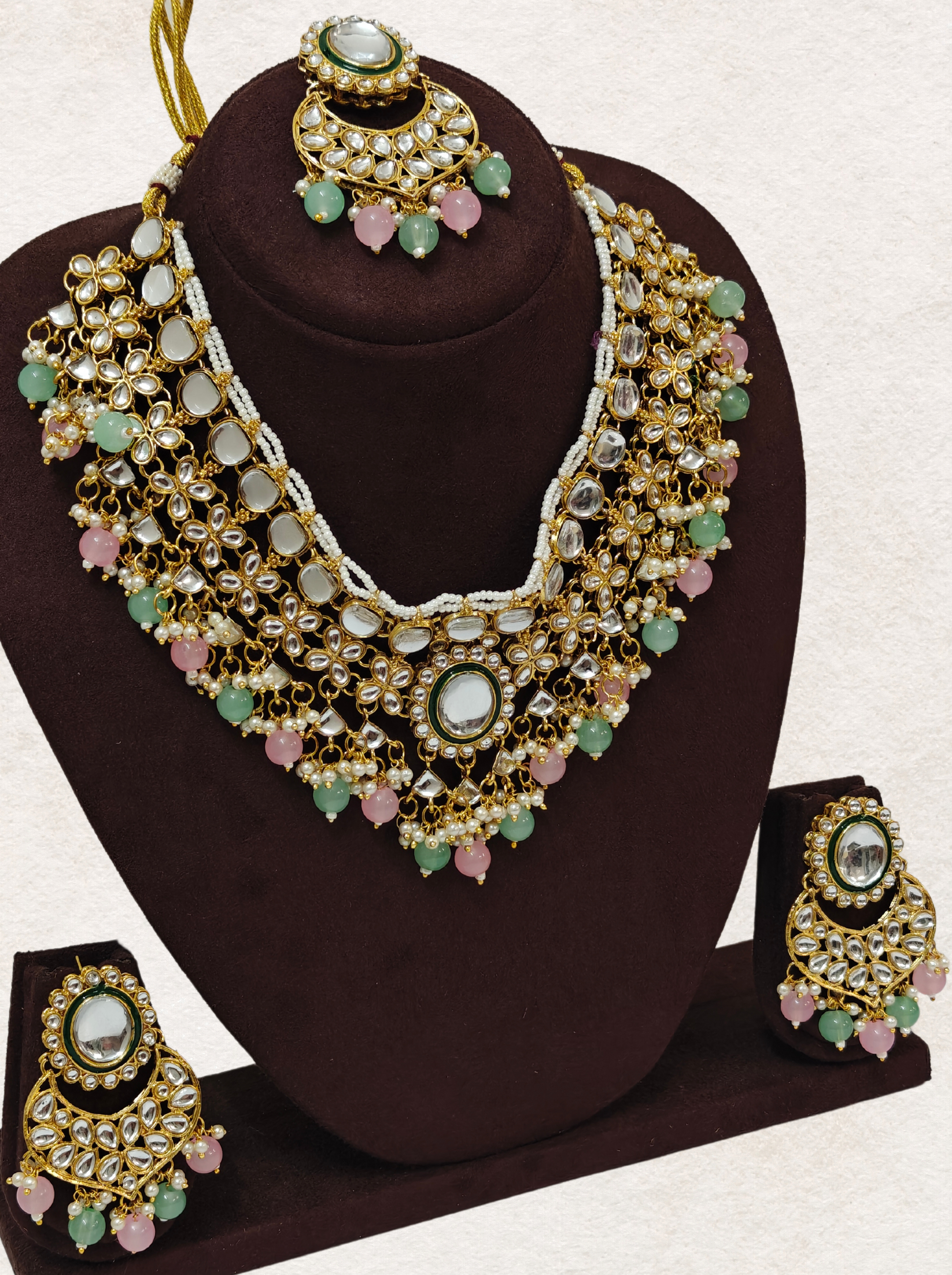 This opulent kundan necklace set is adorned with intricate meenakari craftsmanship and detailed kundan and pearl embellishments. Its intricate floral motifs increase its charm. Ideal for pairing with sarees or lehengas for wedding festivities, it depicts sophistication. You are bound to receive lot of compliments on your elegant choice. The substantial earrings it accompanies lend a bold statement to the ensemble.