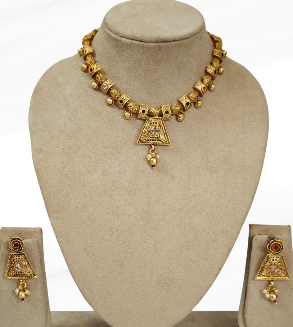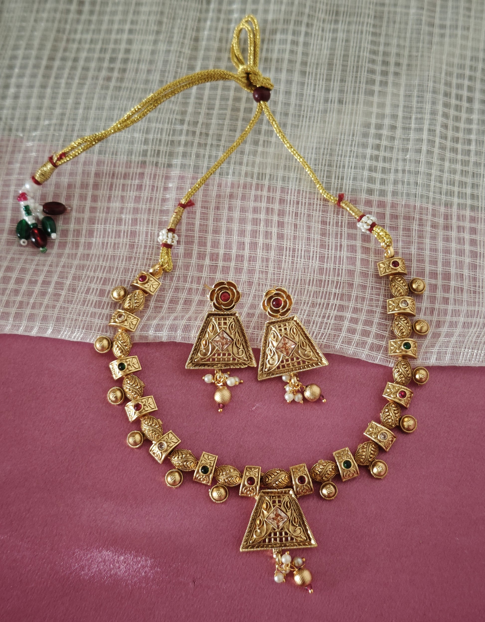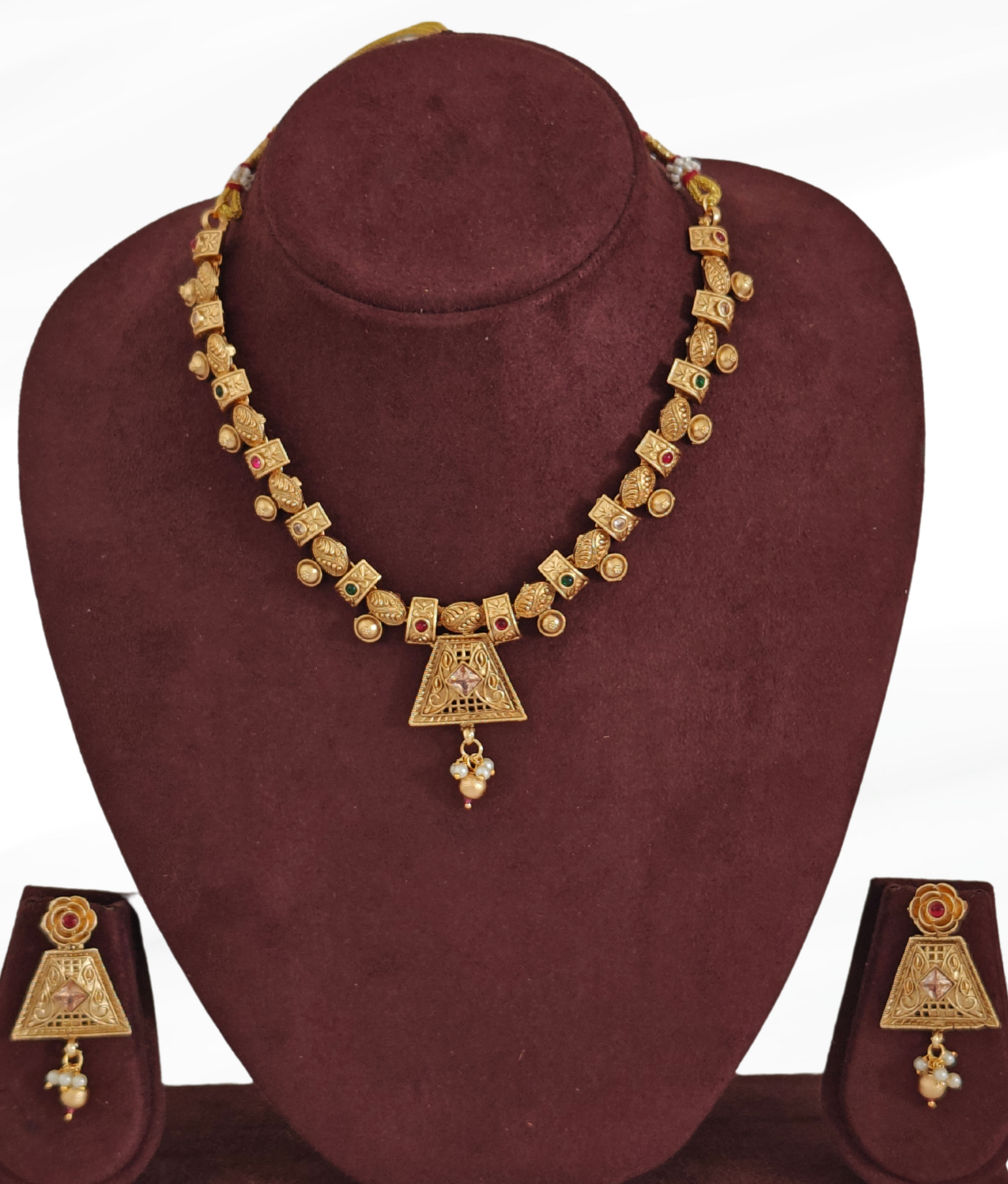 Enjoy the opulent beauty of this Rajwadi jewellery set. It's a beautiful blend of kundan stones on a traditonal golden set with nice intricate design. This one is great for making a festive outfit look really special with a touch of royal charm. No scope that this can turn you down!!