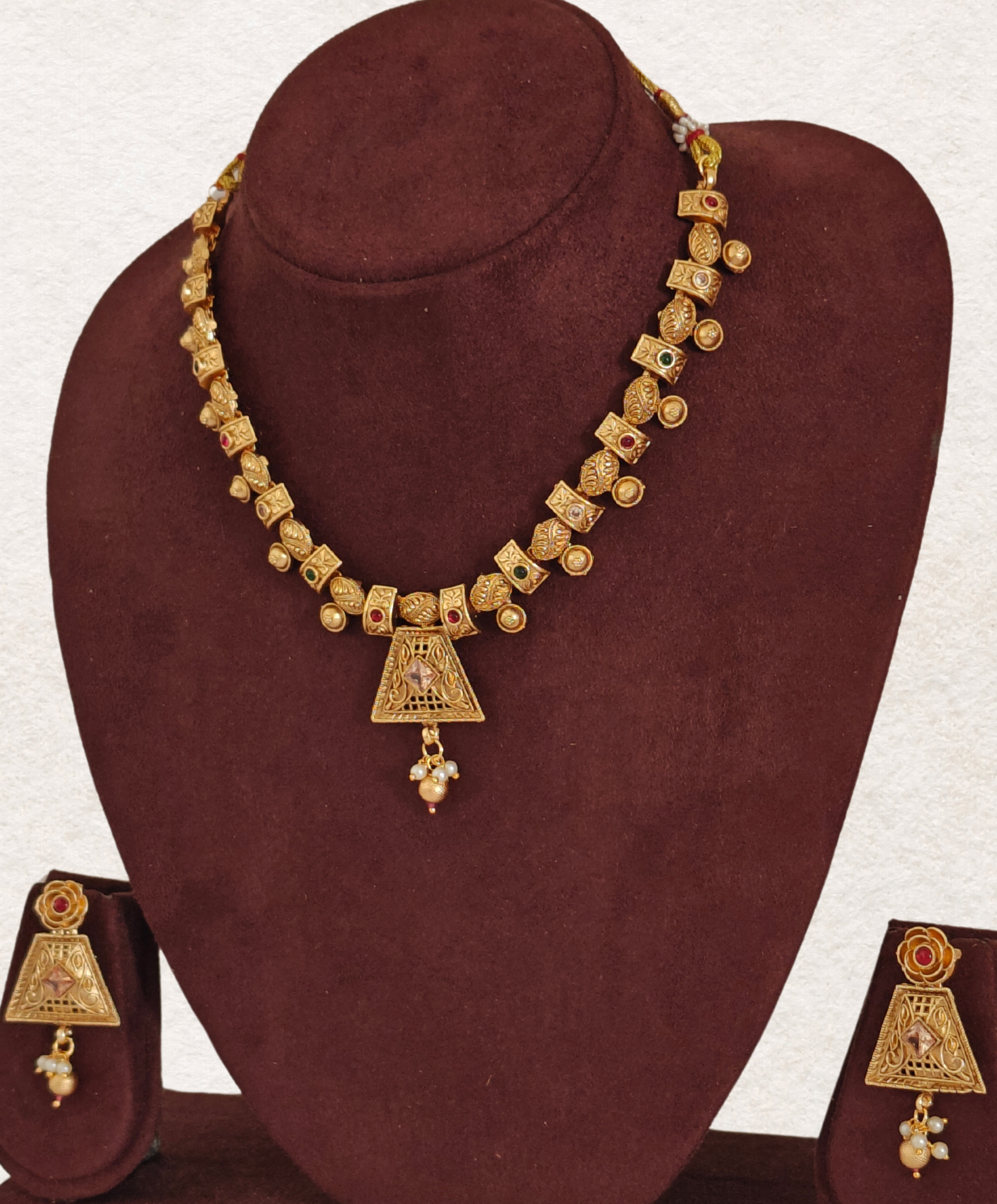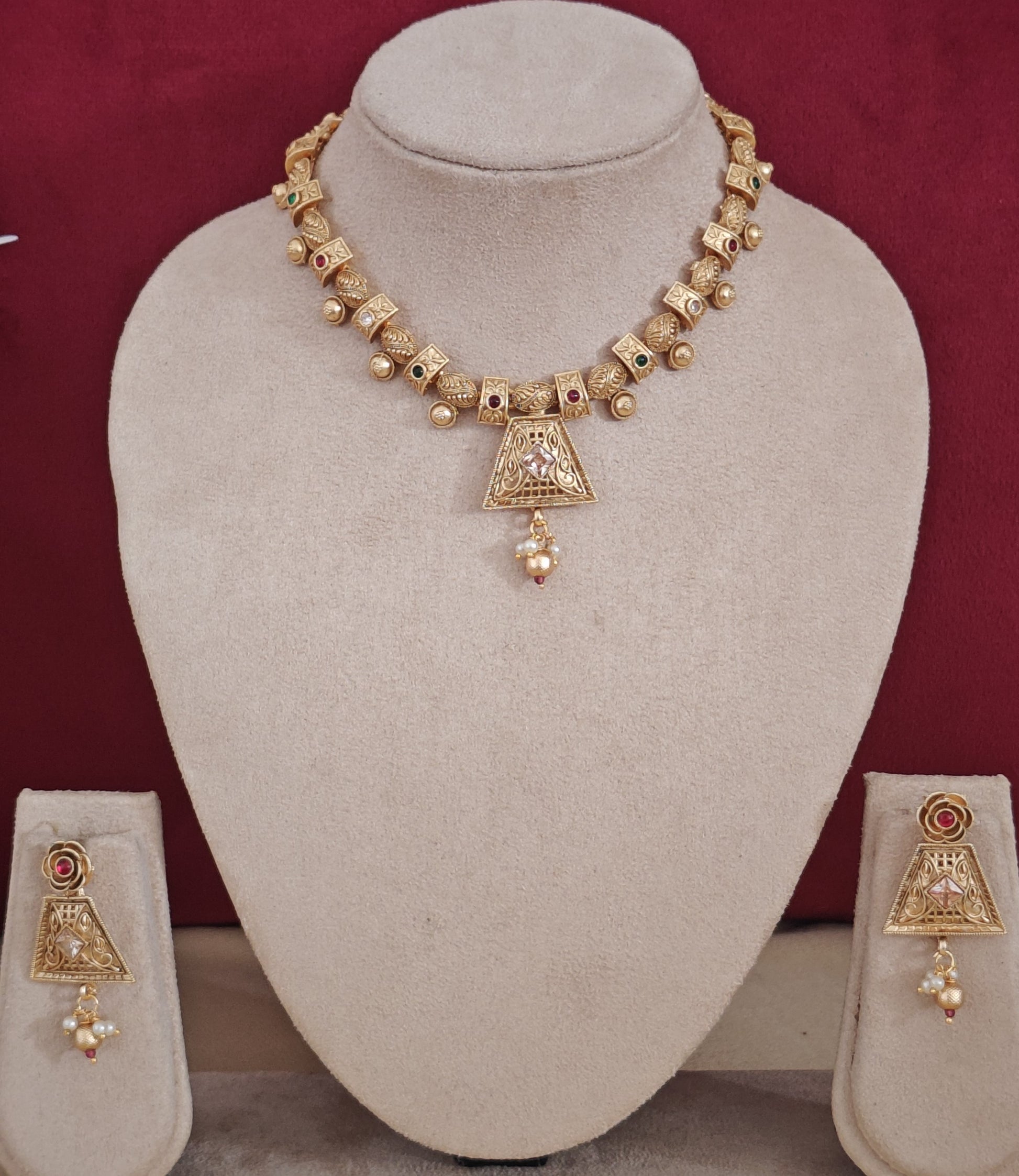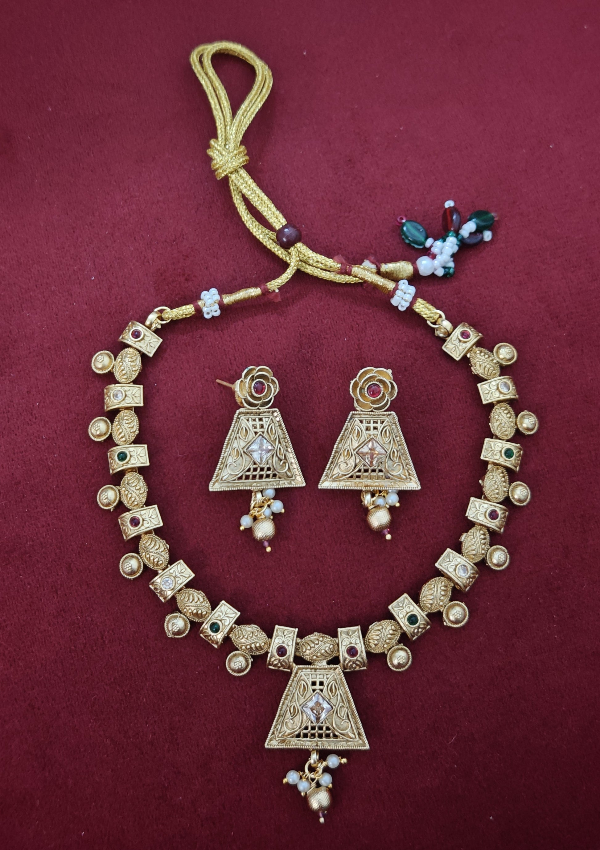 Enjoy the opulent beauty of this Rajwadi jewellery set. It's a beautiful blend of kundan stones on a traditonal golden set with nice intricate design. This one is great for making a festive outfit look really special with a touch of royal charm. No scope that this can turn you down!!