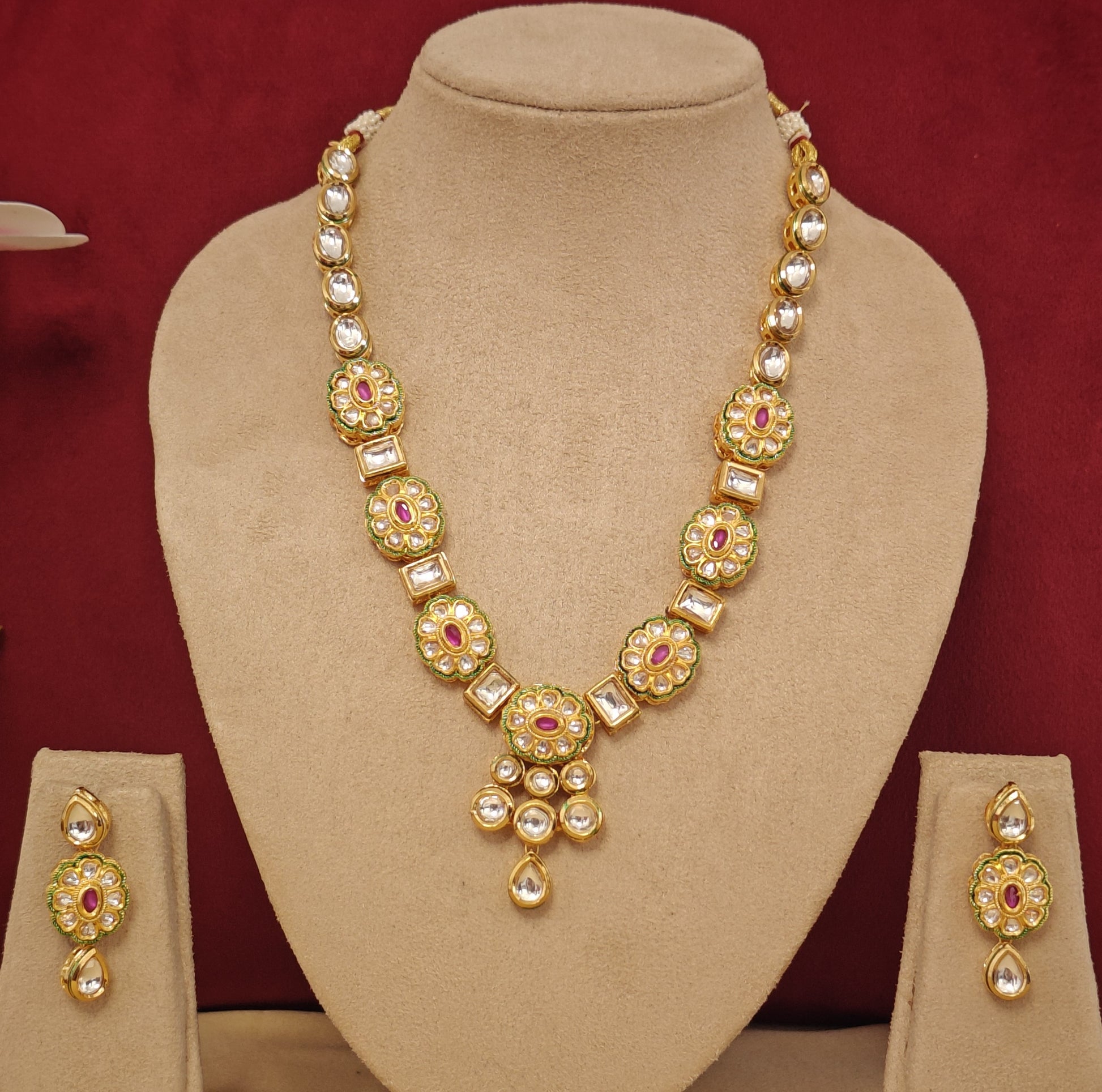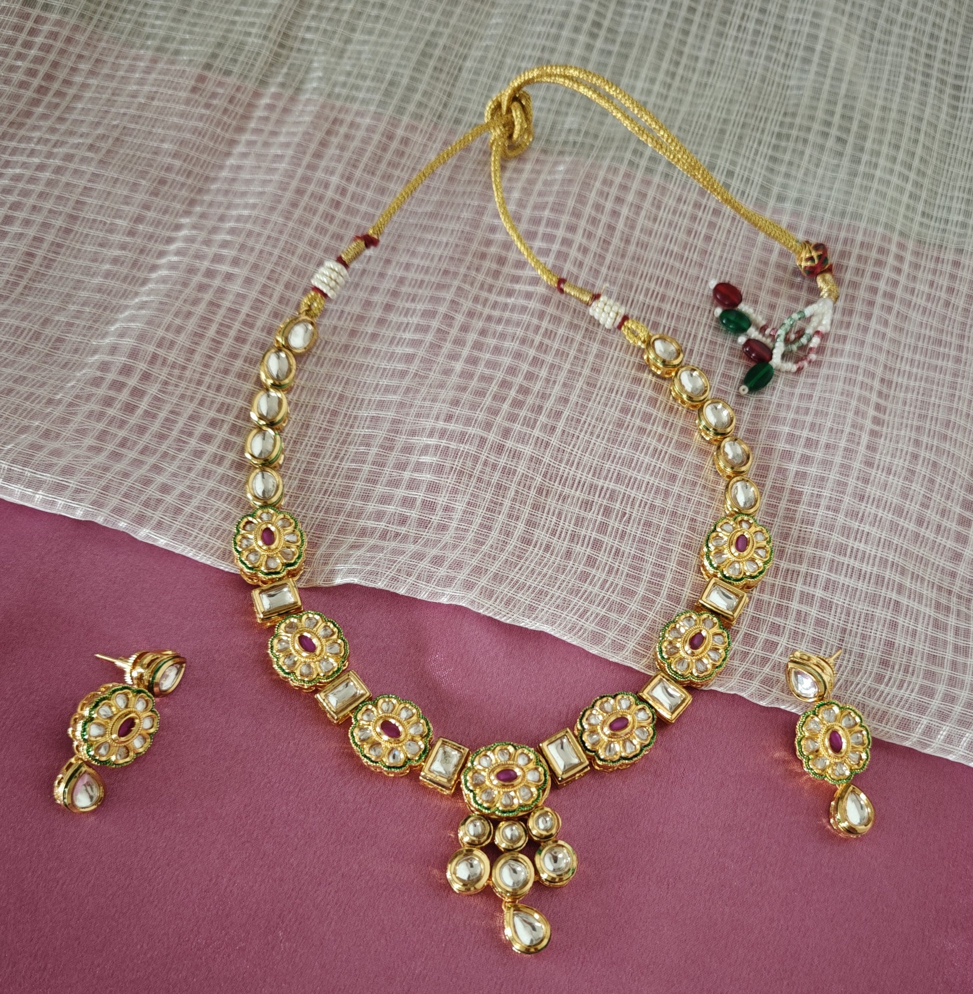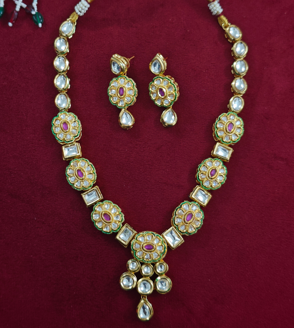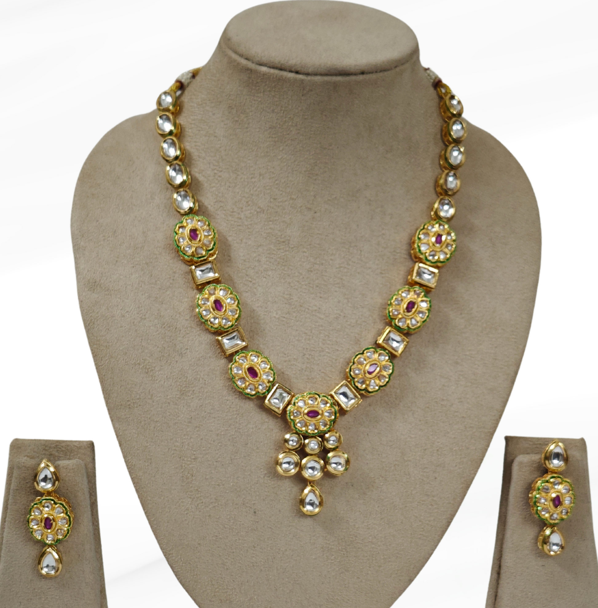 Crafted with precision, this single-layered Kundan jewellery set boasts intricate meenakari work and colored stones, perfect for complementing any attire. Whether paired with a heavy work saree or for a special occasion, its regal allure and timeless grace add sophistication to your style effortlessly.
