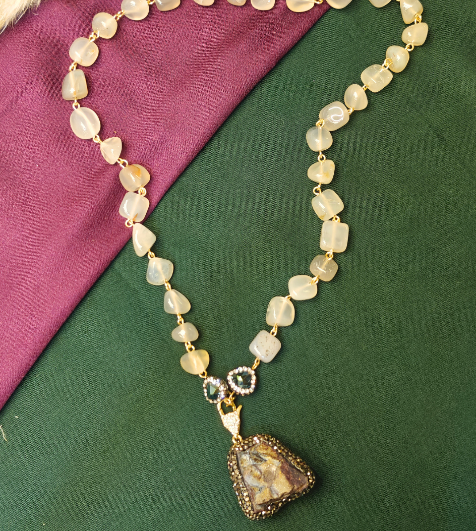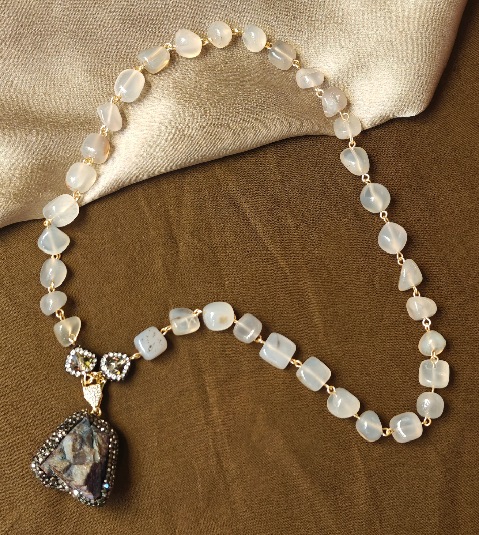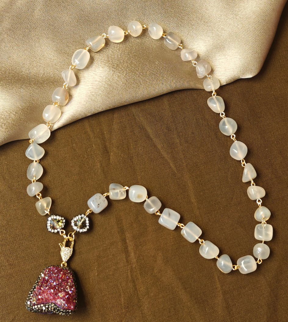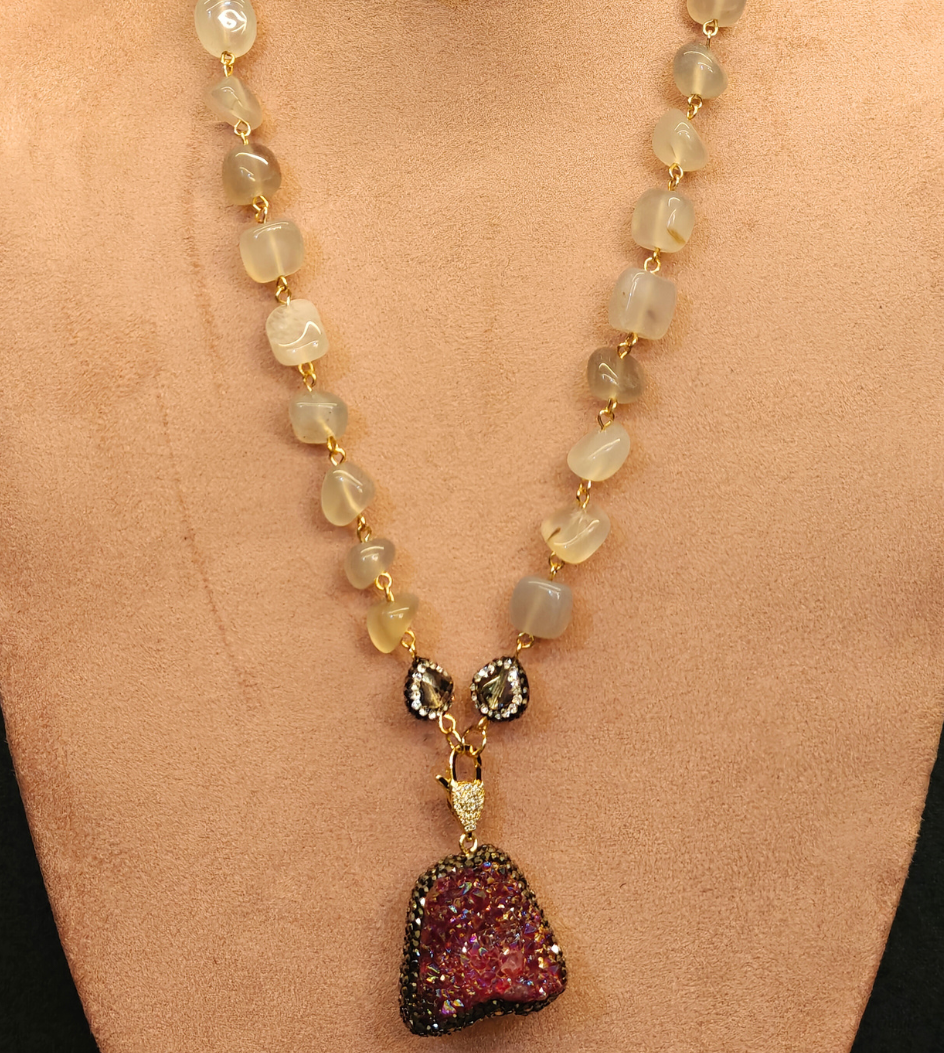 A truly one-of-a-kind piece, this handcrafted semi-precious necklace features uncut marcasite druzy agate stones with a sleek CZ lock for a modern touch of elegance. The focal agate stone is naturally dual-toned—one side reveals a soft pinkish hue, while the other showcases a cool bluish tone, offering versatile styling in a single piece. Each side tells a different story, allowing you to switch your look effortlessly. The pendant is thoughtfully designed to be removable, so you can pair it with other chains or wear it in different ways—including showcasing either side or placing it sideways for a more contemporary look. Because each stone is naturally unique and handcrafted, no two pieces are ever the same—making this necklace a rare and beautiful expression of nature’s artistry.