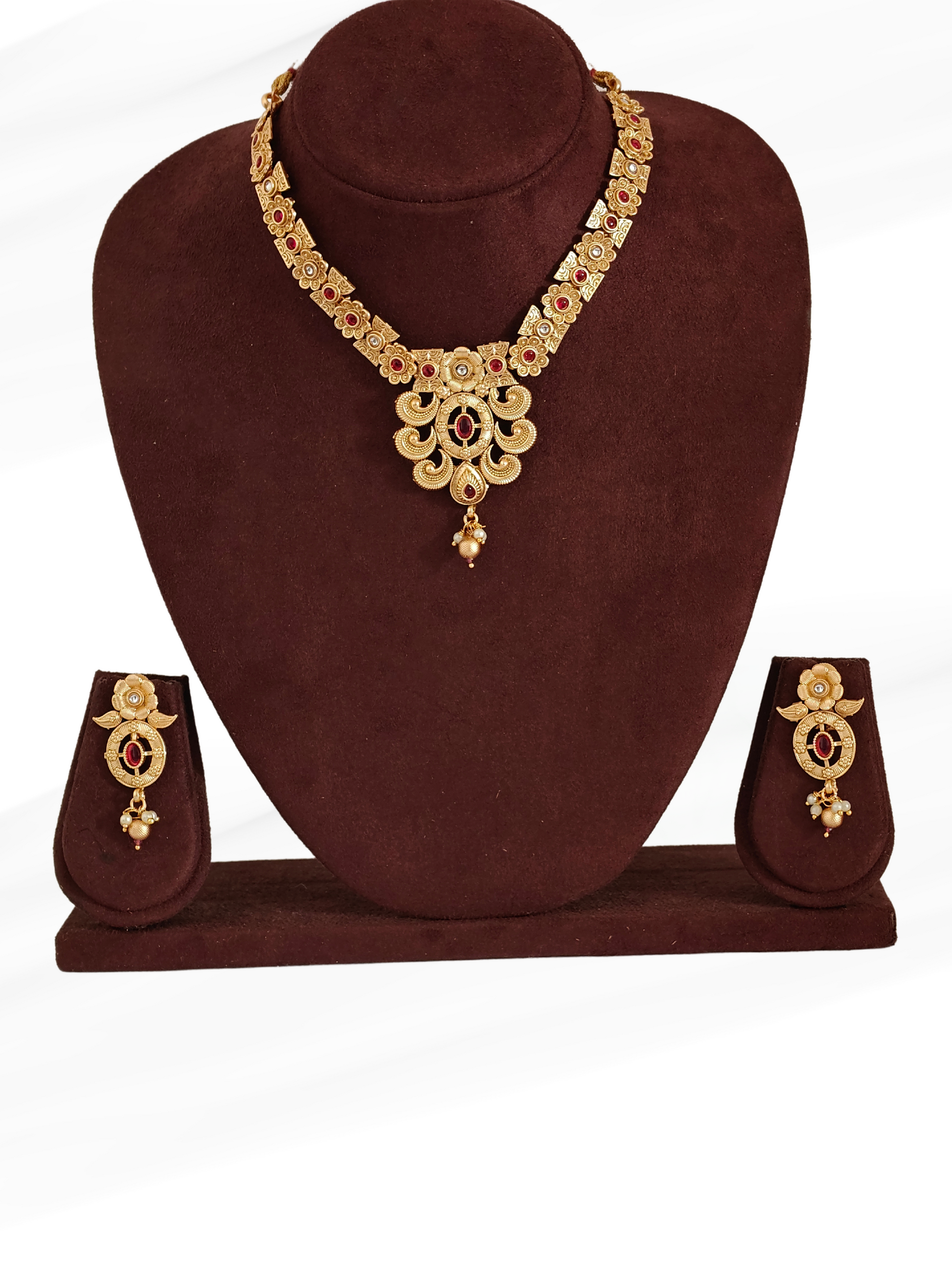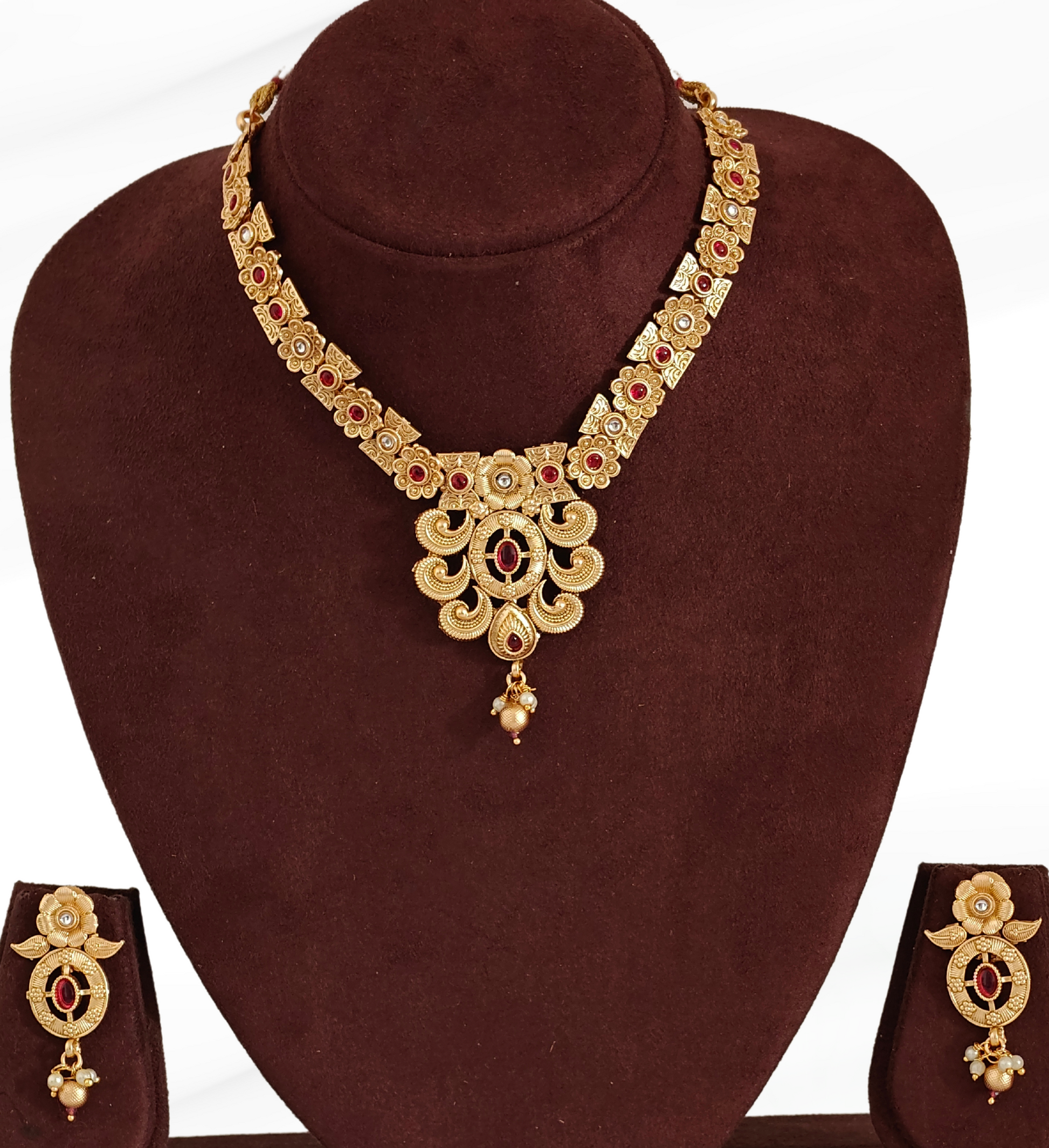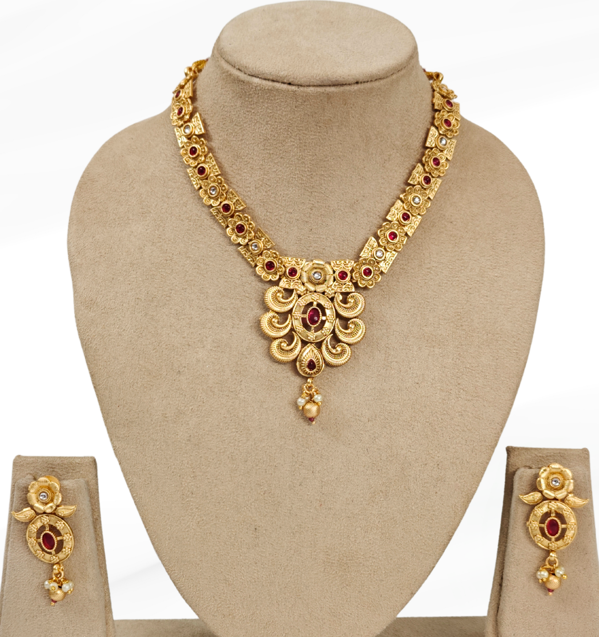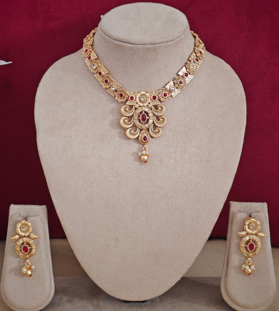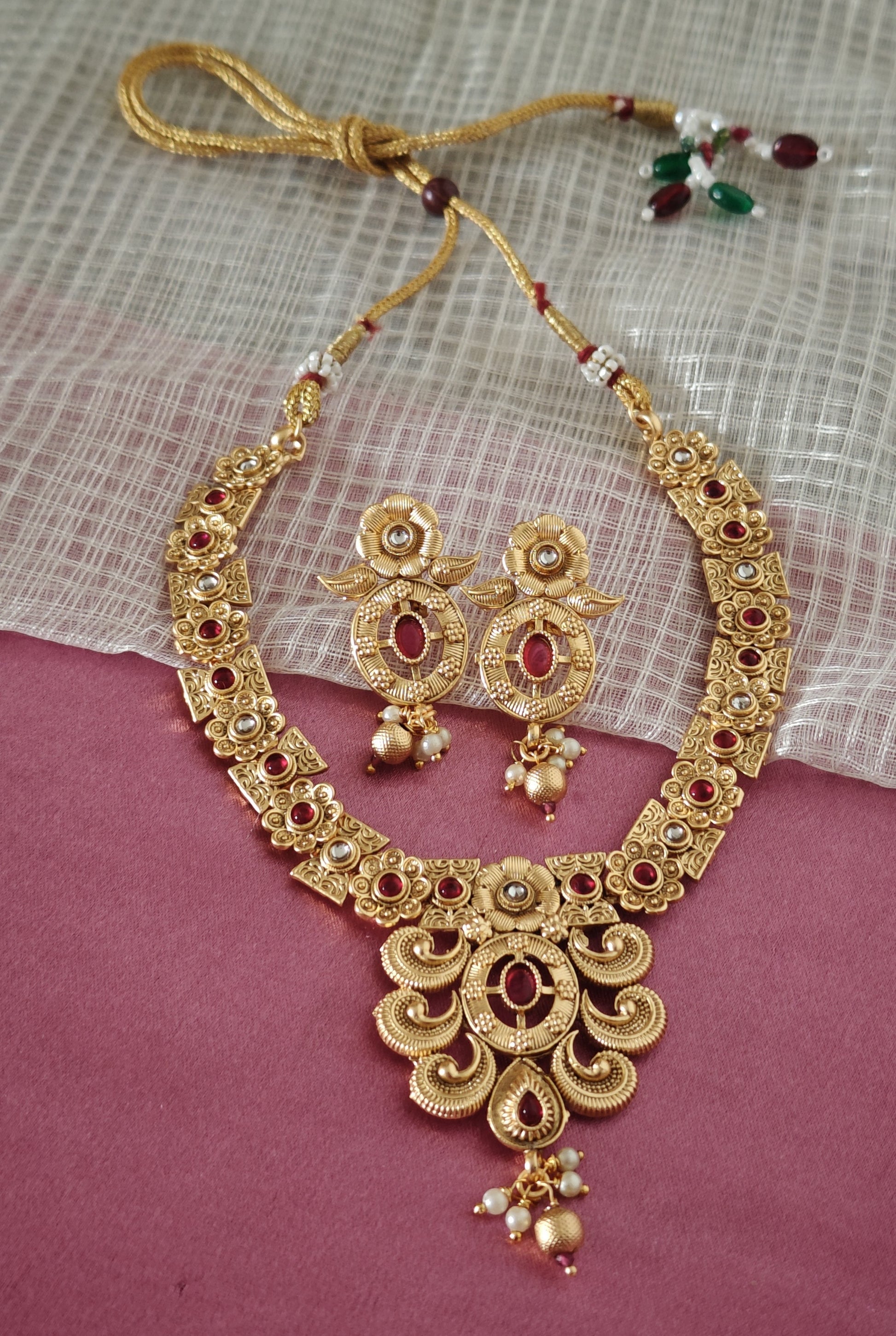 Enjoy the opulent beauty of this Rajwadi jewellery set. It's a beautiful blend of kundan stones and traditonal high gold plating with nice intricate design. This one is great for making a festive outfit look really special with a touch of royal charm. No scope that this can turn you down!!