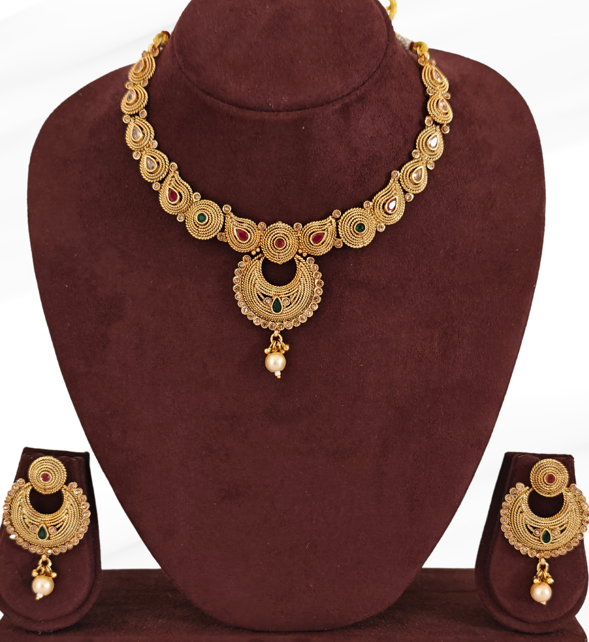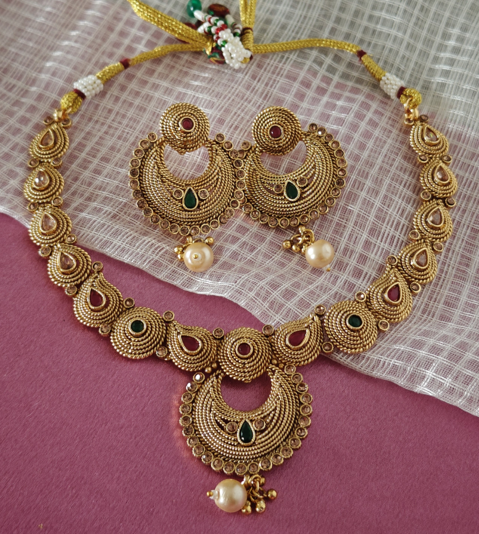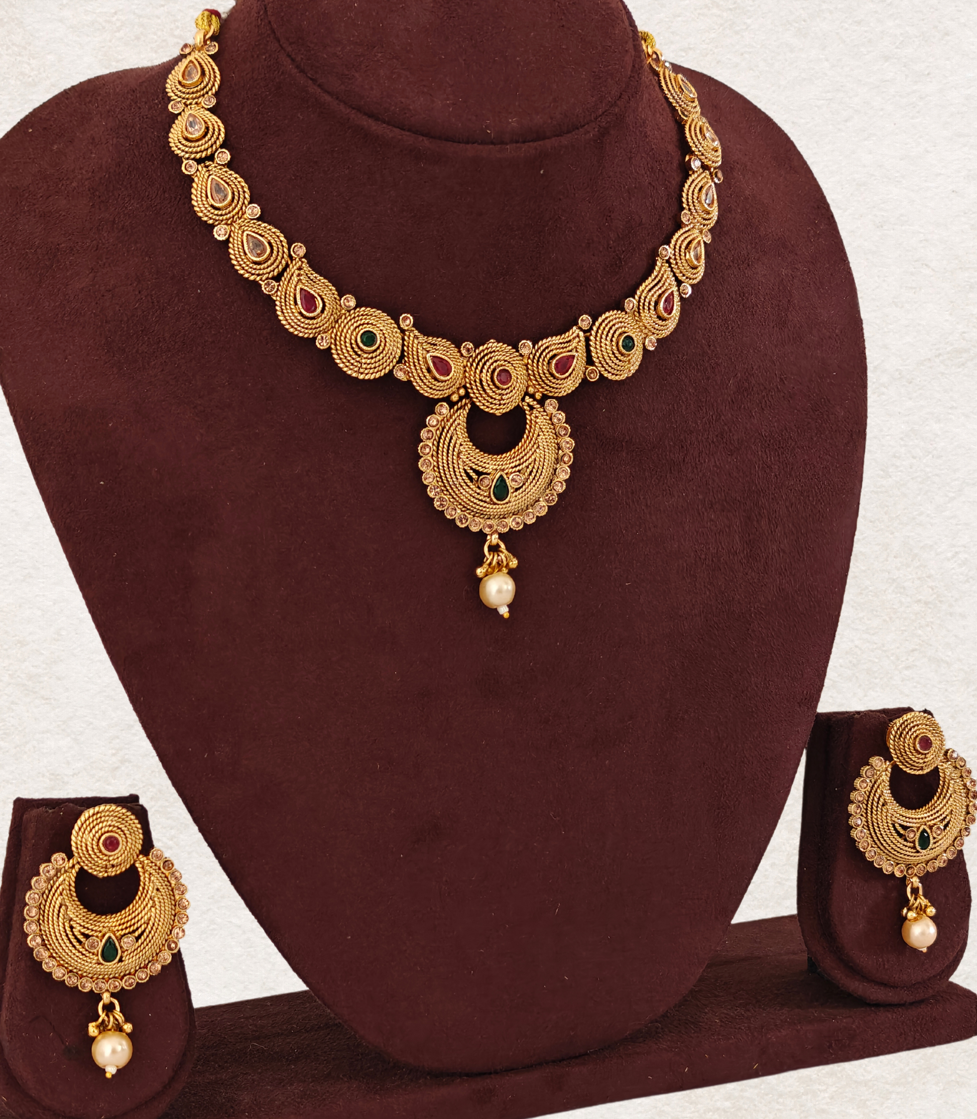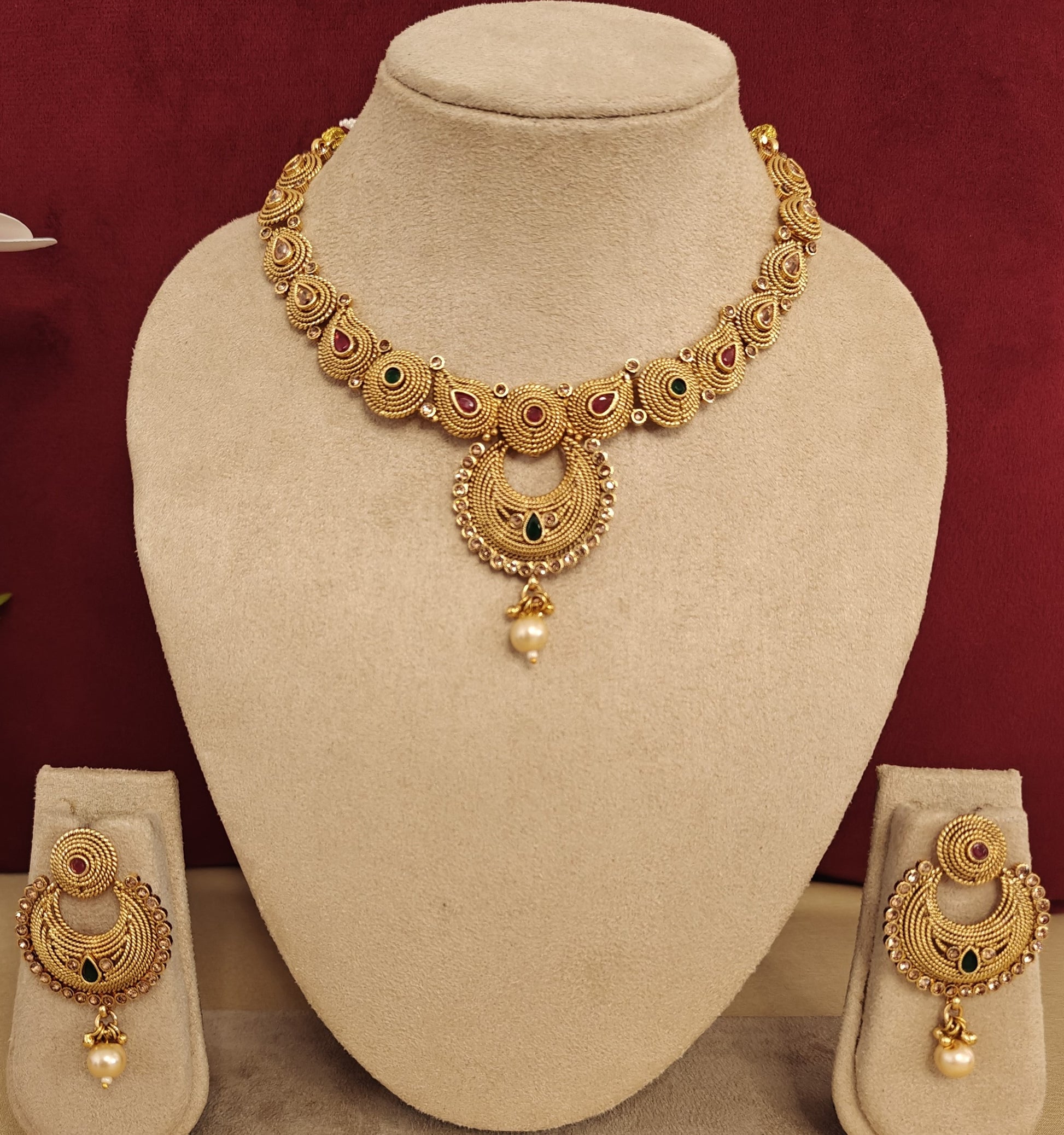 Indulge in the timeless elegance of this antique high gold-plated jewellery set. Each piece exudes classiness and charm, crafted with meticulous attention to detail. The radiant glow of the gold plating adds a touch of luxury, making this set a stunning addition to any ensemble.