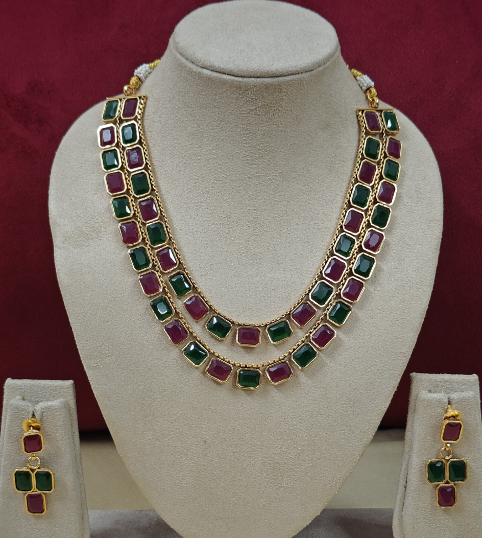 Presenting our exquisite two-layered jewellery set adorned with captivating Monalisa stones, meticulously crafted to enhance your style. Vibrant hues and sparkling bicolor stones create a mesmerizing effect, while its dual-layered design adds depth and allure, suitable for any occasion. Versatile and chic, it ensures your style radiates with sophistication.