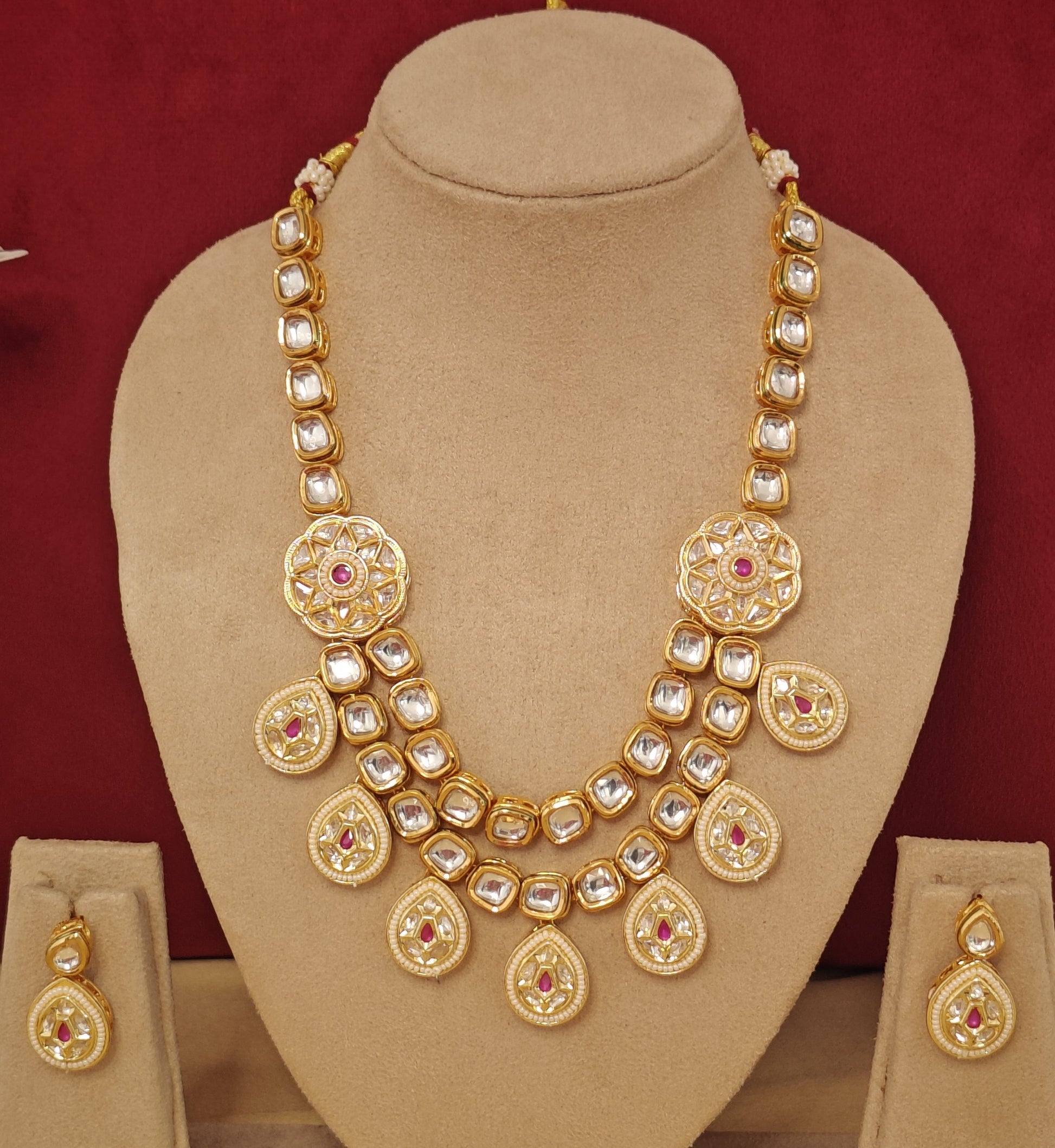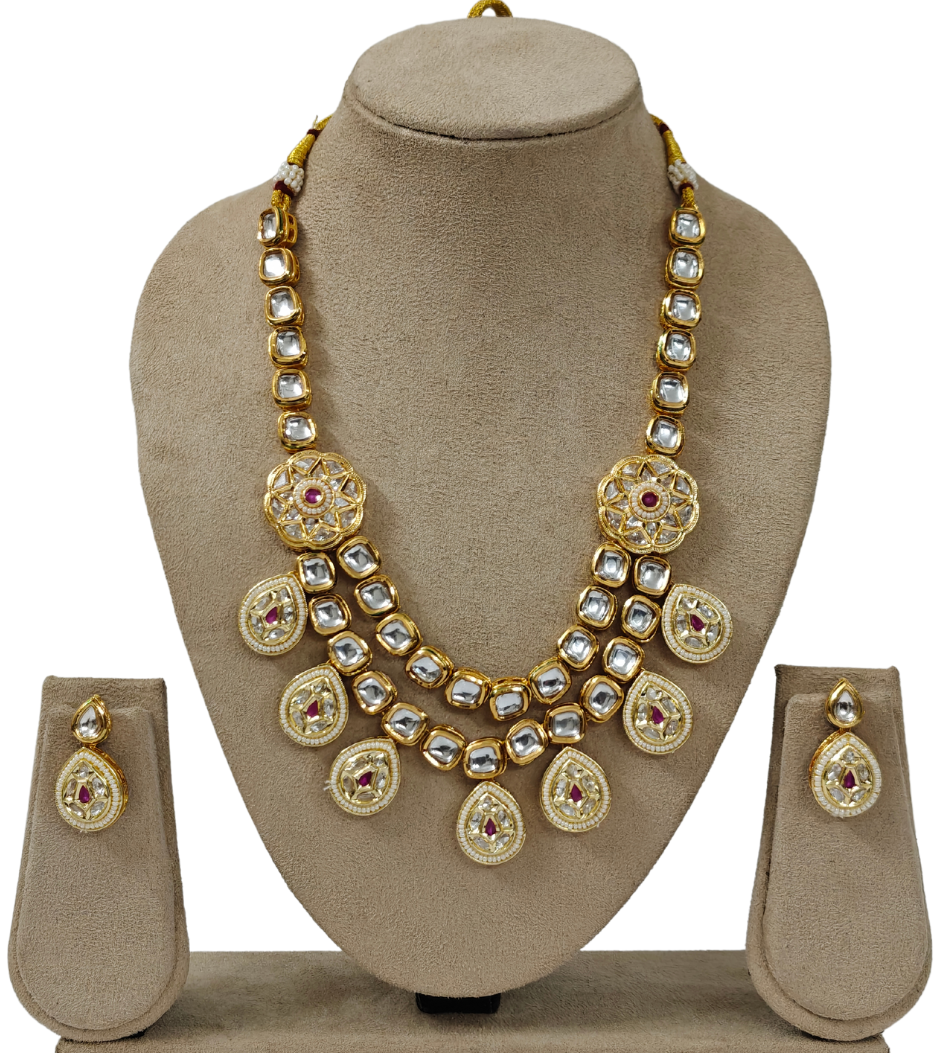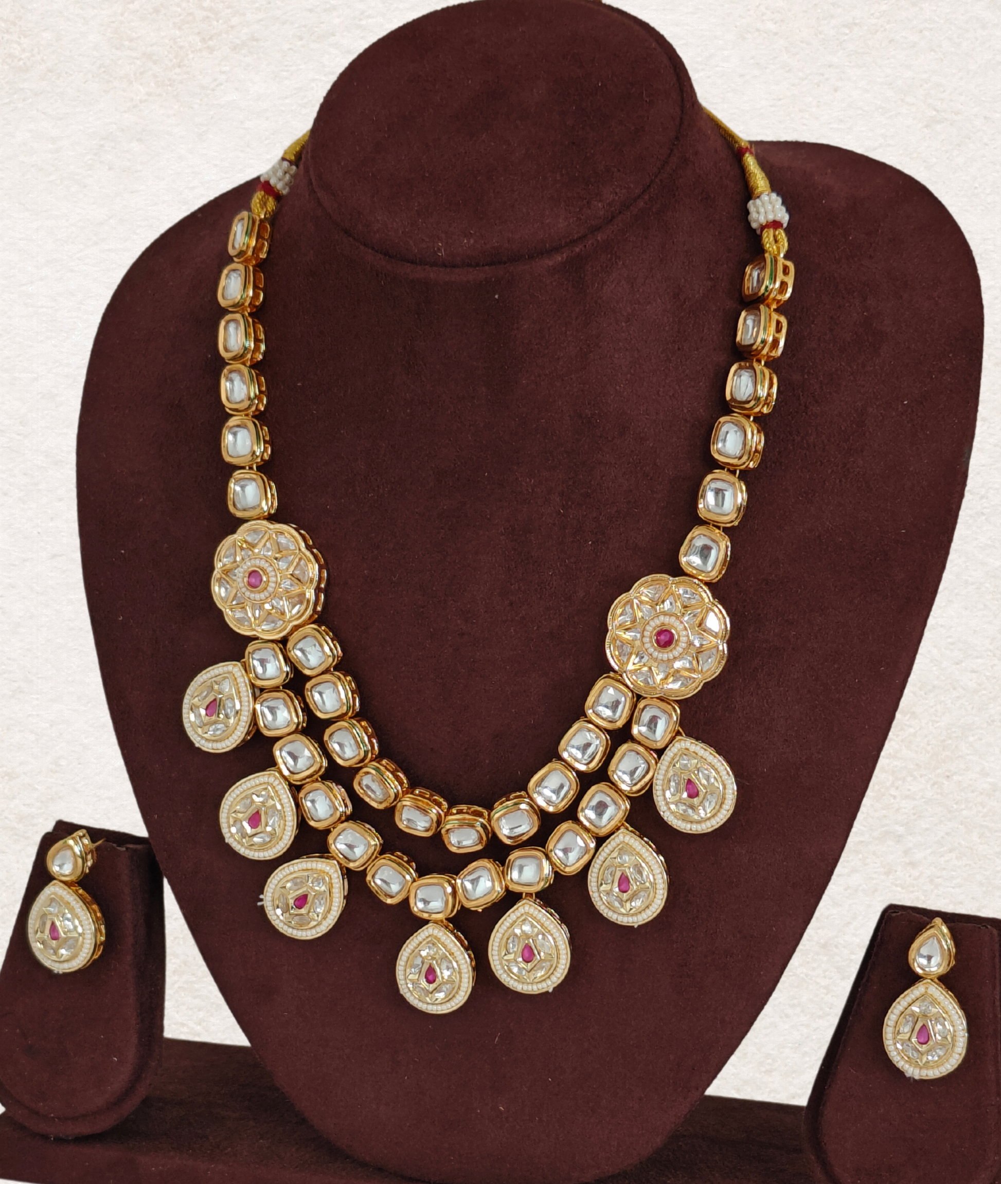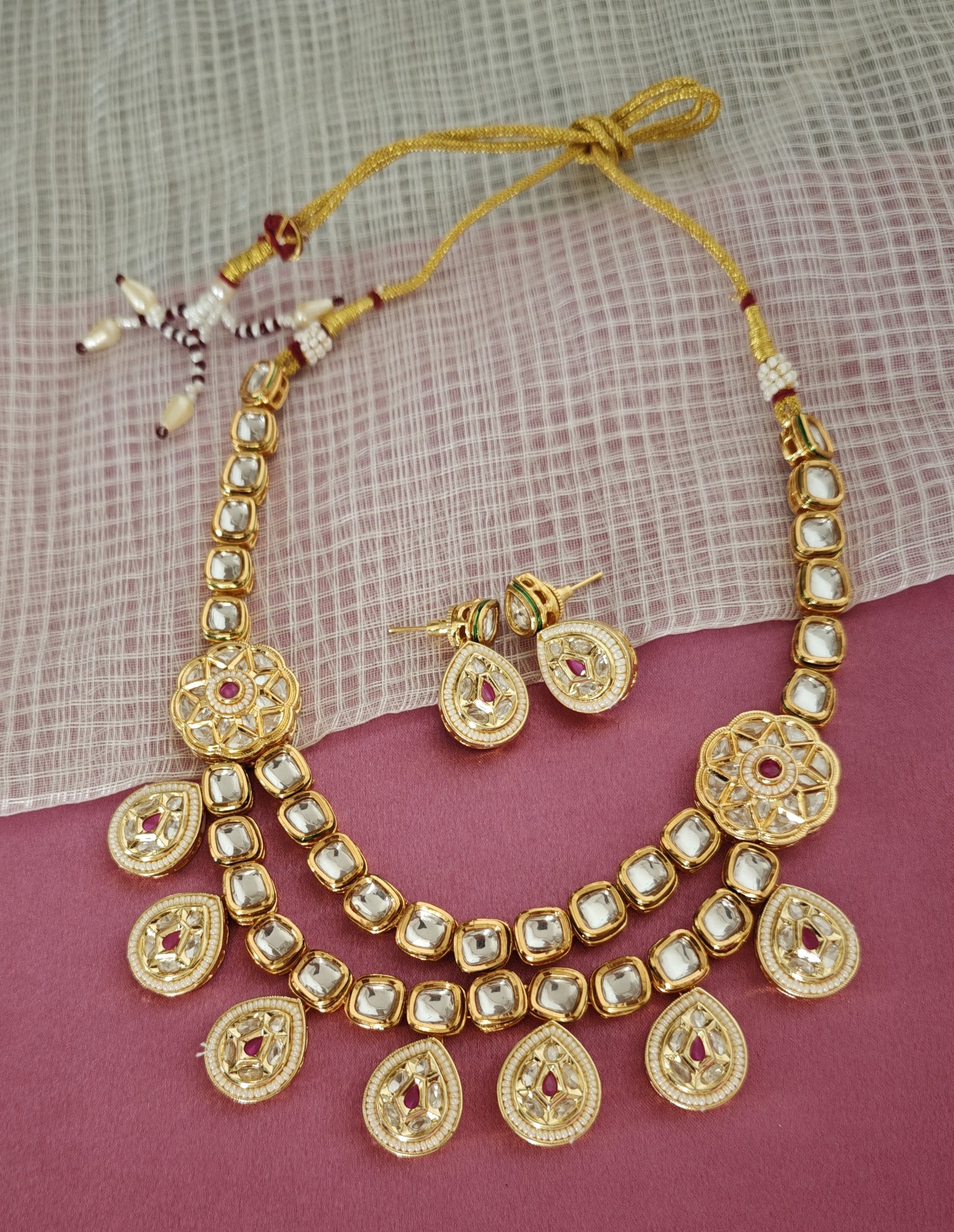 Say hello to our beautiful two-layered Kundan Jewelry, featuring shiny white beads, a mix of traditional charm and grace. The detailed Kundan designs, brings out its timeless beauty and sophistication. It's just what you need to add a touch of royal elegance to any outfit, promising to make you look absolutely stunning.