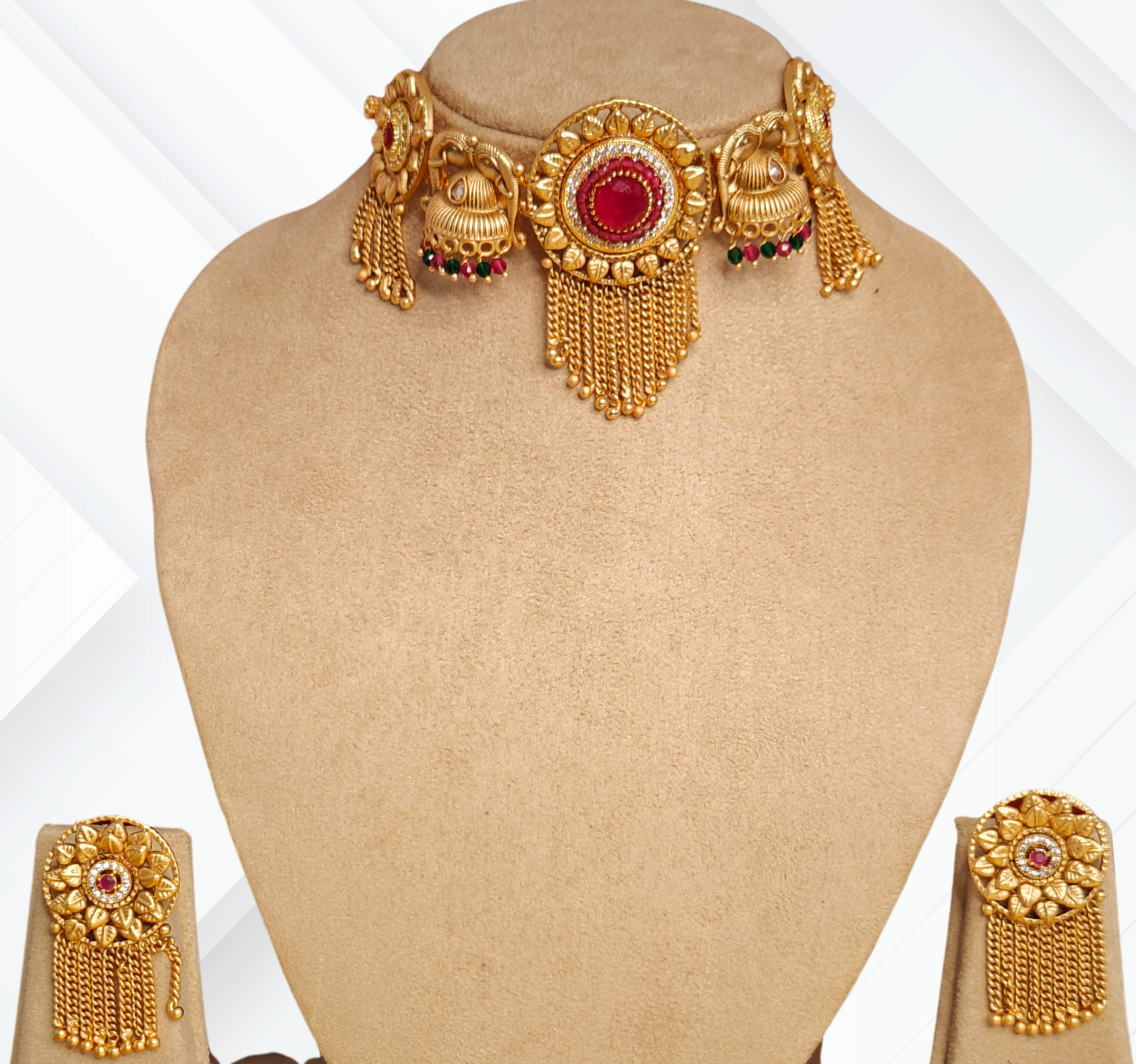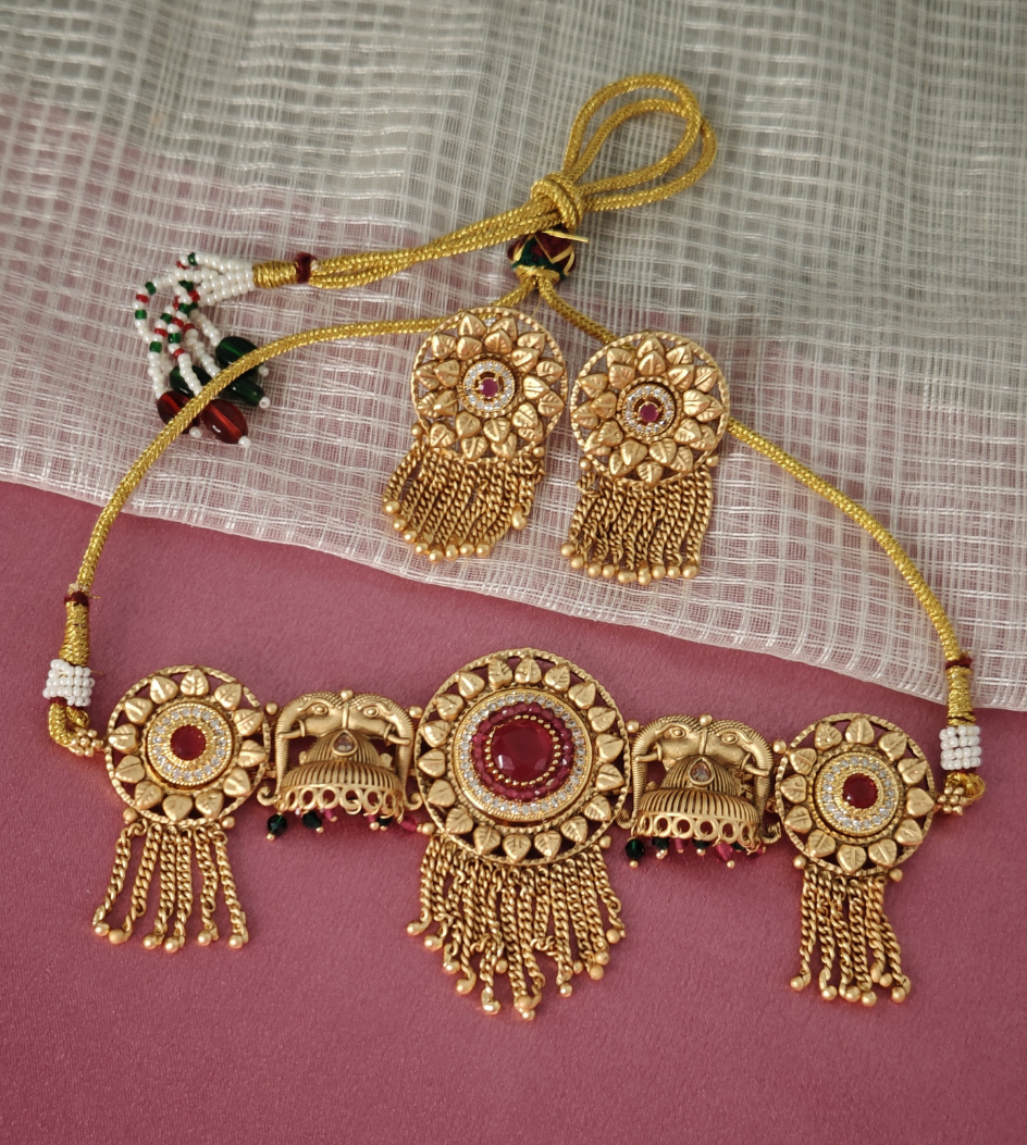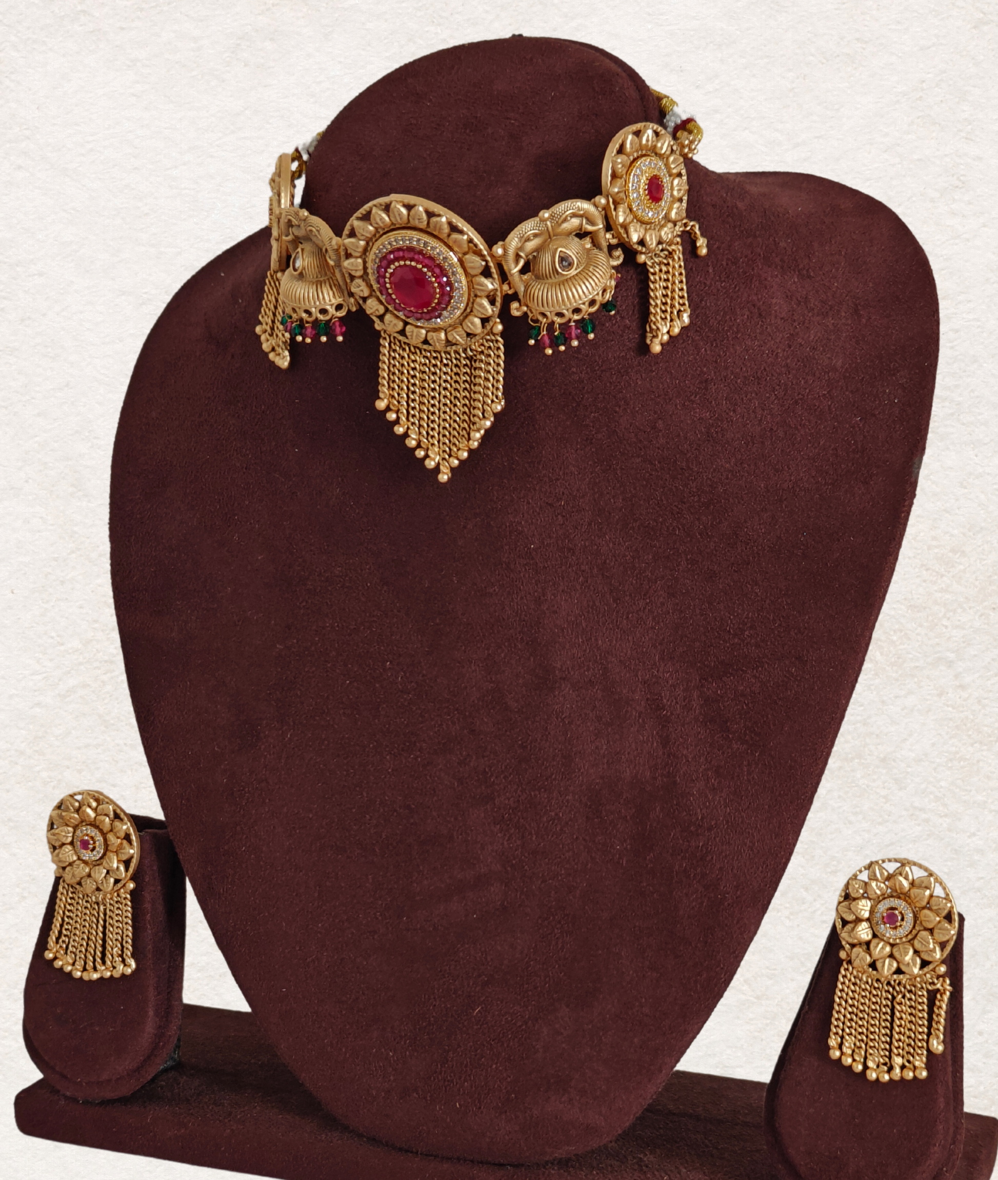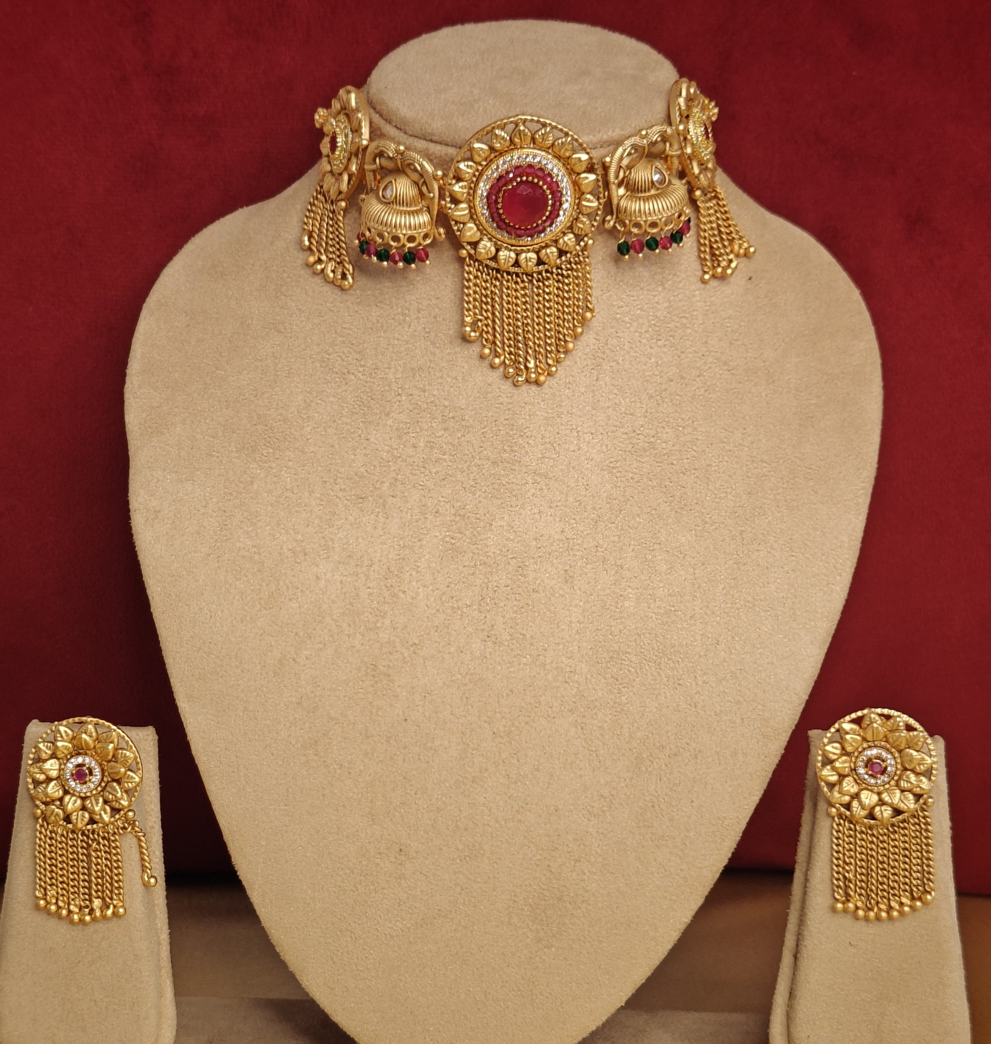 This beautiful blend of old and new style shows elegance, beauty and luxury. The attractive Cubic Zirconia stones add to the charm of this outfit. It's carefully crafted to impress and catch attention. Ideal to be worn with traditional clothes.
