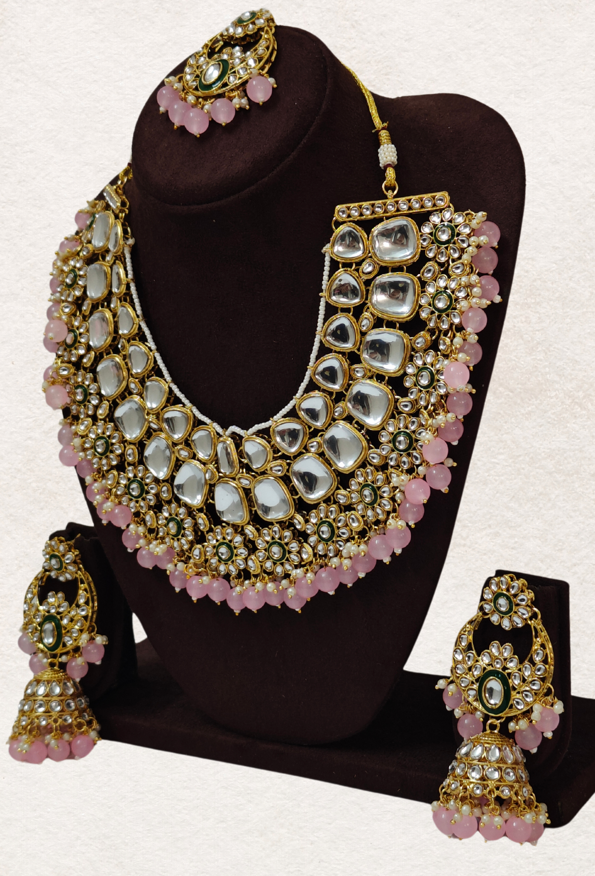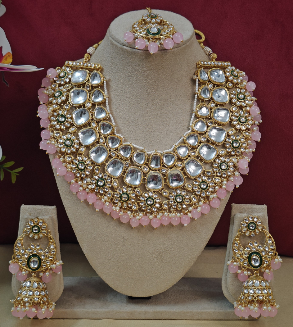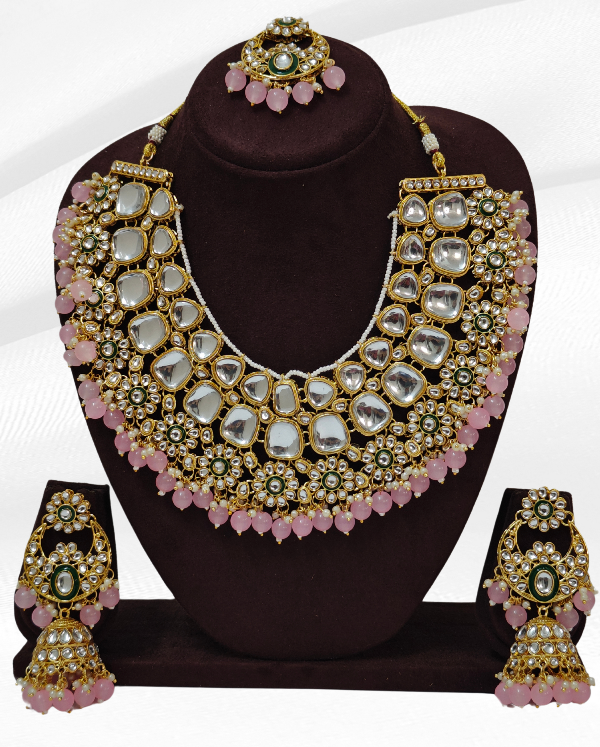 This kundan necklace set with meenakari work and pearl detailing, truly stands out in a crowd. Perfect to be worn on heavy outfits like saree, lehenga for any wedding related functions; it adds a touch of class, ensuring you receive many compliments for this stylish accessory. The substantial earrings it accompanies lend a bold statement to the ensemble.