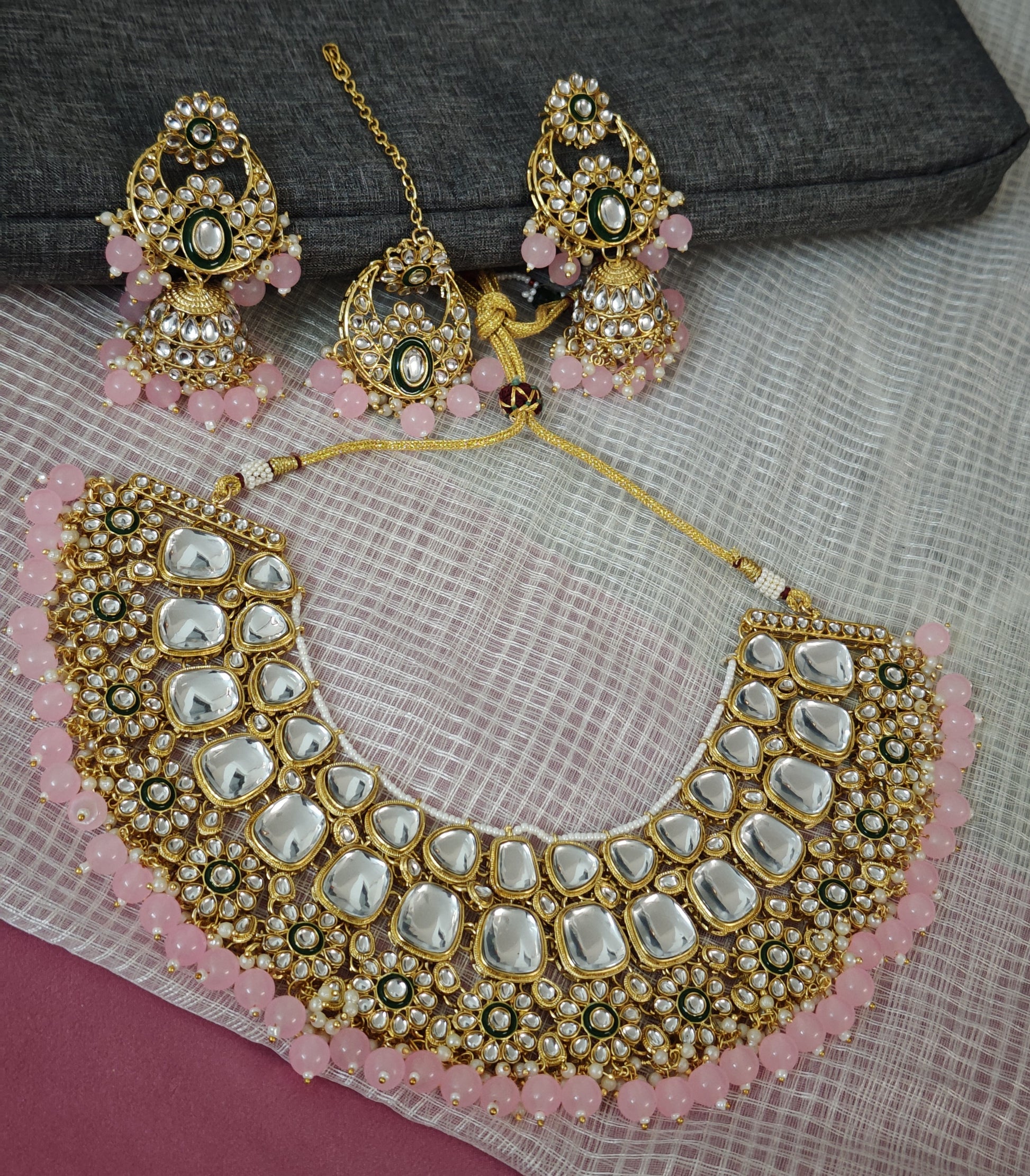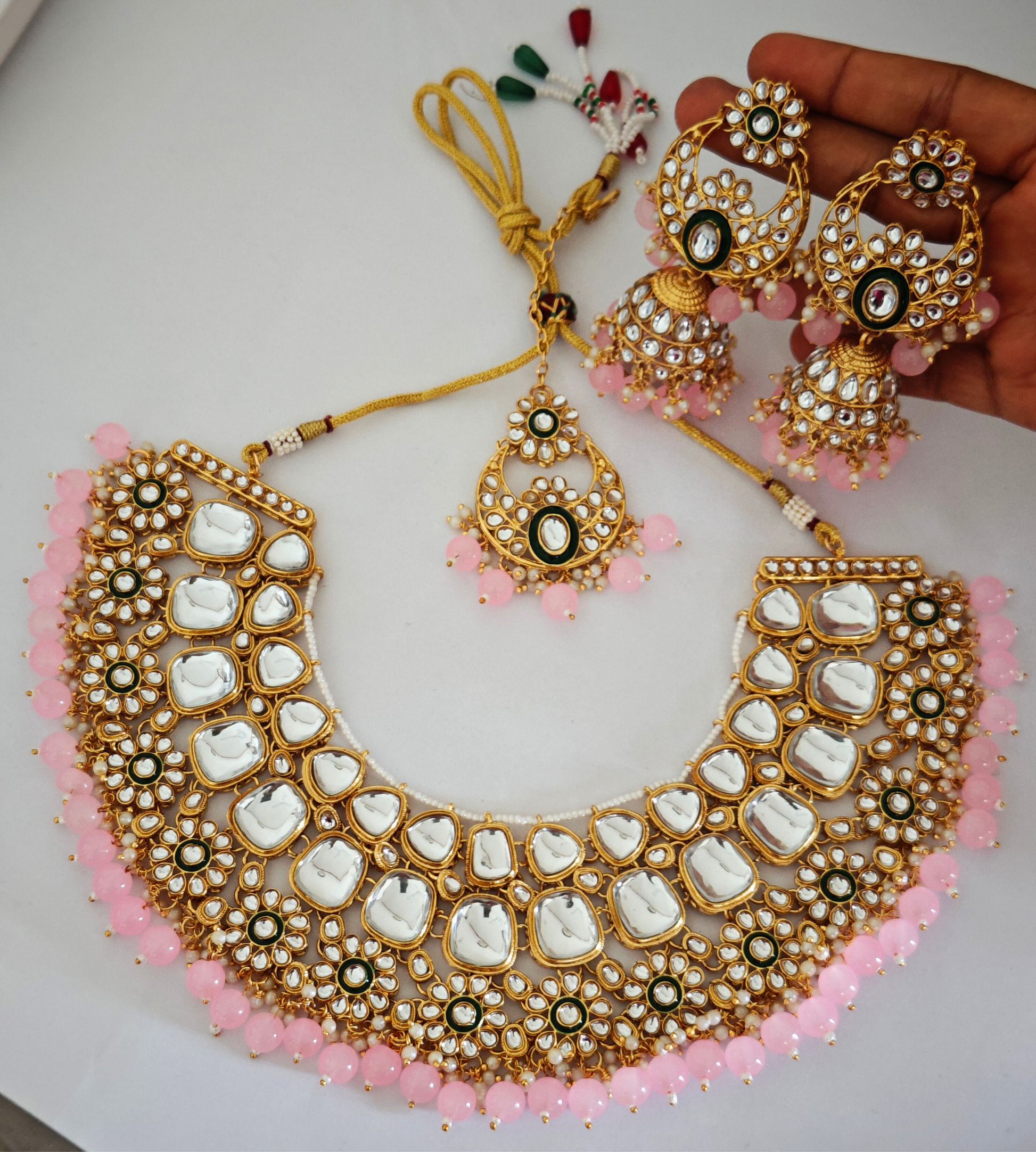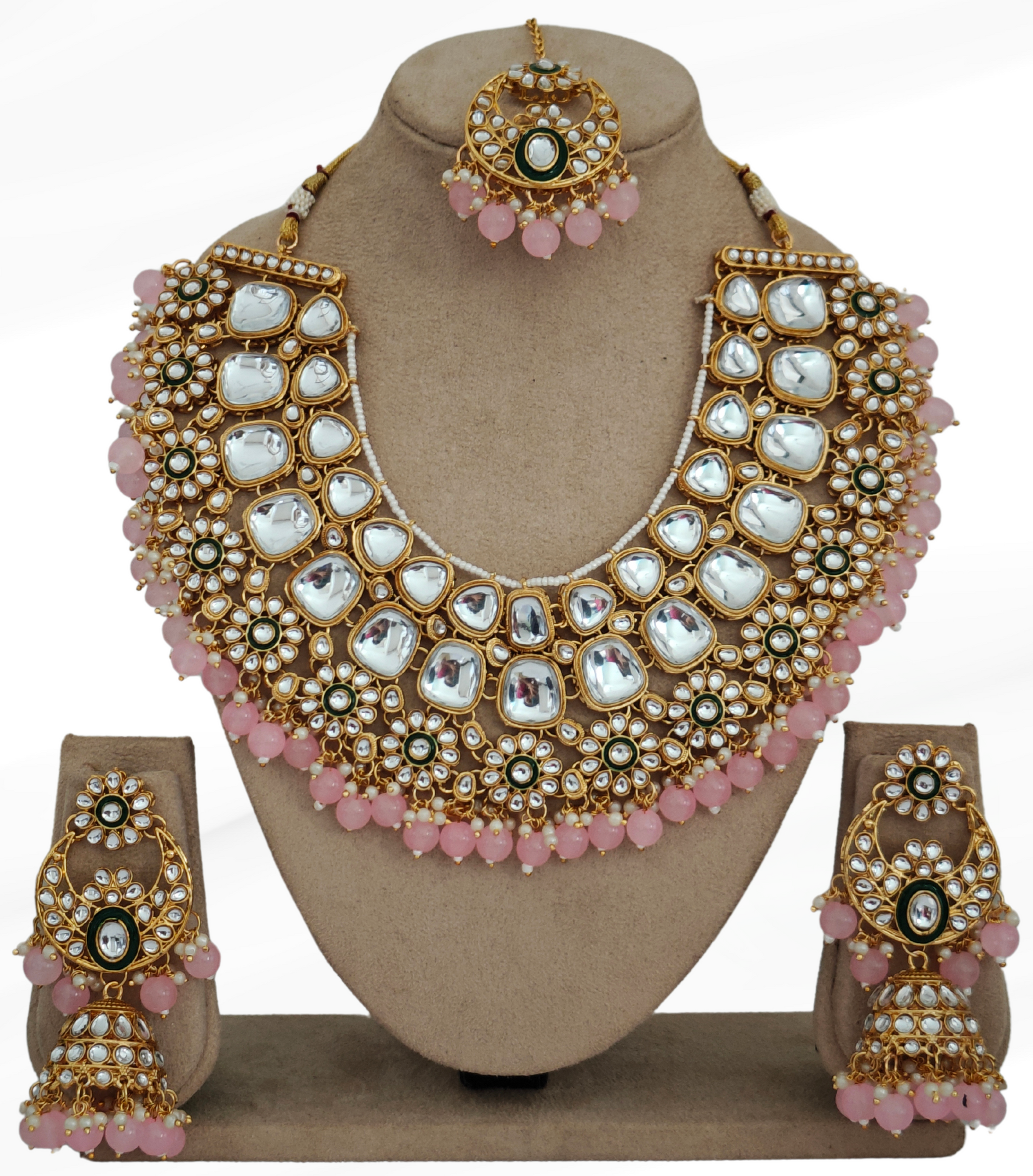 This kundan necklace set with meenakari work and pearl detailing, truly stands out in a crowd. Perfect to be worn on heavy outfits like saree, lehenga for any wedding related functions; it adds a touch of class, ensuring you receive many compliments for this stylish accessory. The substantial earrings it accompanies lend a bold statement to the ensemble.