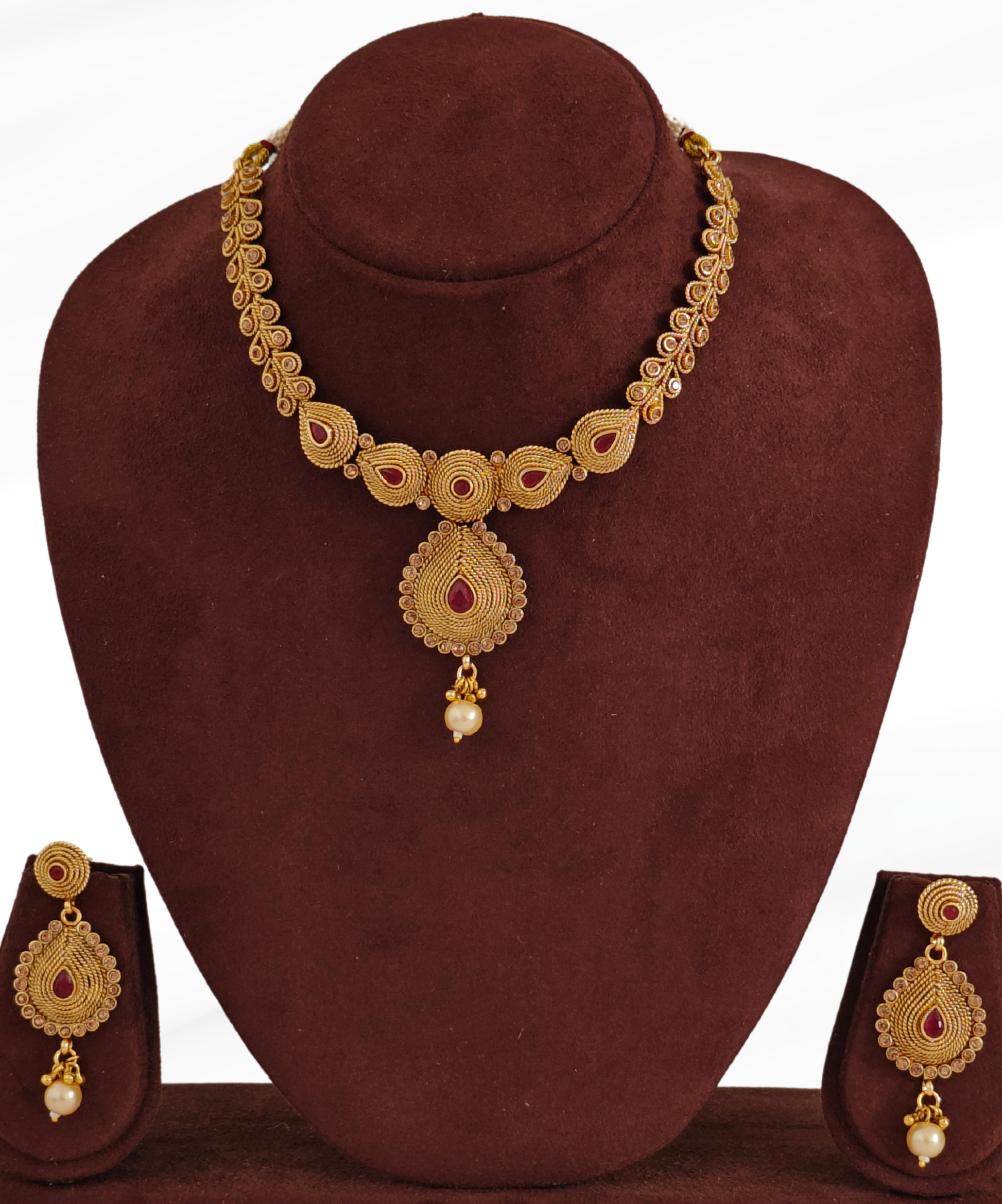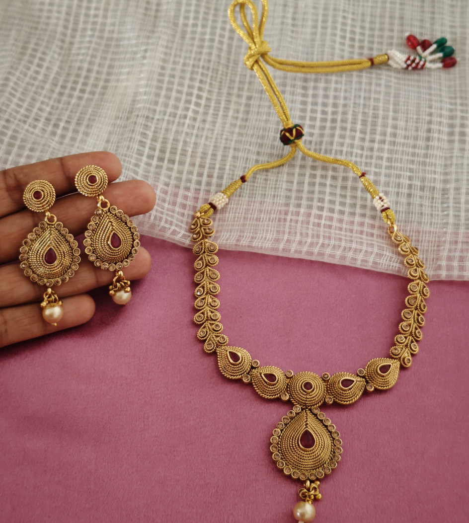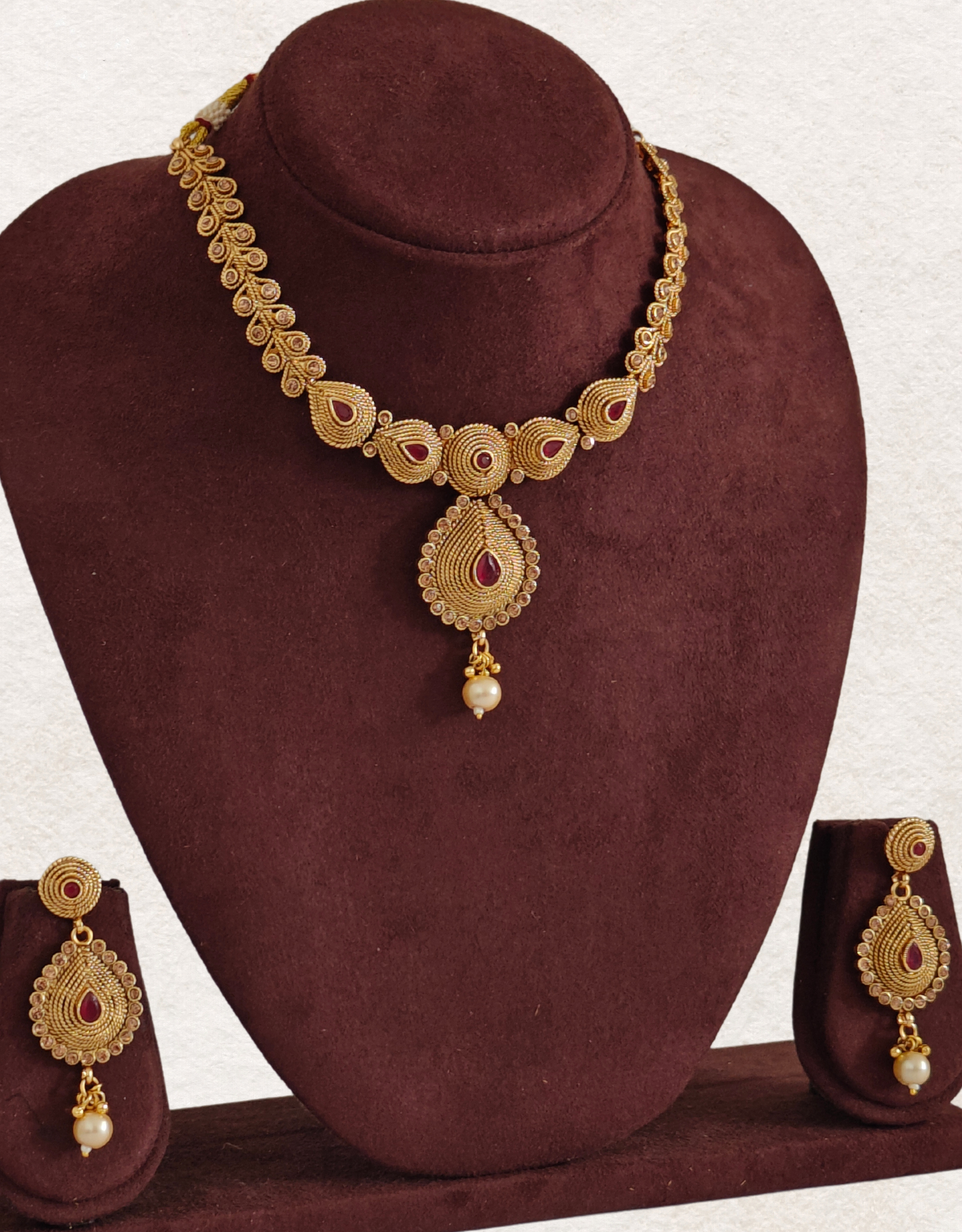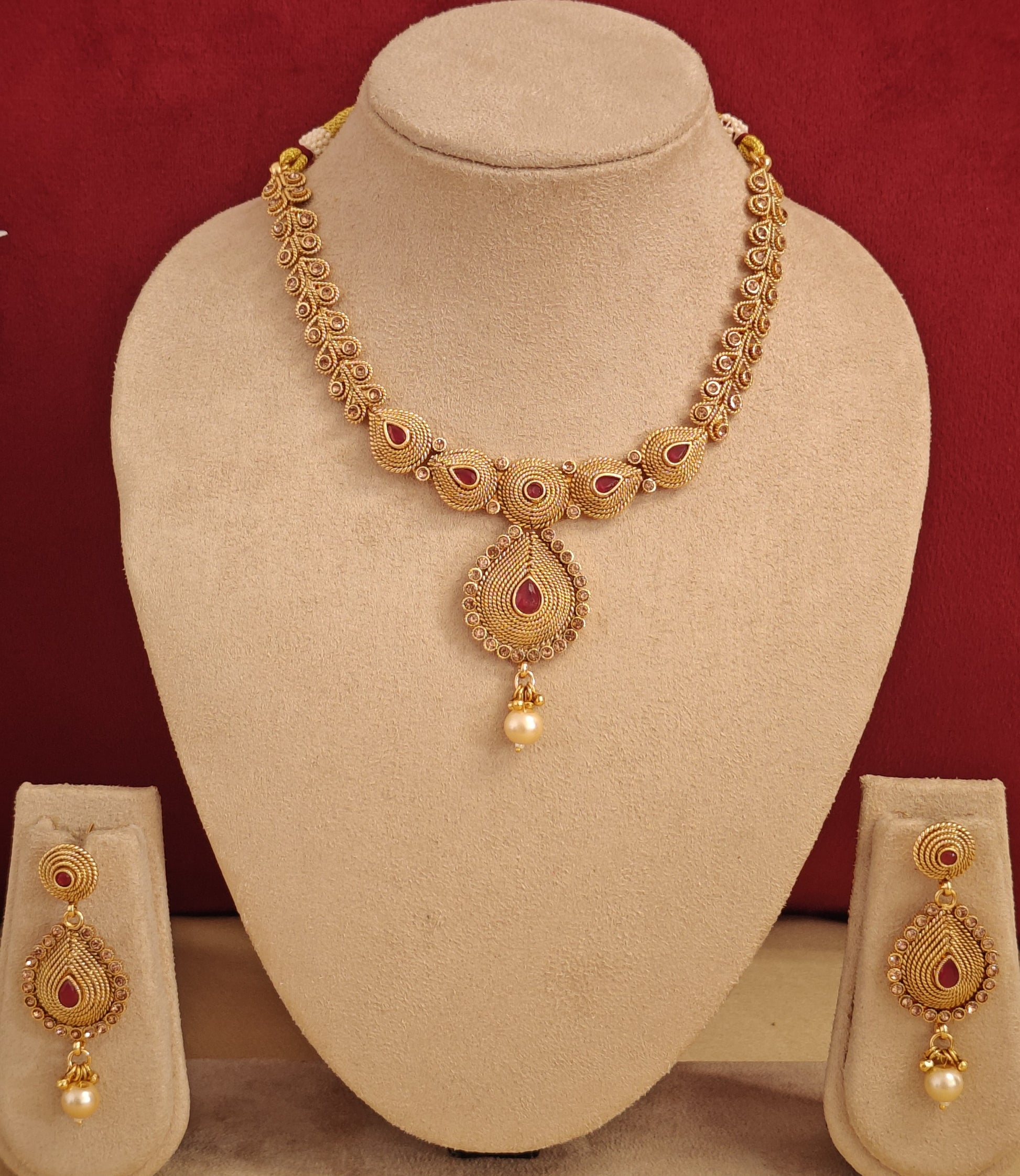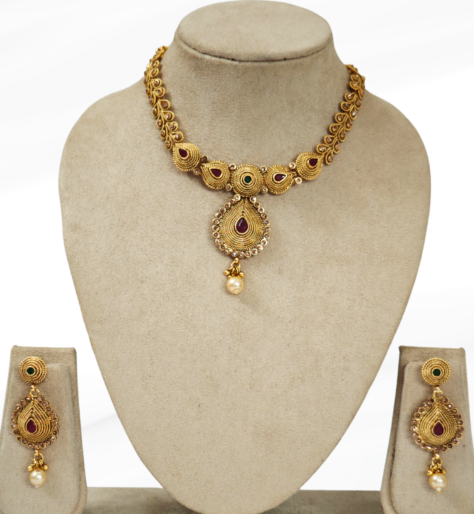 Indulge in the timeless elegance of this antique high gold-plated jewellery set. Each piece exudes classiness and charm, crafted with meticulous attention to detail. The radiant glow of the gold plating adds a touch of luxury, making this set a stunning addition to any ensemble.