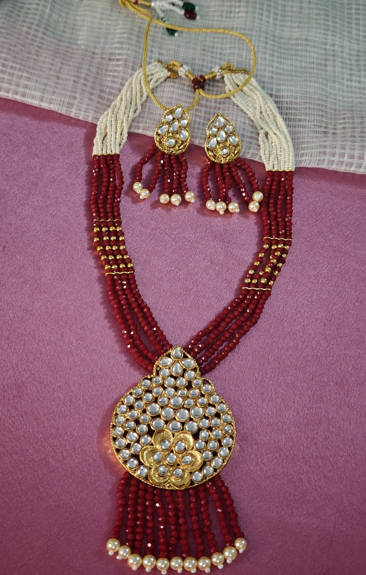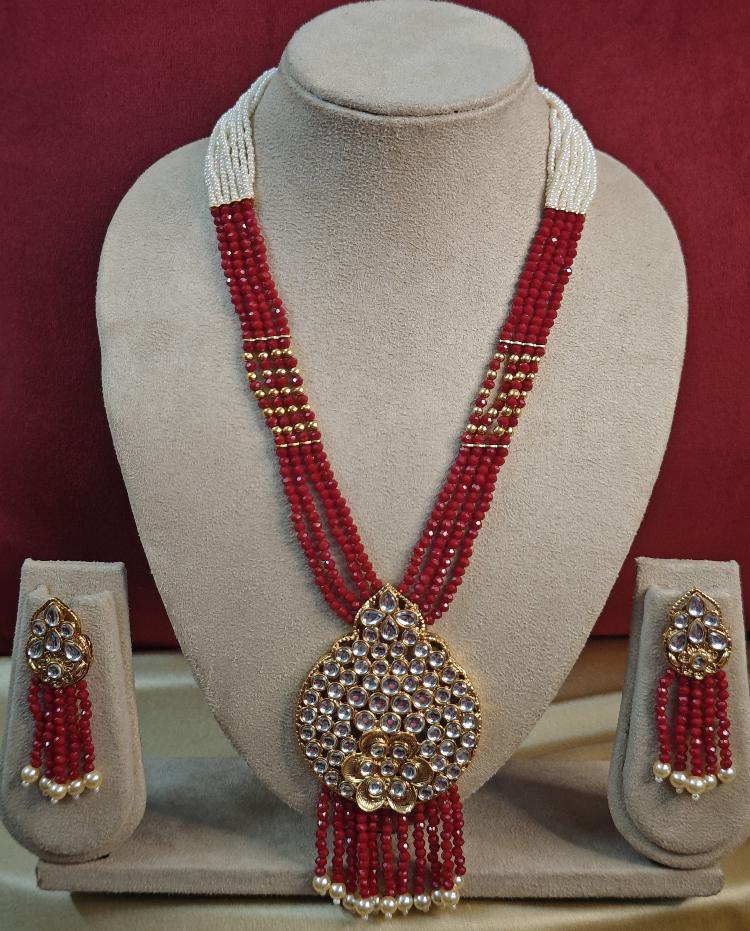 This long mala jewellery set adorned with lustrous pearl beads. The carefully crafted kundan stones and colorful embellishments make it look captivating, sure to get lots of attention and compliments.