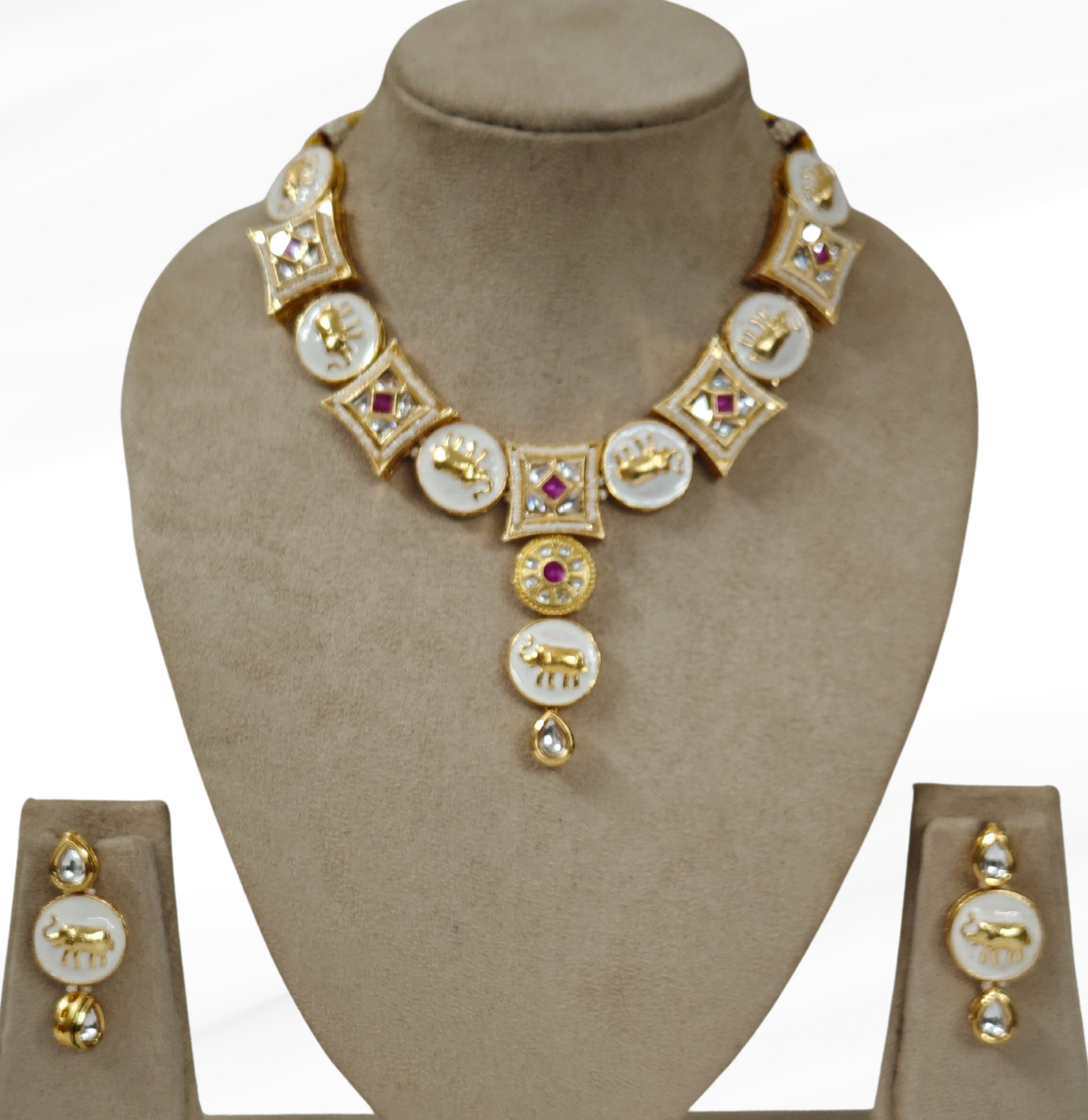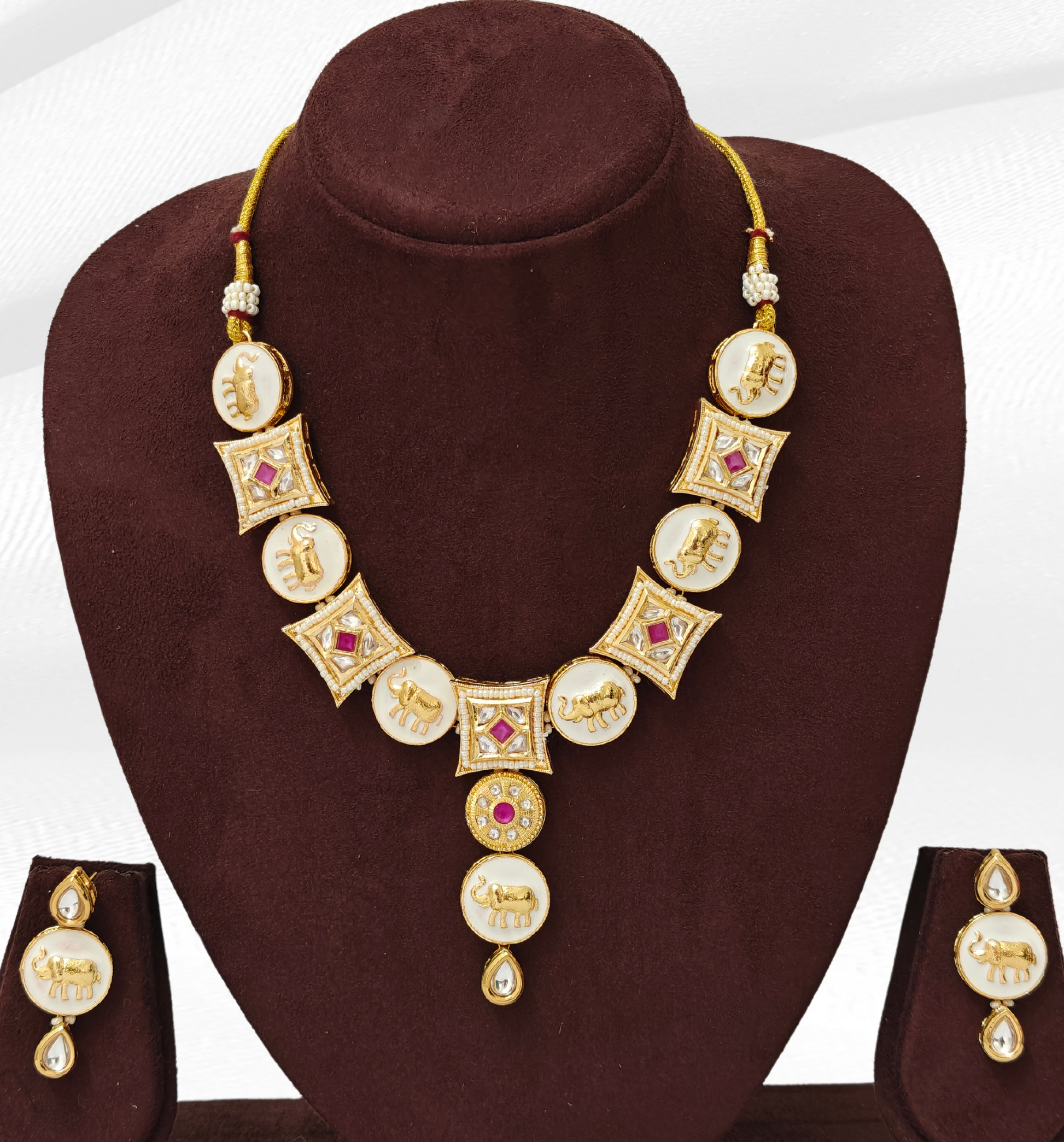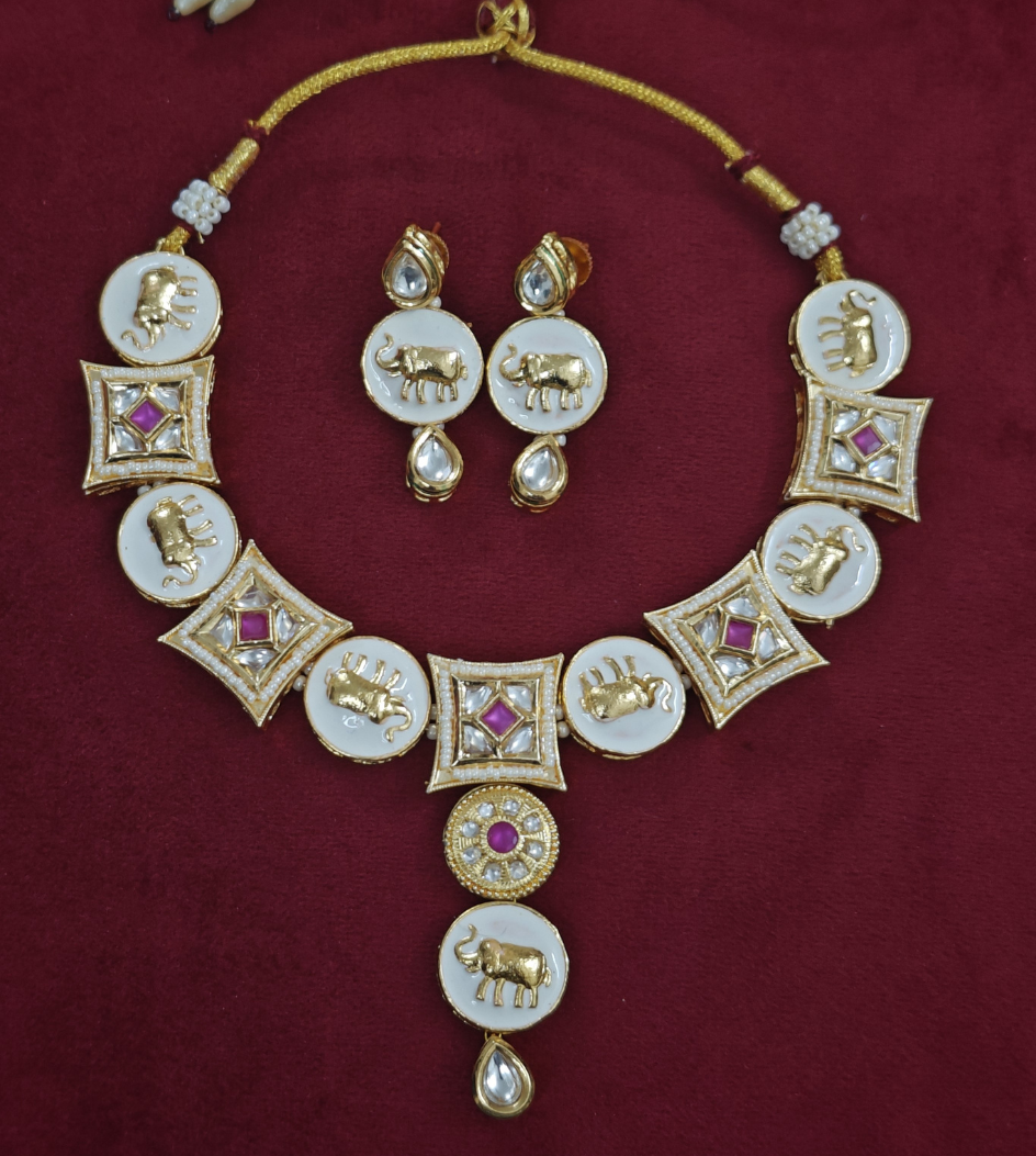 Check out our beautiful kundan jewellery set with back meenakari work, made for people who like classy things. It goes well with sarees, dresses and other outfits for any event. This set makes you look elegant, with its extraordinary design and pretty details like colored stones, white beads, gold decoration and elephant design.