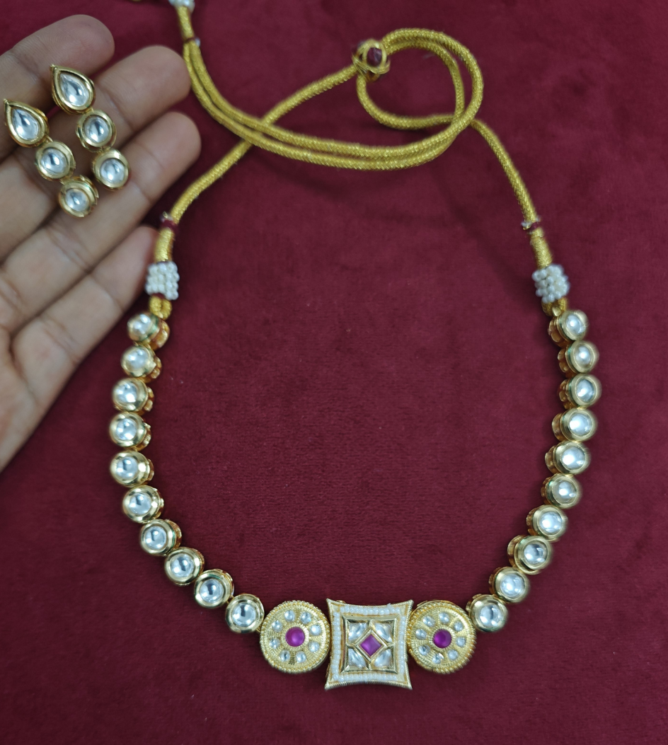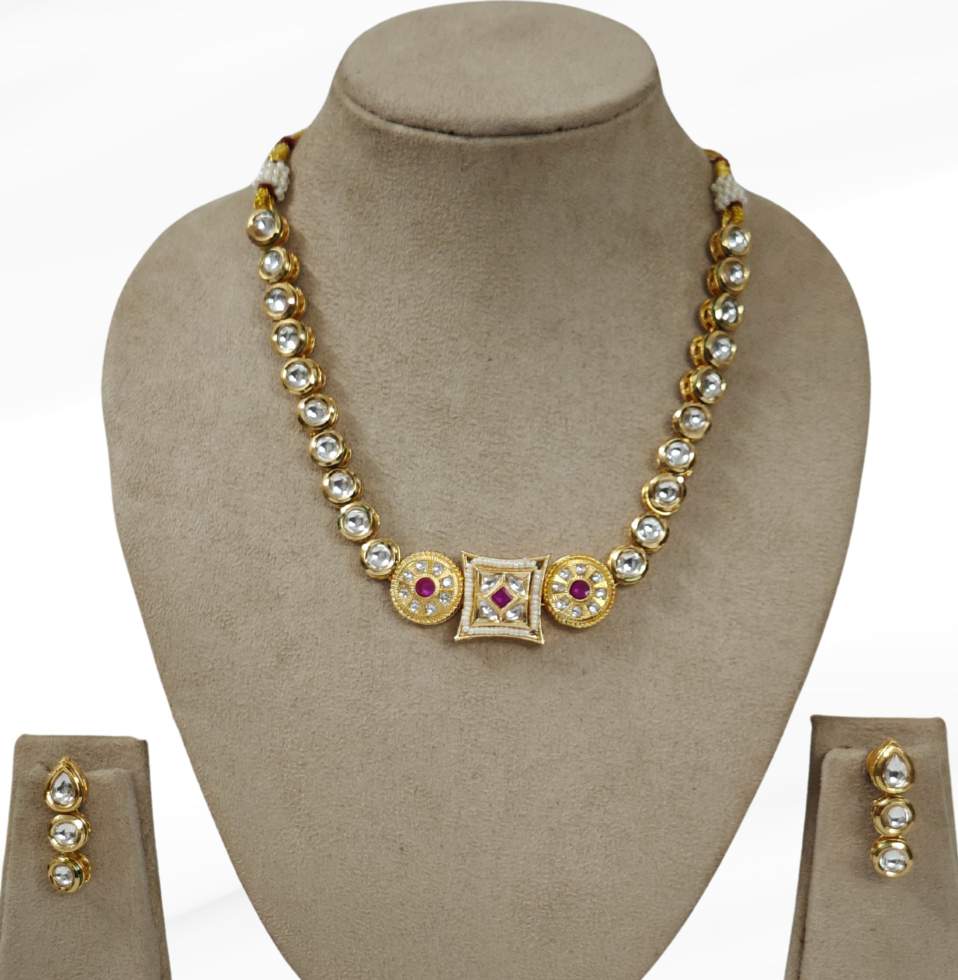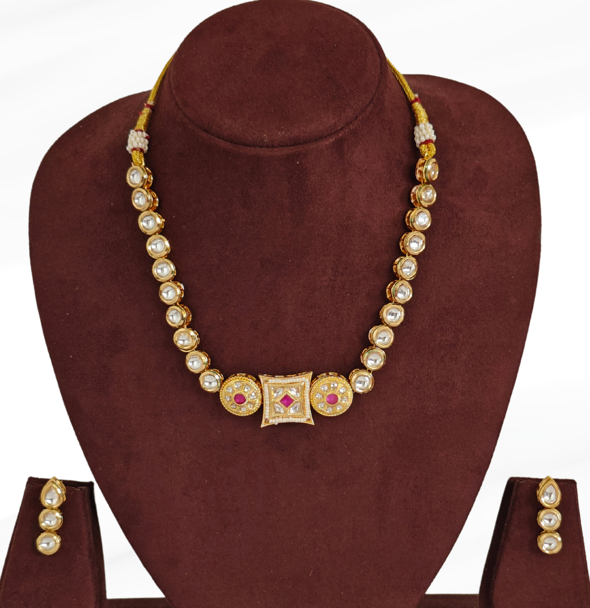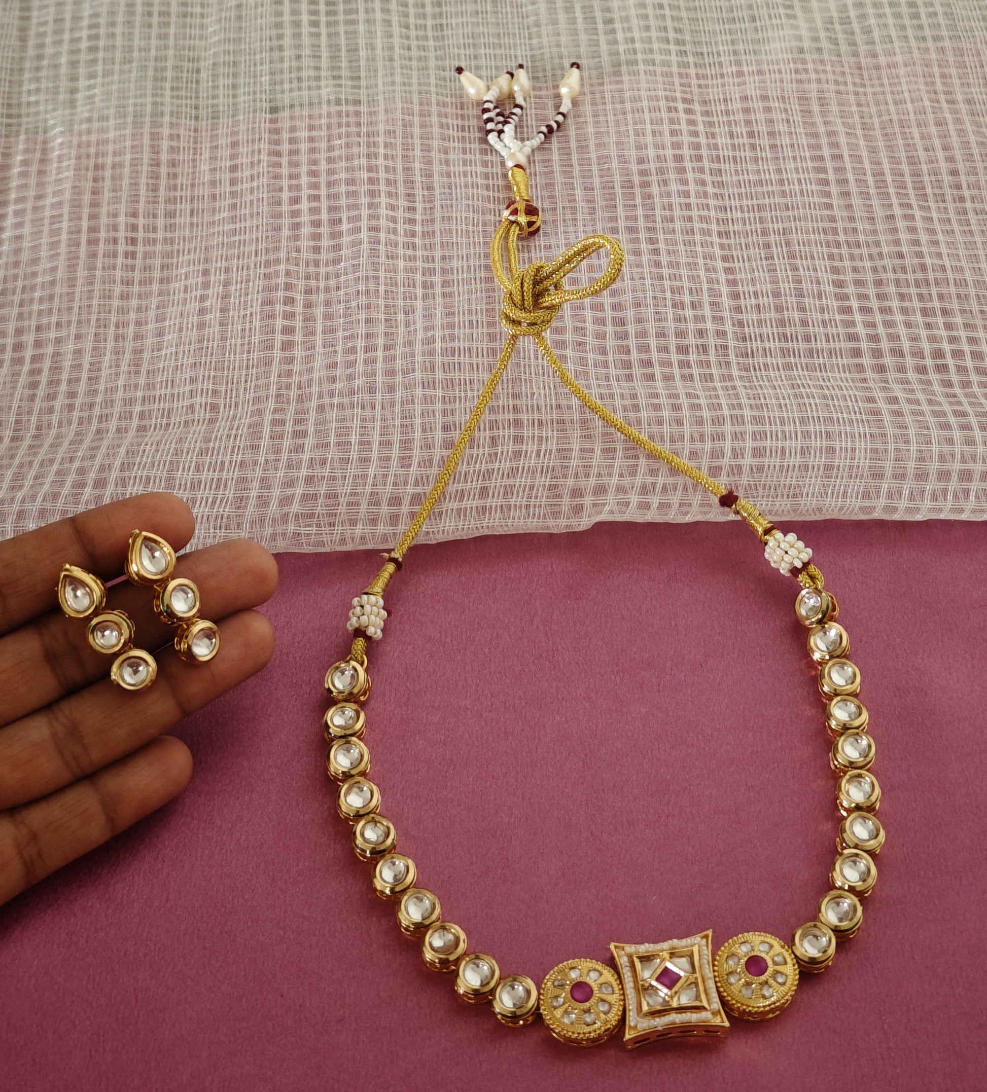 Elevate any occasion with our single-layered Kundan necklace set with meenakari work at the back. The colored embellishments make it look regal, giving a sense of grand luxury. This set makes you look elegant and can go well with sarees, dresses and other outfits for any occasion.