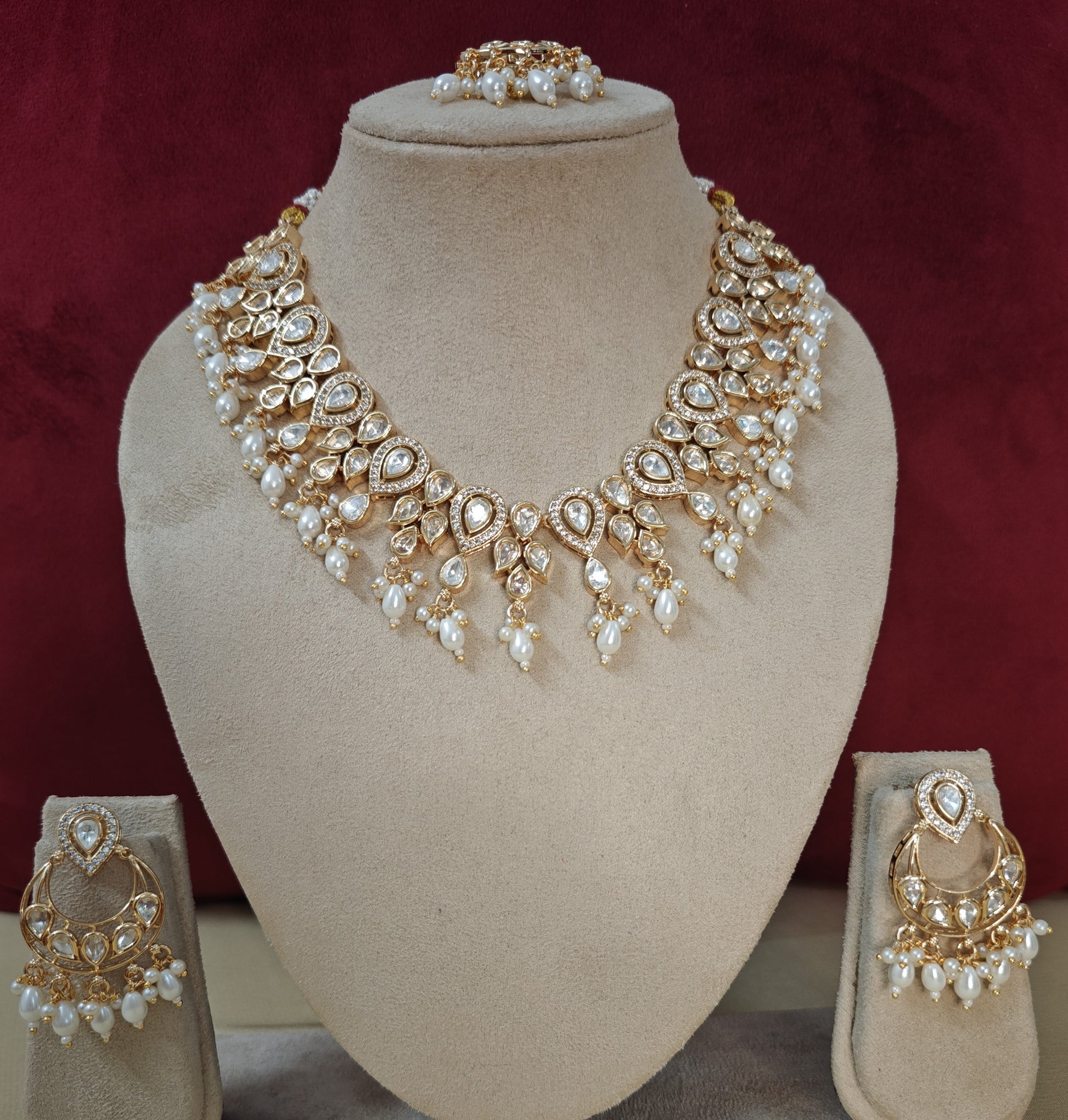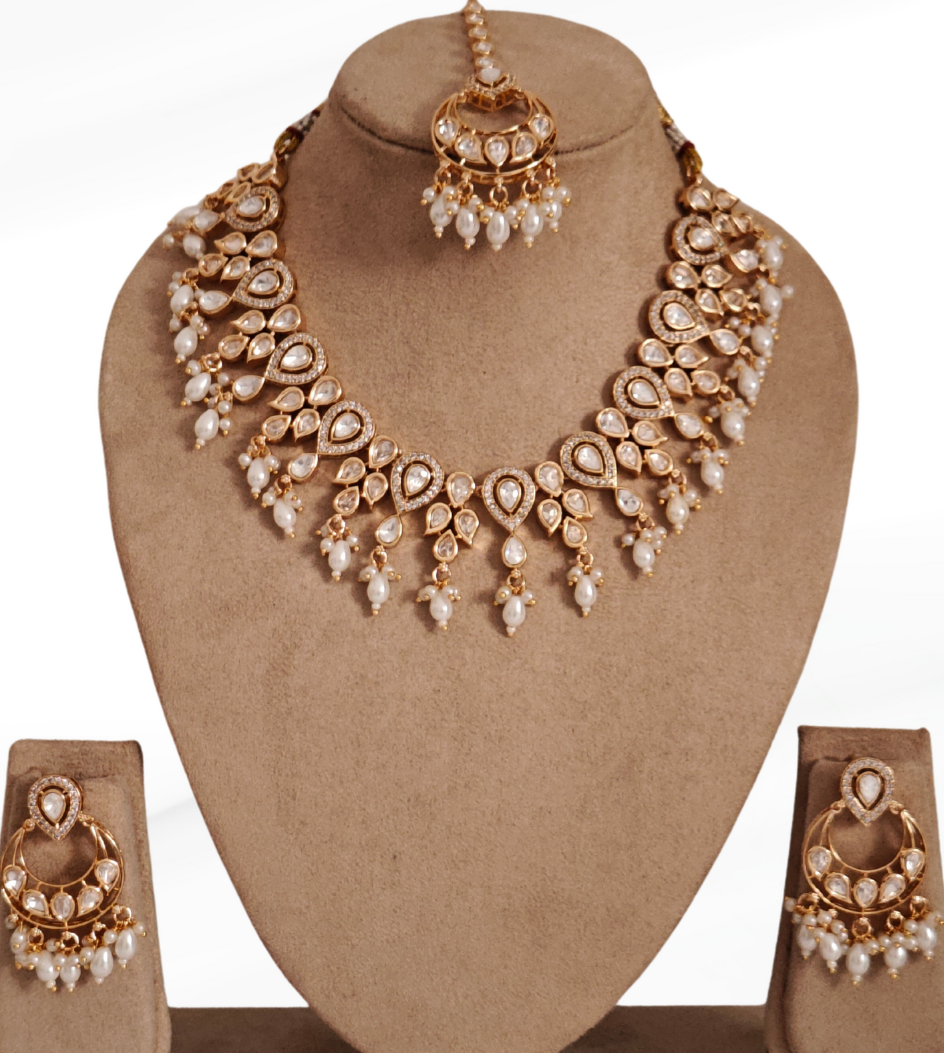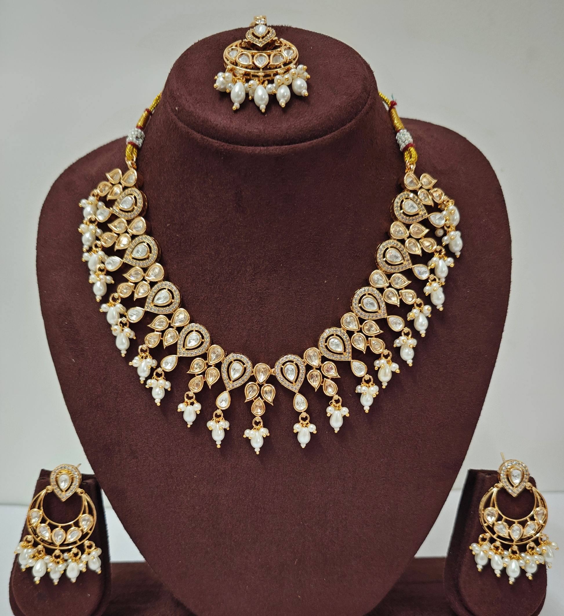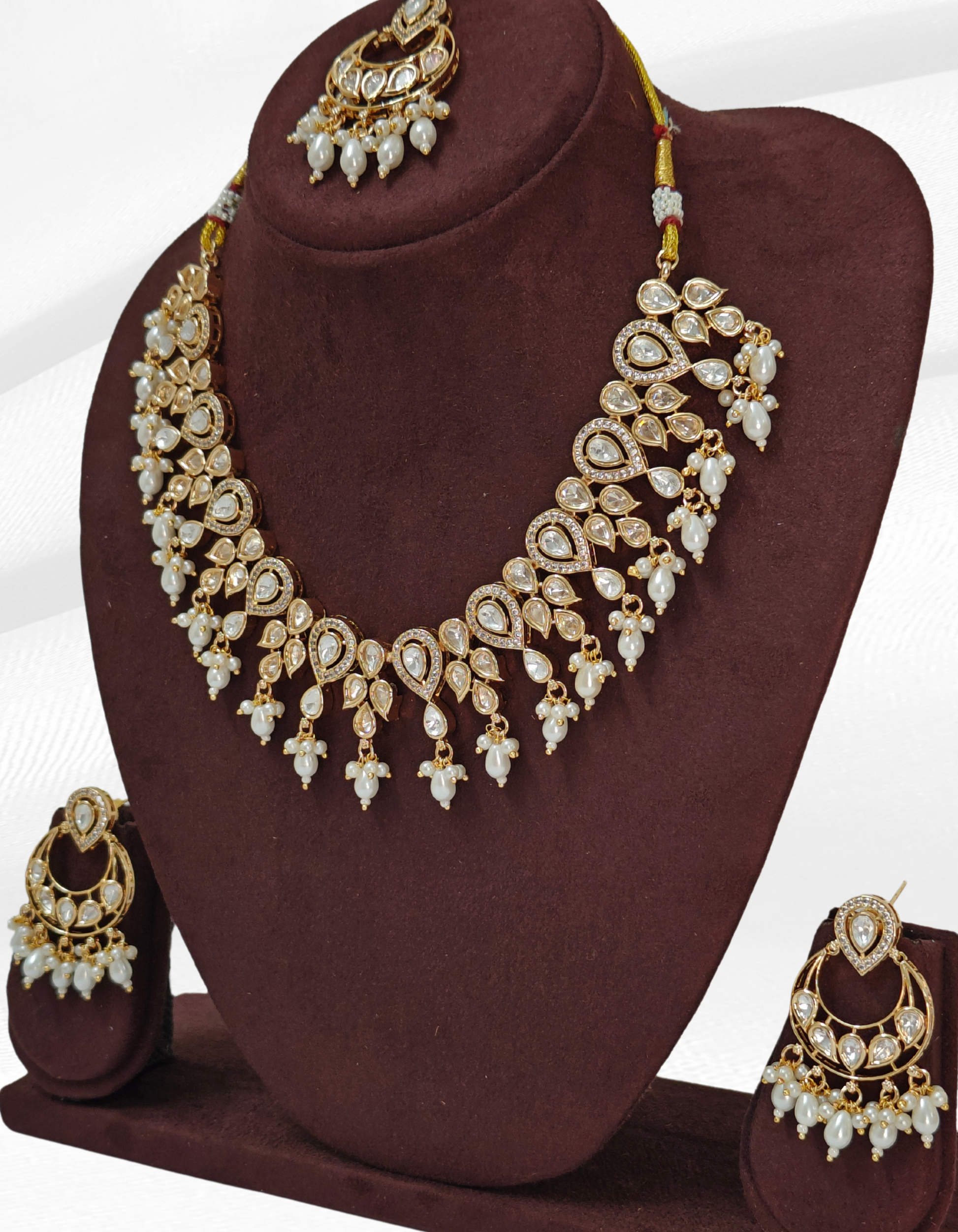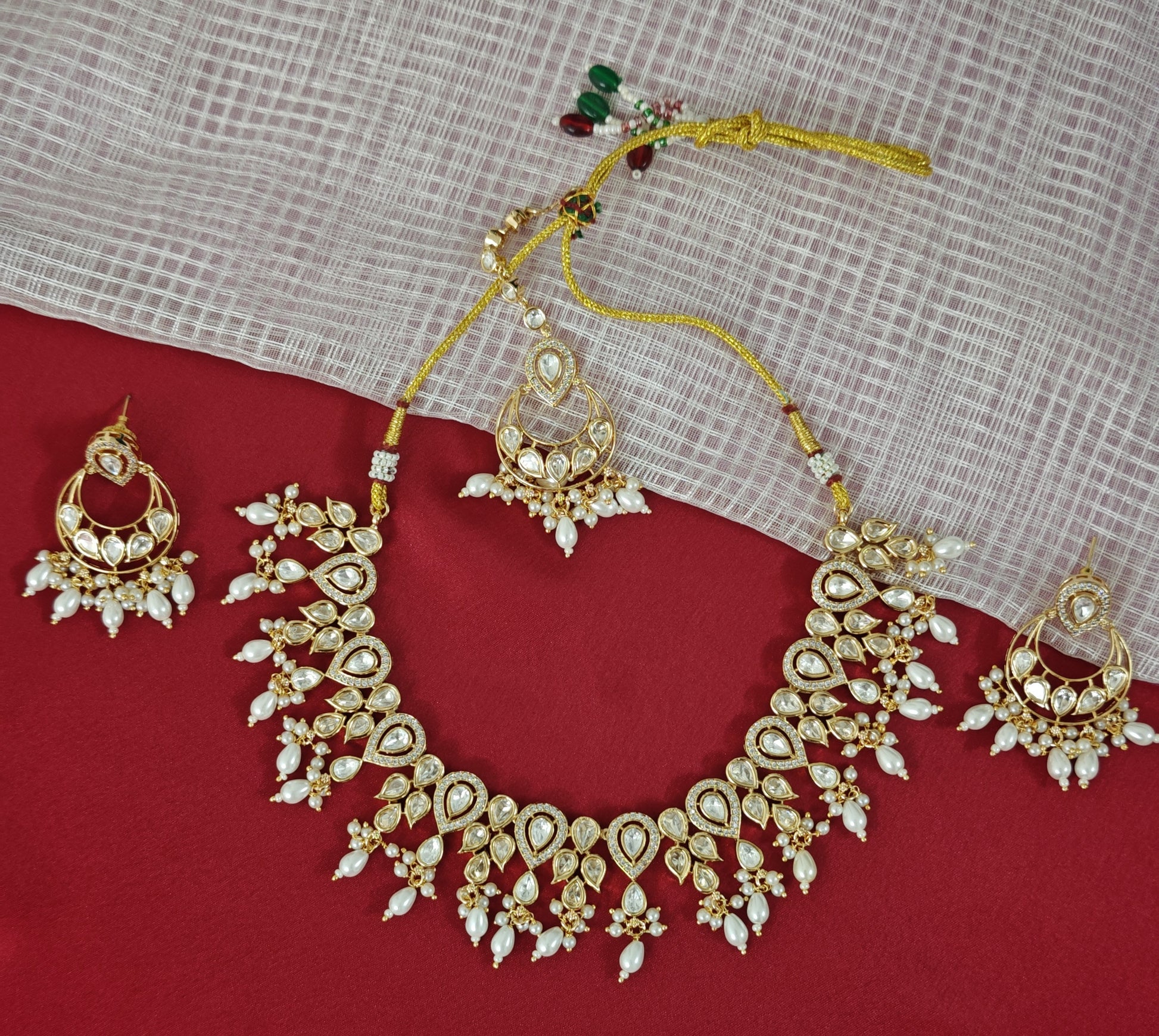 Elevate your elegance with our timeless Kundan necklace set, boasting unique design that dazzle and enchant. The flawless embedded zirconia stones, complemented by the colored accents, elevate its beauty to new heights, ensuring you shine with sophistication and grace wherever you go.